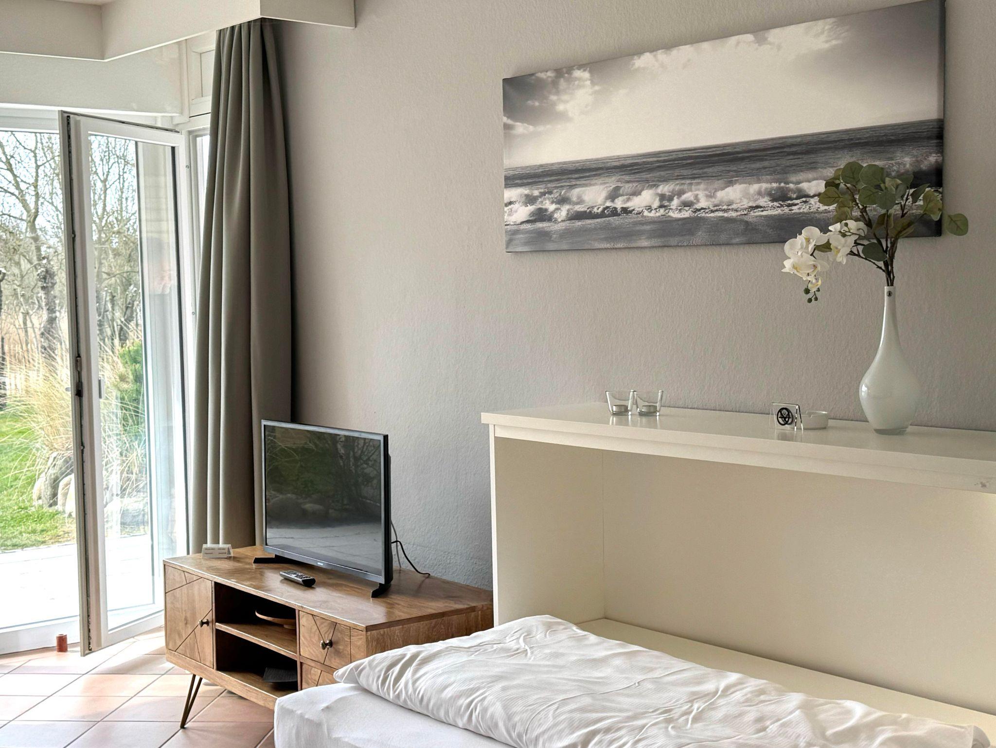 Eingangsbereich mit Garderobe, offener Wohnraum mit Essbereich und integrierten Einbauküche, Einzelschrankbett (90x200cm, Matratze ), direkter Zugang zur Südterrasse mit Gartenmöbeln und Strandkorb, von hier direkt in den Garten, Schlafzimmer mit Doppelbett (180x200cm,getrennte Matratzen), 1 Duschbad mit WC und Waschbecken.