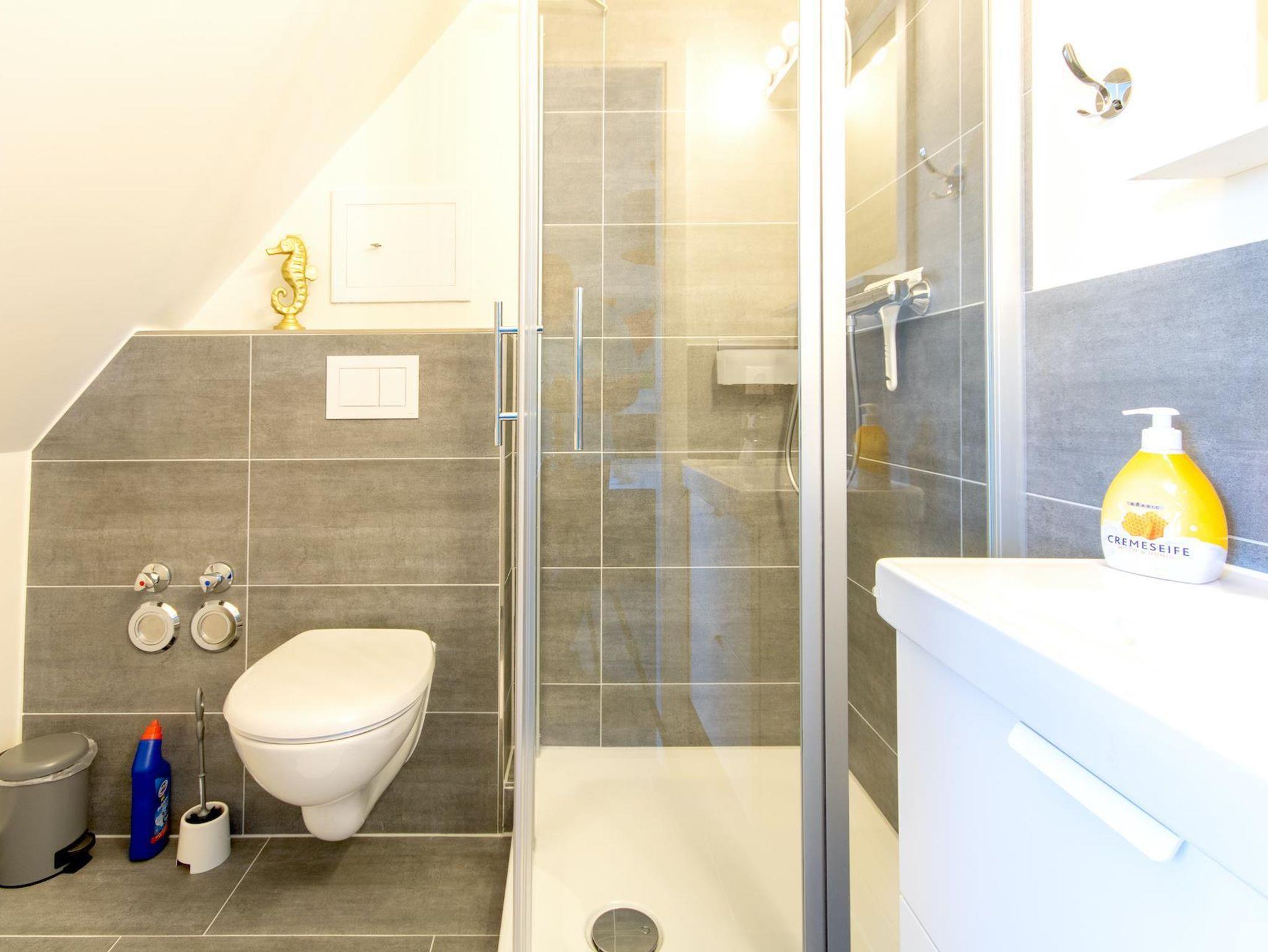 Die Ferienwohnung Meeresleuchten bietet Ihnen zwei helle Badezimmer mit Dusche und WC. Das eine Badezimmer ist direkt vom Doppelbettschlafzimmer zugänglich. Hier finden Sie zur sicheren Unterbringung Ihrer Wertsachen einen Safe.