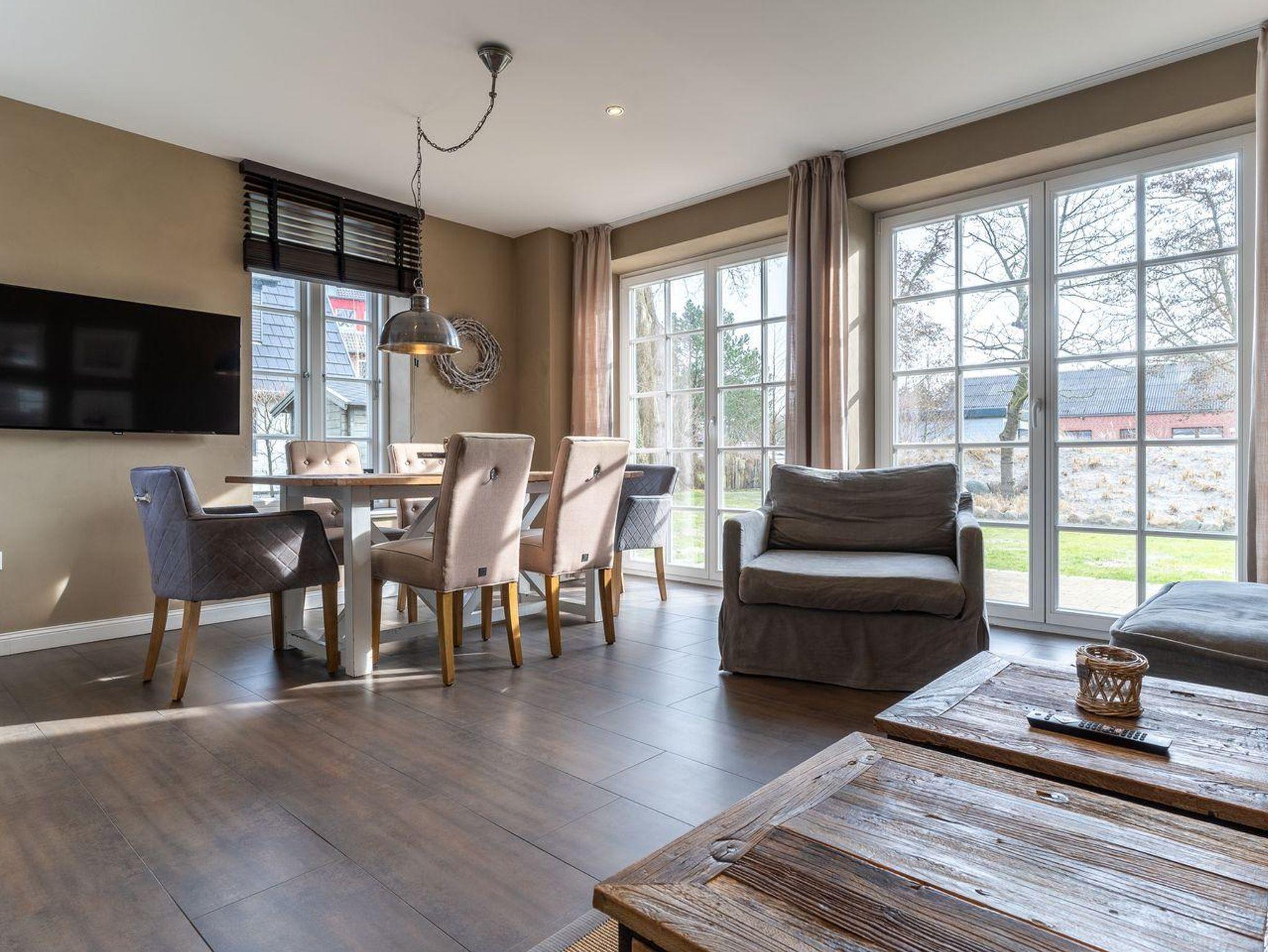Die luxuriöse Haushälfte unter Reet verfügt über ca. 108 m² Wohnfläche und bietet Platz für 6 Personen. Im Erdgeschoss befindet sich der lichtdurchflutete Wohnraum mit TV, Kamin, einer offenen Küche sowie einem stilvollen Essbereich. Die Wohnräume sind mit exklusiven Möbeln von Riviera Maison ausgestattet. Die Küche verfügt über hochwertige Elektrogeräte. An den Wohnbereich schließen sich ein Flur mit eingebauter Garderobe, ein Hauswirtschaftsraum und ein Duschbad an. Das gesamte Erdgeschoss verfügt über geschmackvolle Fußbodenfliesen, die über eine Fußbodenheizung (Erdwärme) beheizt werden können. Über eine Holztreppe gelangt man in das mit Parkett ausgelegte Obergeschoss. Dieses verfügt ebenfalls über eine Fußbodenheizung. Die beiden Schlafzimmer, eines mit einem Boxspring-Doppelbett und eines mit 2 Boxspring-Einzelbetten, sind ebenfalls jeweils mit TV ausgestattet. Einbauschränke gewähren Ihnen hinreichend Ablageflächen. Darüber hinaus befindet sich im Obergeschoss ein weiteres, geräumiges Bad mit Dusche und Badewanne. Vom Obergeschoss führt die Holztreppe hinauf in das Dachgeschoss. Hier befindet sich ein zusätzliches Schlafzimmer mit 2 Boxspring-Einzelbetten, die zum Doppelbett zusammen geschoben werden können. Dieses wunderschöne Haus lässt keine Wünsche offen und bringt Sie sofort in Urlaubsstimmung. Das Grundstück mit Stellplatz, großer Rasenfläche und einer geschützten, sonnigen Terrasse ist mit heimischen Pflanzen und einer Düne angelegt. Aus einem Strandkorb können Sie den Blick auf das Haus oder die Düne genießen. Für zusätzliche Entspannung sorgt eine großzügige Gartensauna. Carpe Diem!