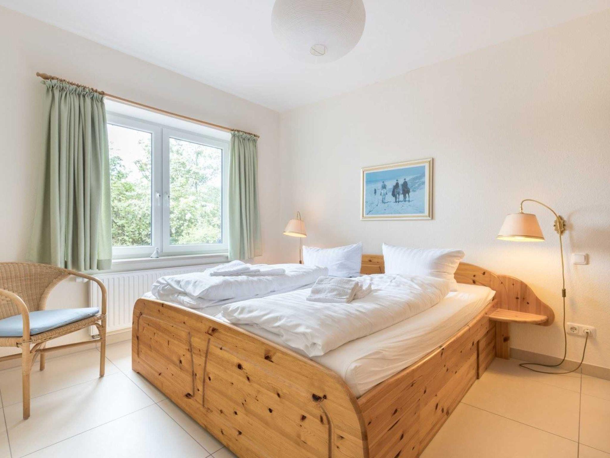 1. Schlafzimmer mit Doppelbett (2x 90x200cm), Kleiderschrank und Korbsessel.