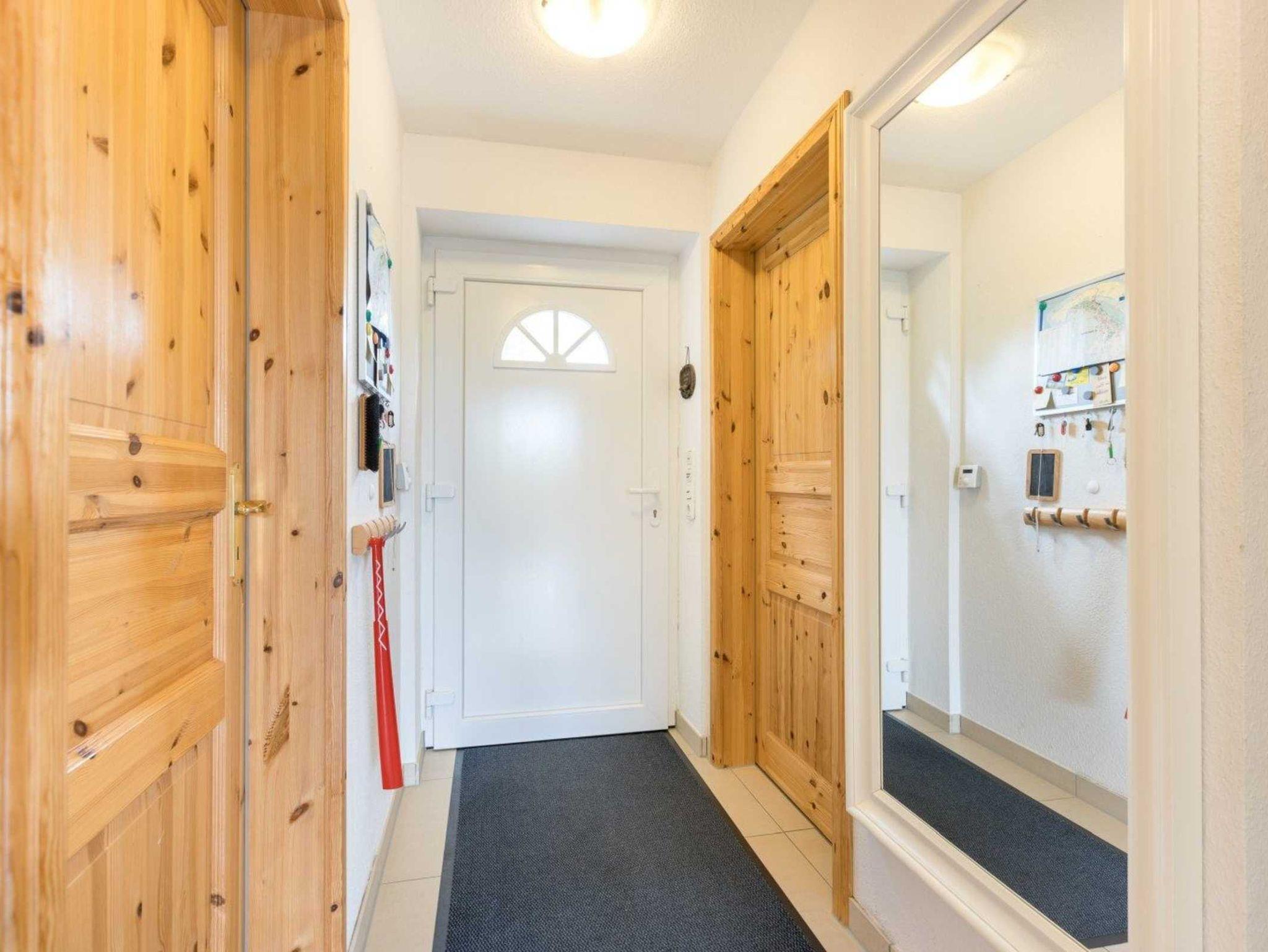 Flur mit Garderobe, Schuhablage und Spiegel im Eingangsbereich. Haushaltsschrank mit Staubsauger.
