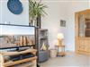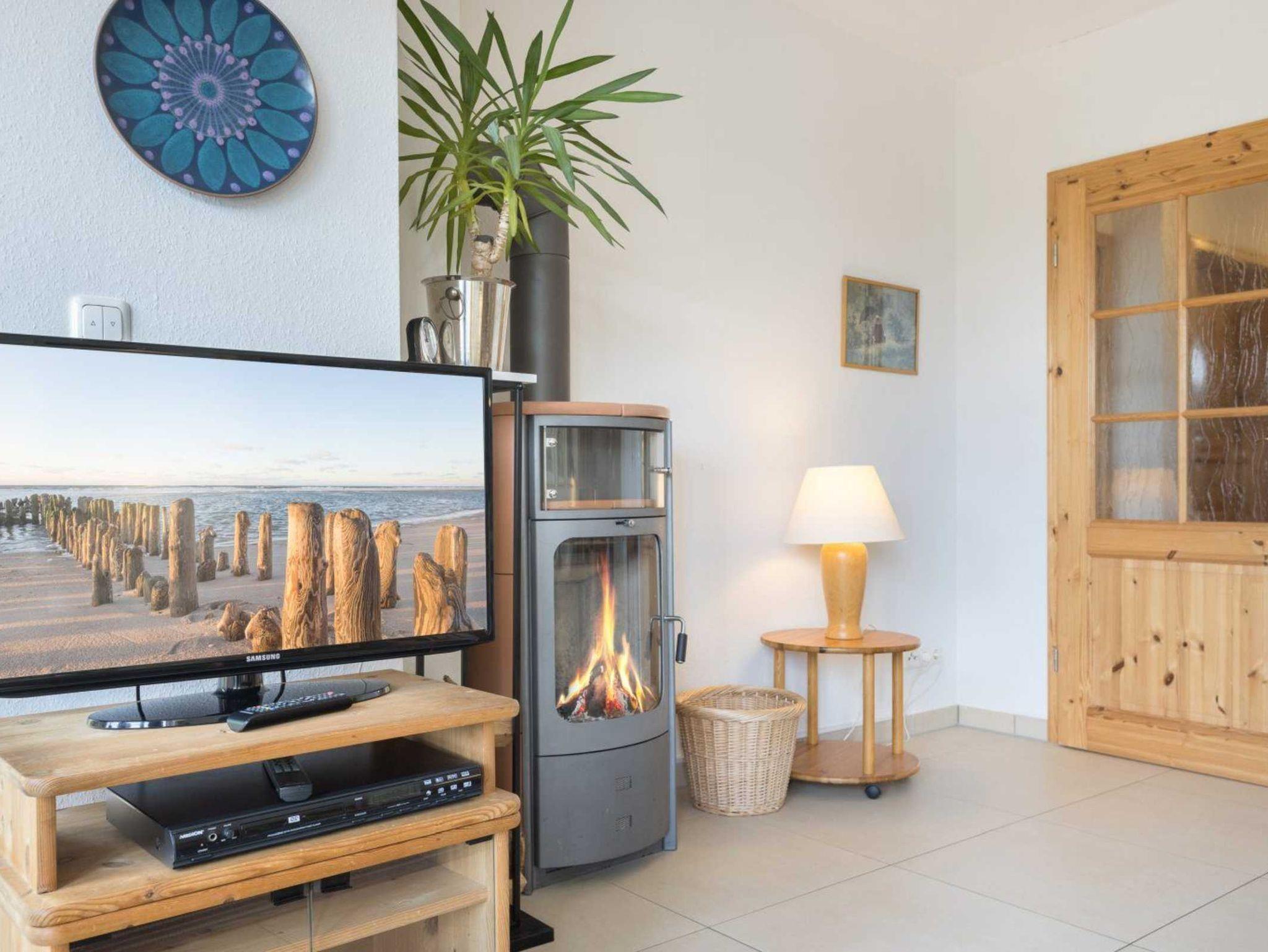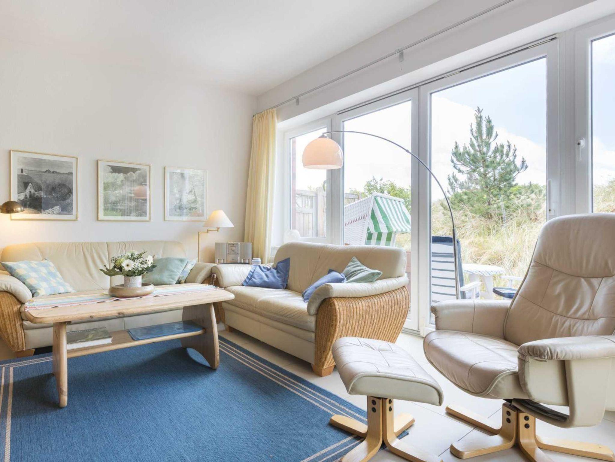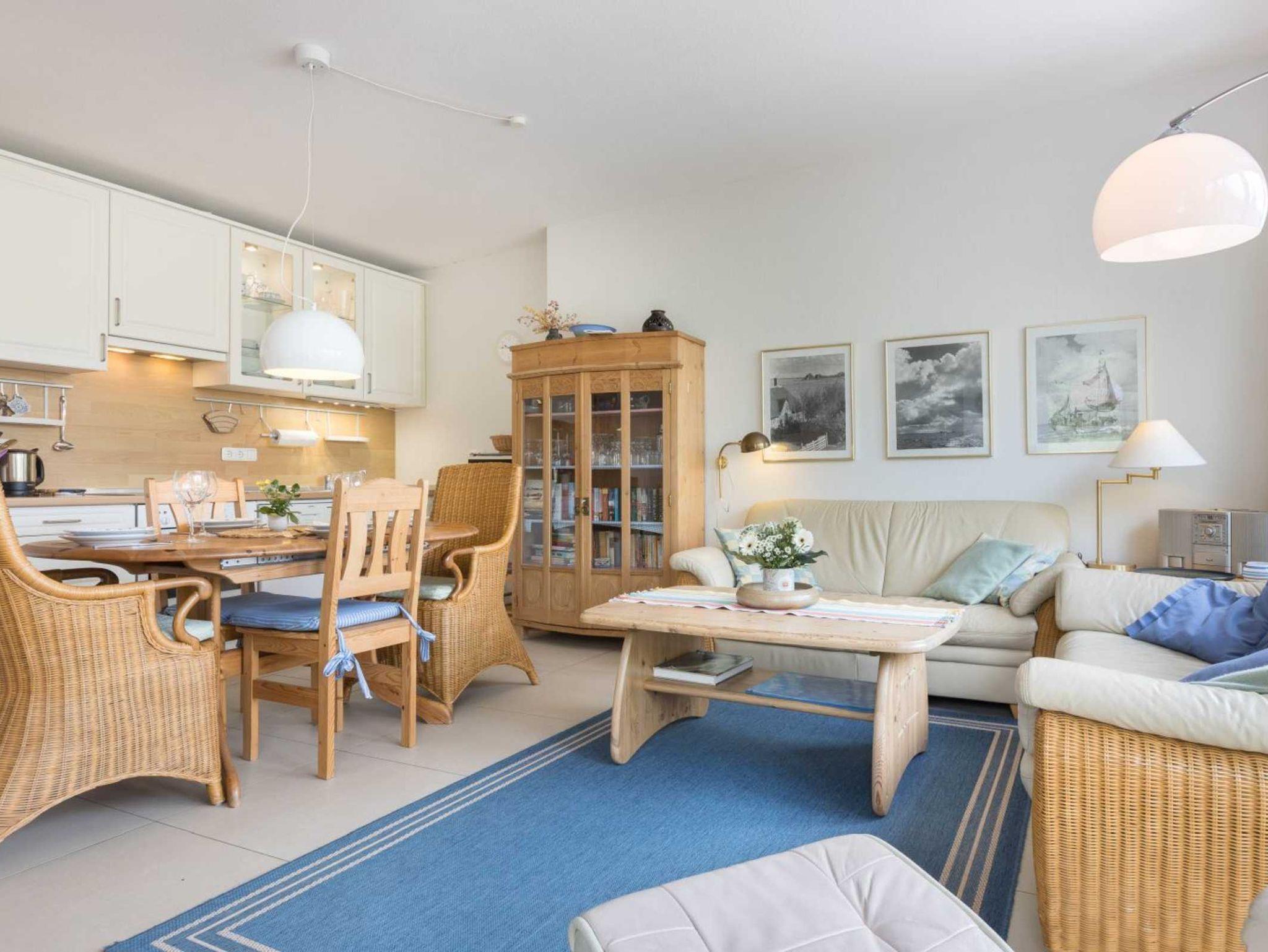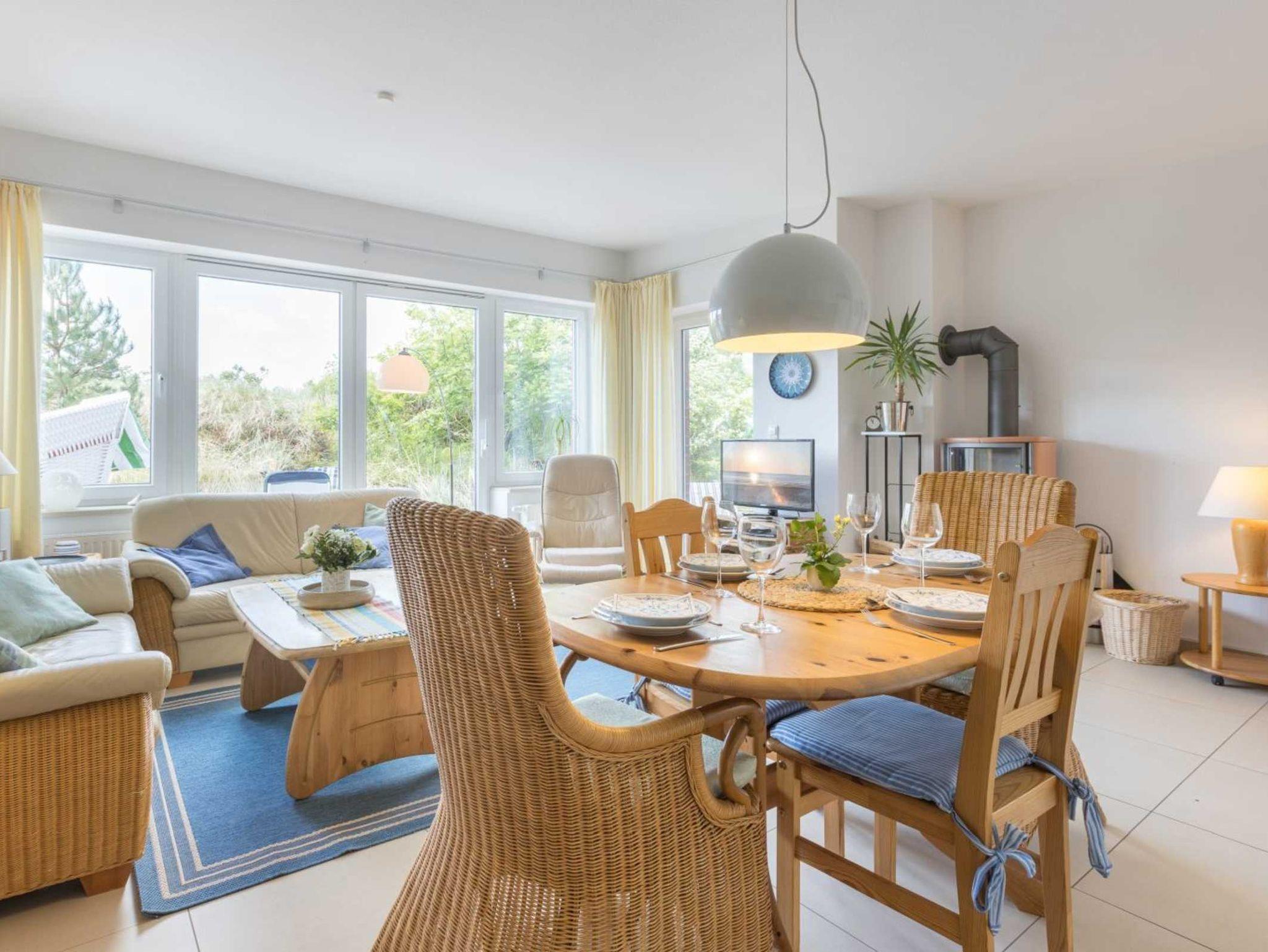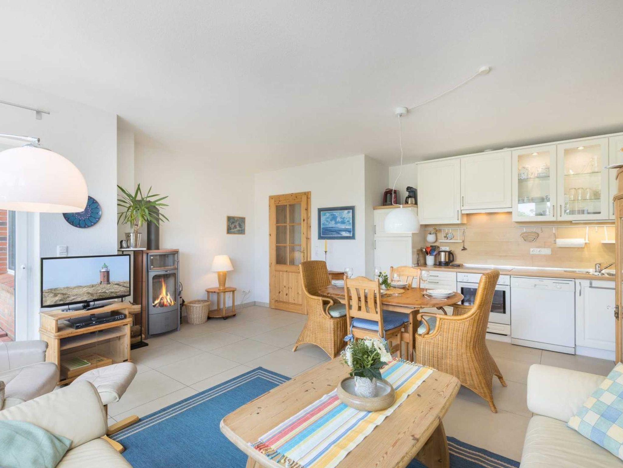 Wohnzimmer mit zwei Sofas, einem Relaxsessel, TV (Sat), DVD-Player, Stereo-Kompaktanlage und Esstisch für 4 Personen. Der Kaminofen spendet behagliche Wärme auch im Winter. Direkter Zugang zur möblierten Garten-Terrasse nach Südwesten mit Strandkorb. Offene Küche mit Backofen, Mikrowelle, Geschirrspüler und Kühlschrank mit Gefrierfach.