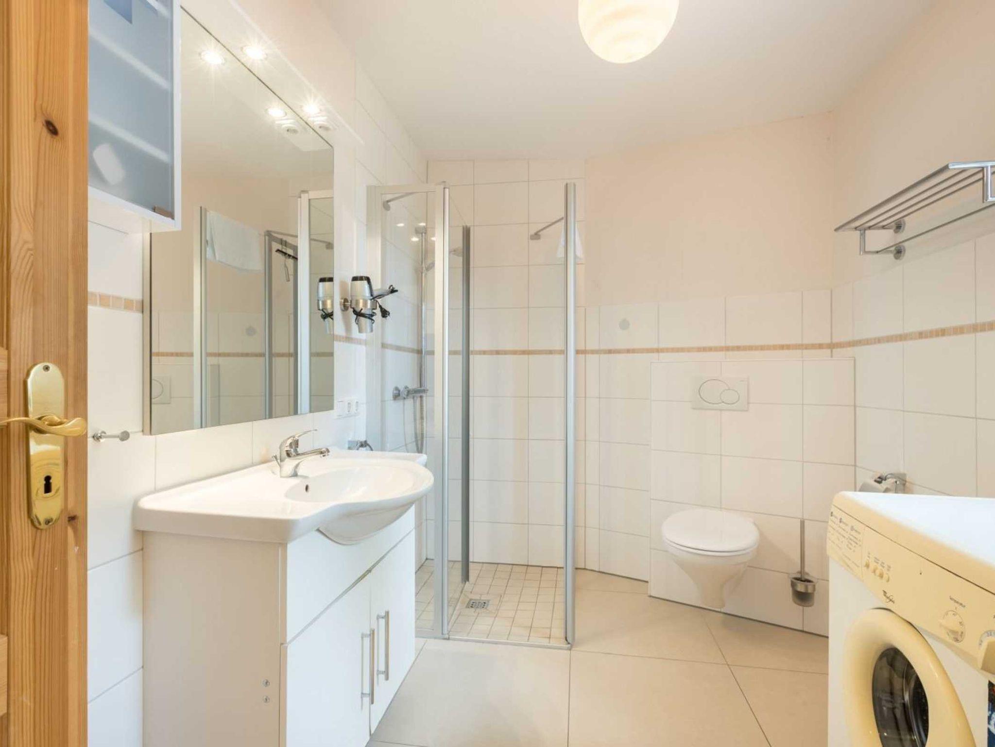 Badezimmer (Duschbad) mit bodengleicher Dusche, WC, Handtuchwärmer, Waschmaschine, Föhn und Tageslicht.