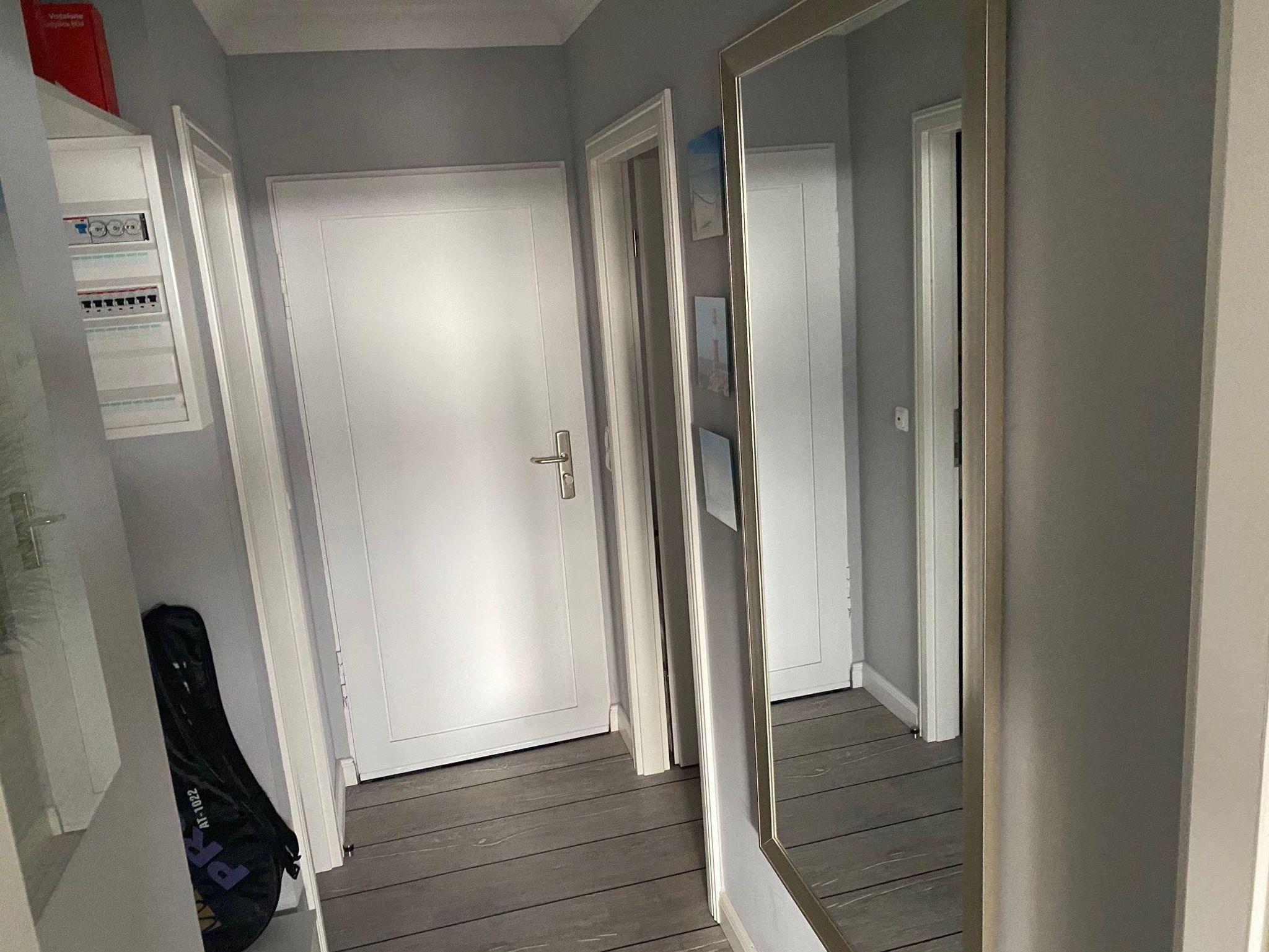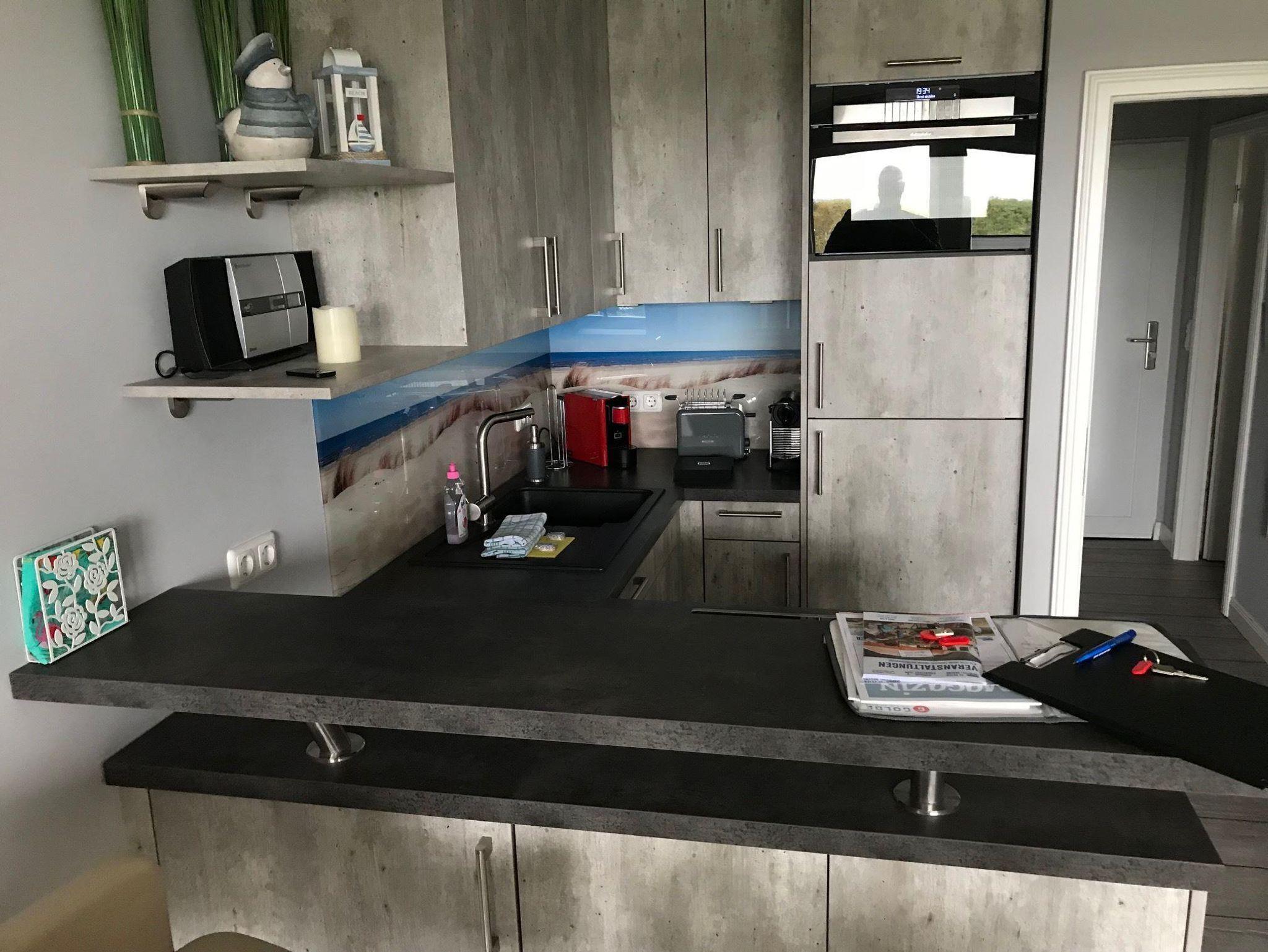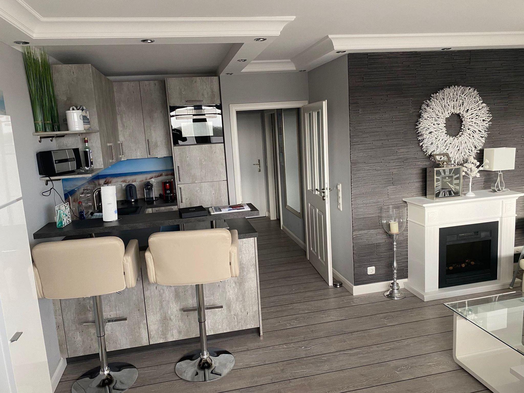 Kostenfreier Internetzugang (WLAN), Flur mit Garderobe. Gemütliches Wohn-Esszimmer mit offener Wohnküche, Sitzbereich mit hochwertigem Schlafsofa u. elektrischem Kamin. Großzügige Küchentheke mit zwei Barhockern, komplett ausgestattet u. a. mit einer Geschirrspülmaschine, einem Kühlschrank mit Gefrieraufsatz sowie einem Toaster, einem Backofen (in 1.90m Höhe) u. einer Kaffeemaschine (+ Kapselmaschine). Das Schlafzimmer ist mit einem 180er Doppelbett u. Flatscreen TV eingerichtet. Modernes Duschbad mit WC, Waschbecken u. Spiegel.