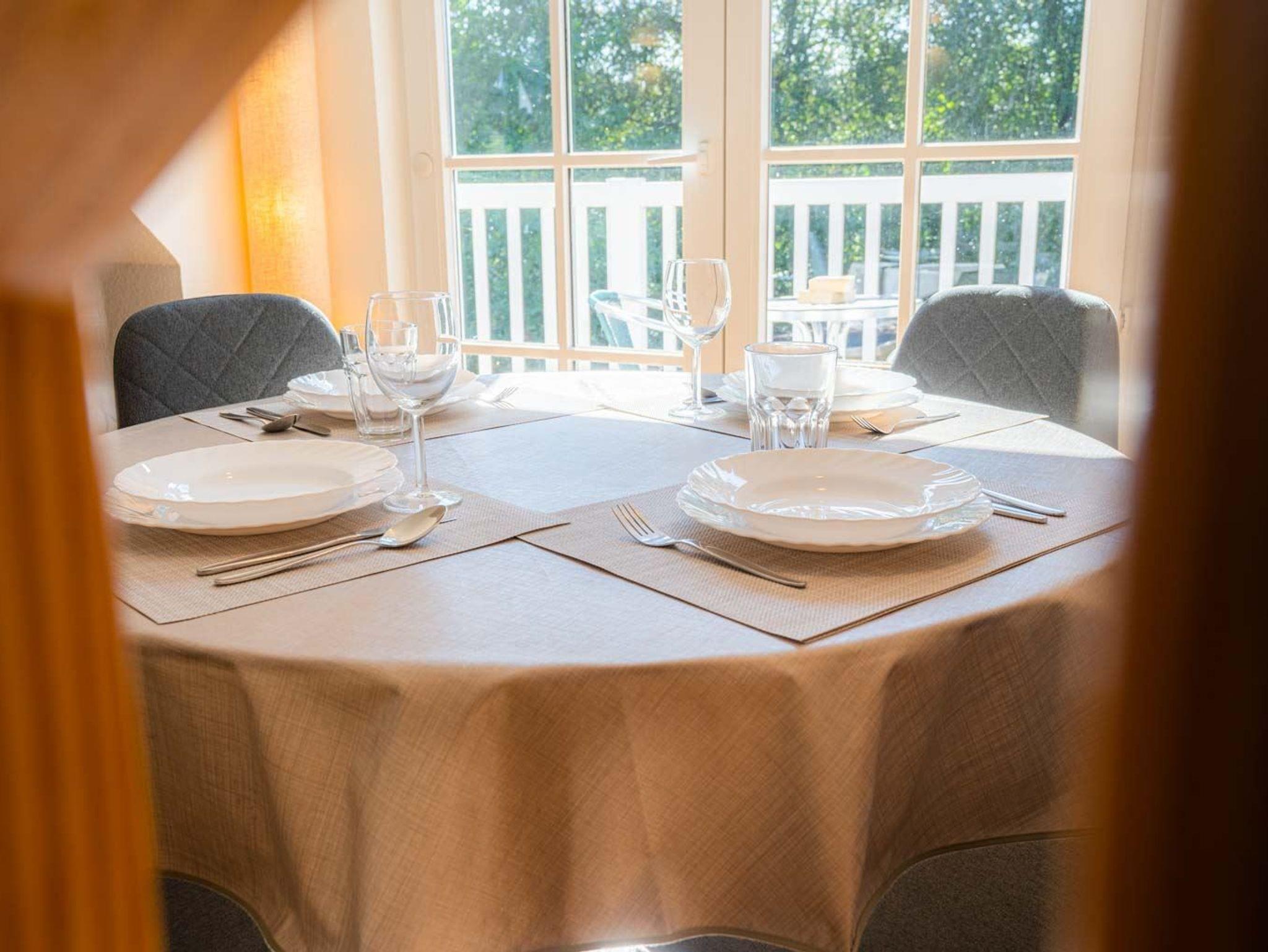 Wohnzimmer mit großem Ecksofa für 3-4 Personen, Sessel, TV (Sat), BluRay-Player, Radio mit CD-Player und Esstisch mit 5 Stühlen. Treppe zum DG. Direkter Zugang zum möblierten Balkon nach Westen zur Seeseite.