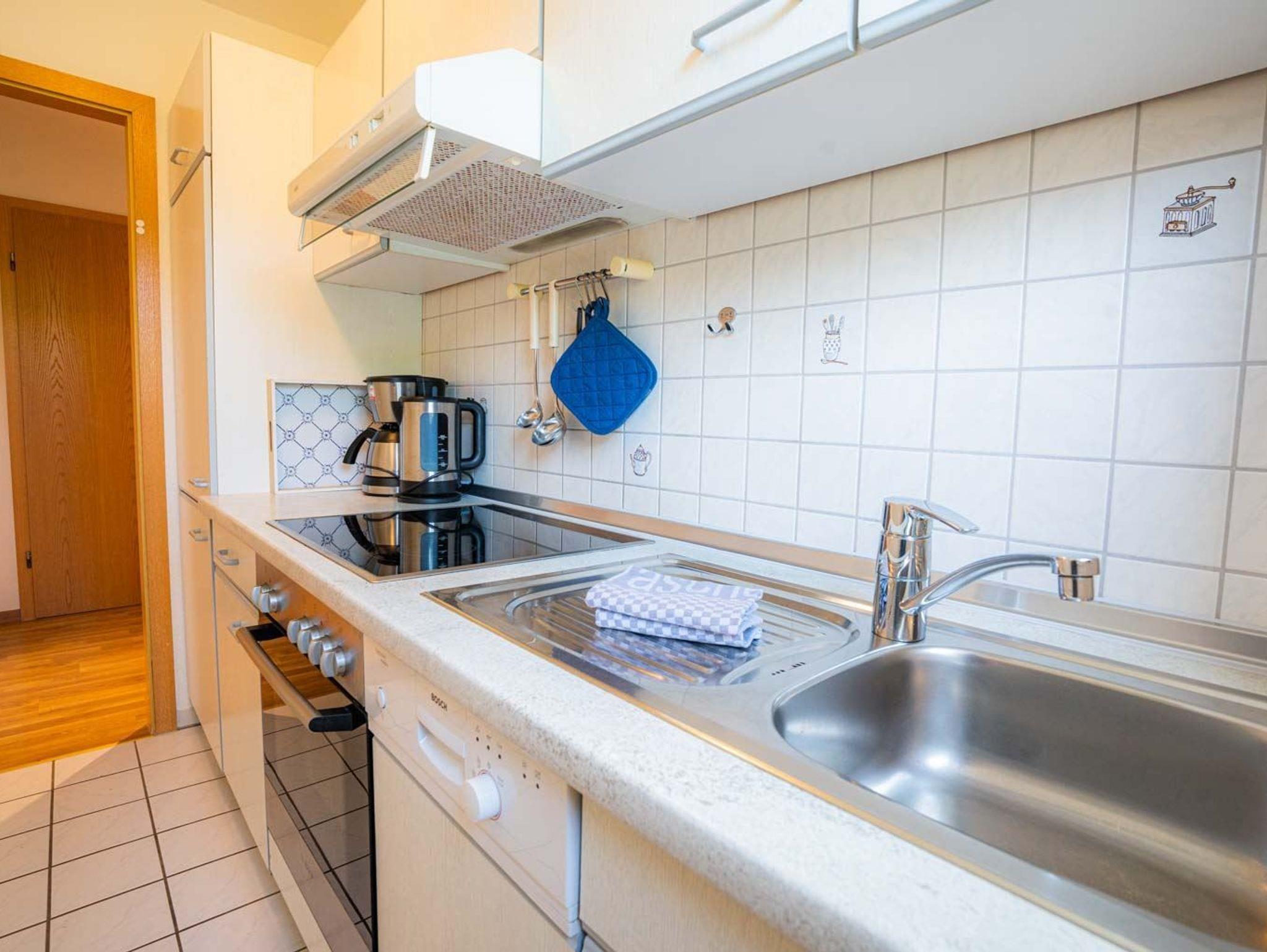 Separate Küche mit Backofen, Geschirrspüler und Kühlschrank mit Gefrierfach.