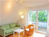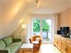 Wohnzimmer mit Sofa für 2 Personen, Korbsessel, Esstisch mit 4 Stühlen, SMART-TV (Sat) und Stereo-Kompaktanlage. Direkter Zugang zum möblierten Balkon nach Westen. Offene Küche mit Backofen, Geschirrspüler und Kühlschrank mit Gefrierfach.