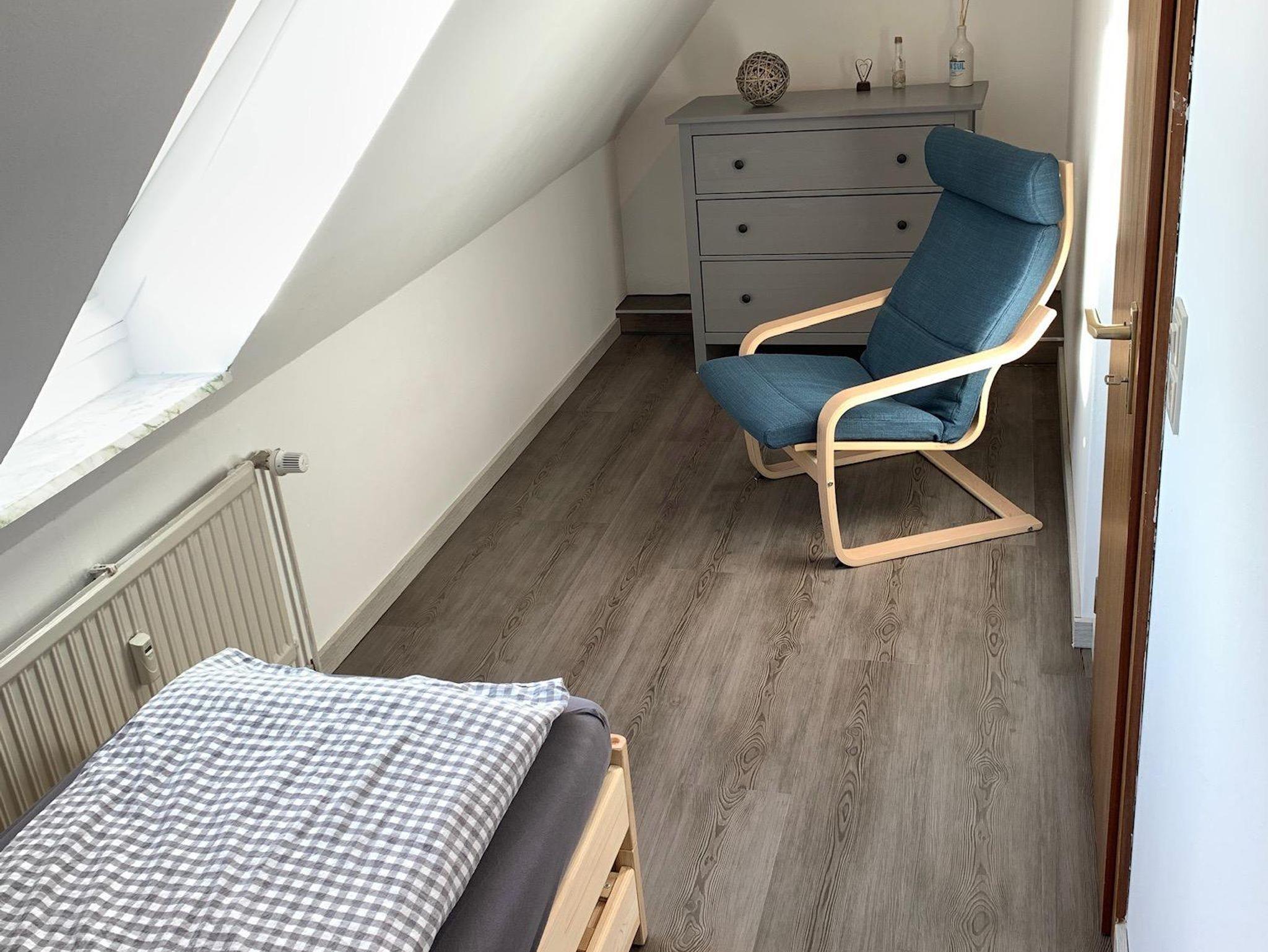 Diese gemütliche 55 qm Dachgeschoß- Maisonettewohnung, besteht aus einem Wohn-/Essbereich, einer separaten neuen Küche mit 4-Plattenherd, Backofen mit integrierter Mikrowelle, Kühlschrank, Geschirrspülmaschine, Toaster, Kaffeemaschine und Wasserkocher, sowie einem Duschbad mit Fenster.
