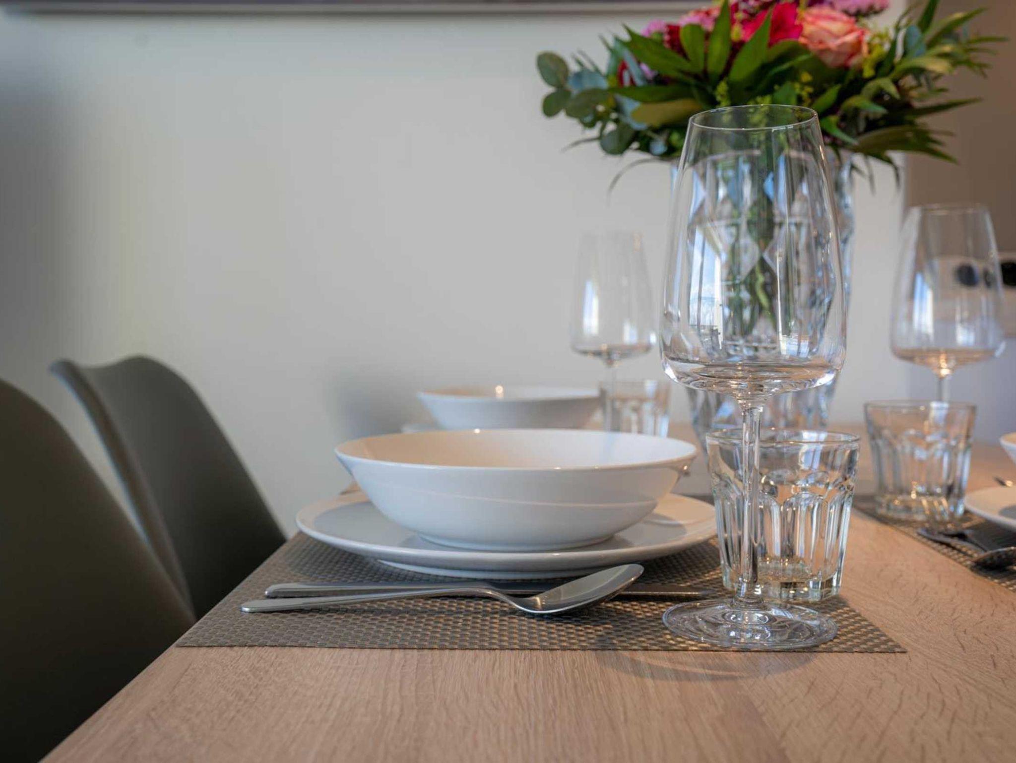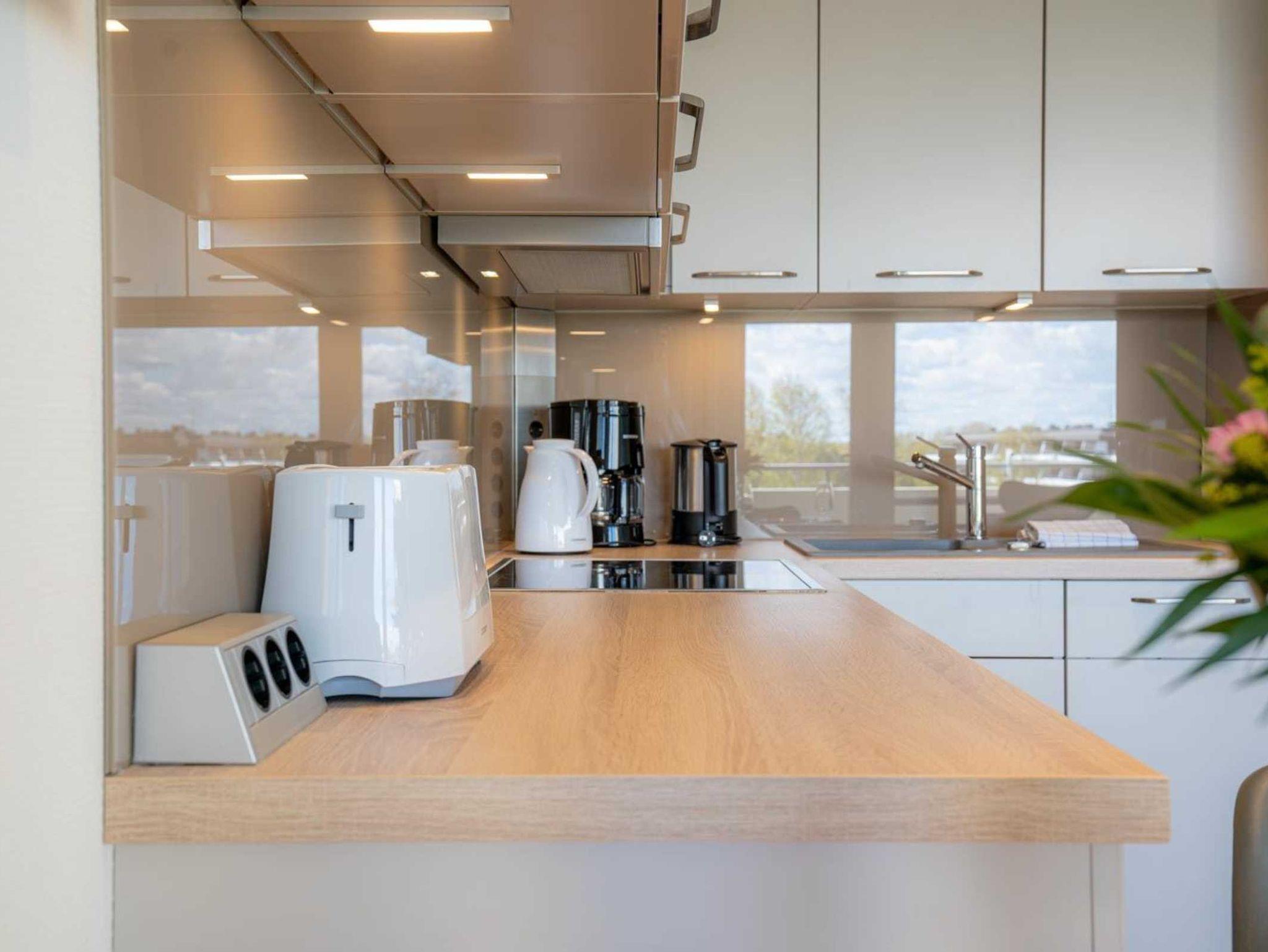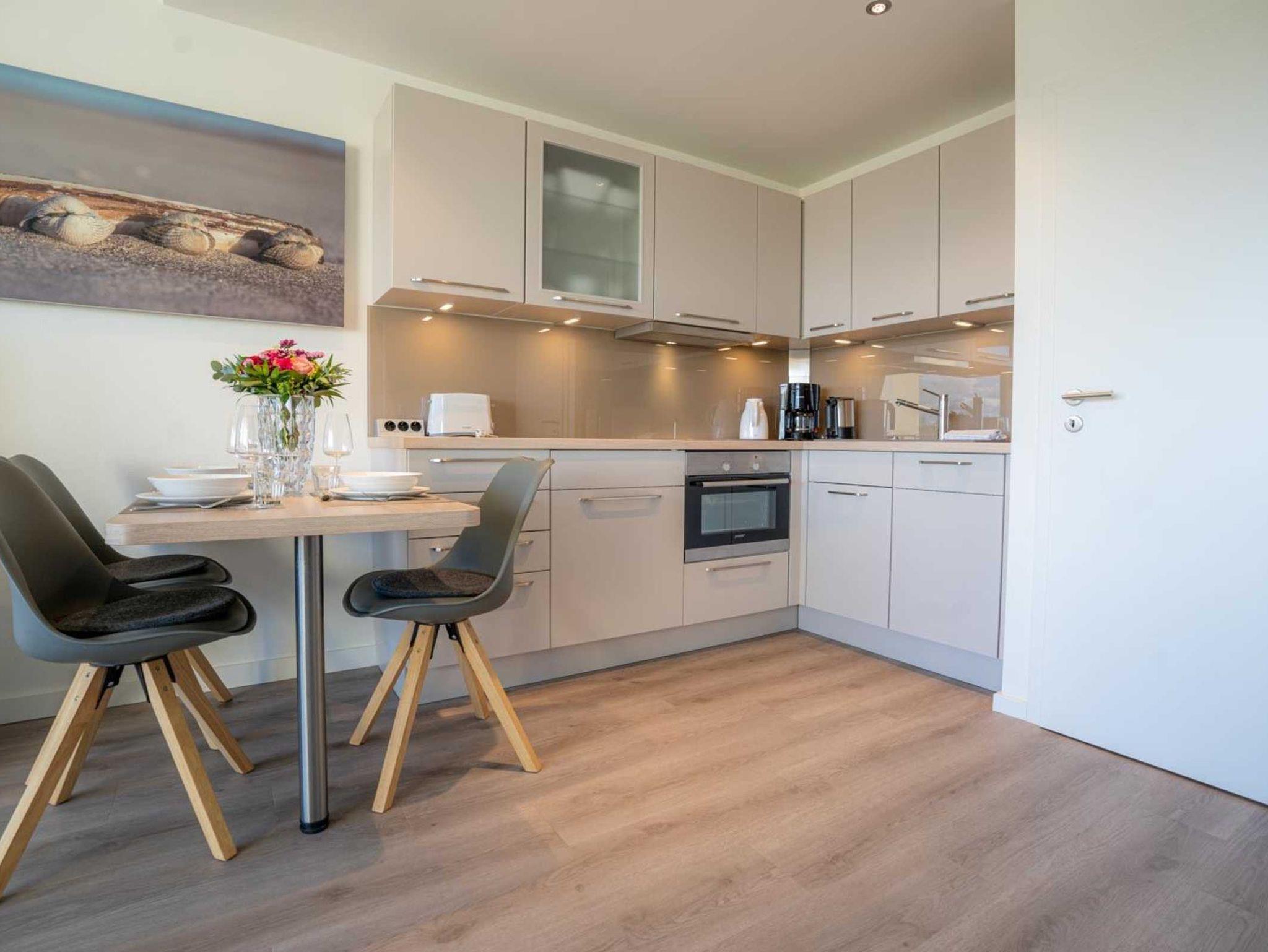 Wohnzimmer mit ausziehbarem Schlafsofa (160x195cm, mit Lattenrost und Matratze), Einbauschrank, großem TV (Sat) und Stereo-Kompaktanlage. Direkter Zugang zum möblierten Balkon nach Südosten mit Blick ins Grüne. Offene Küche mit Induktionsherd, Backofen, Kühlschrank mit Gefrierfach, Geschirrspüler und Esstisch für 4 Personen.