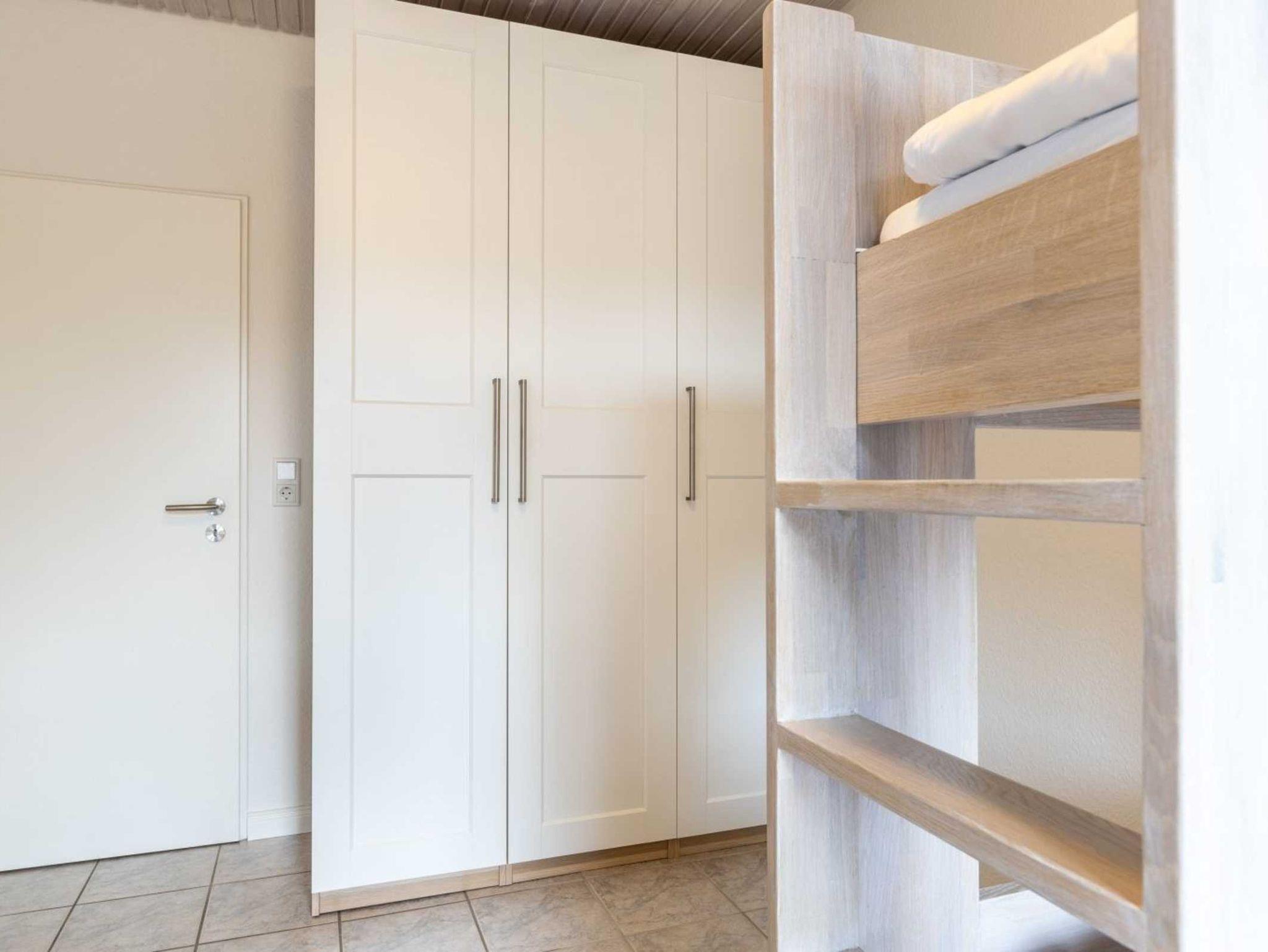 2. Schlafzimmer mit Einzelbett (90x200cm), 2 Etagen-Einzelbetten (je 90x200cm) und Kleiderschrank.