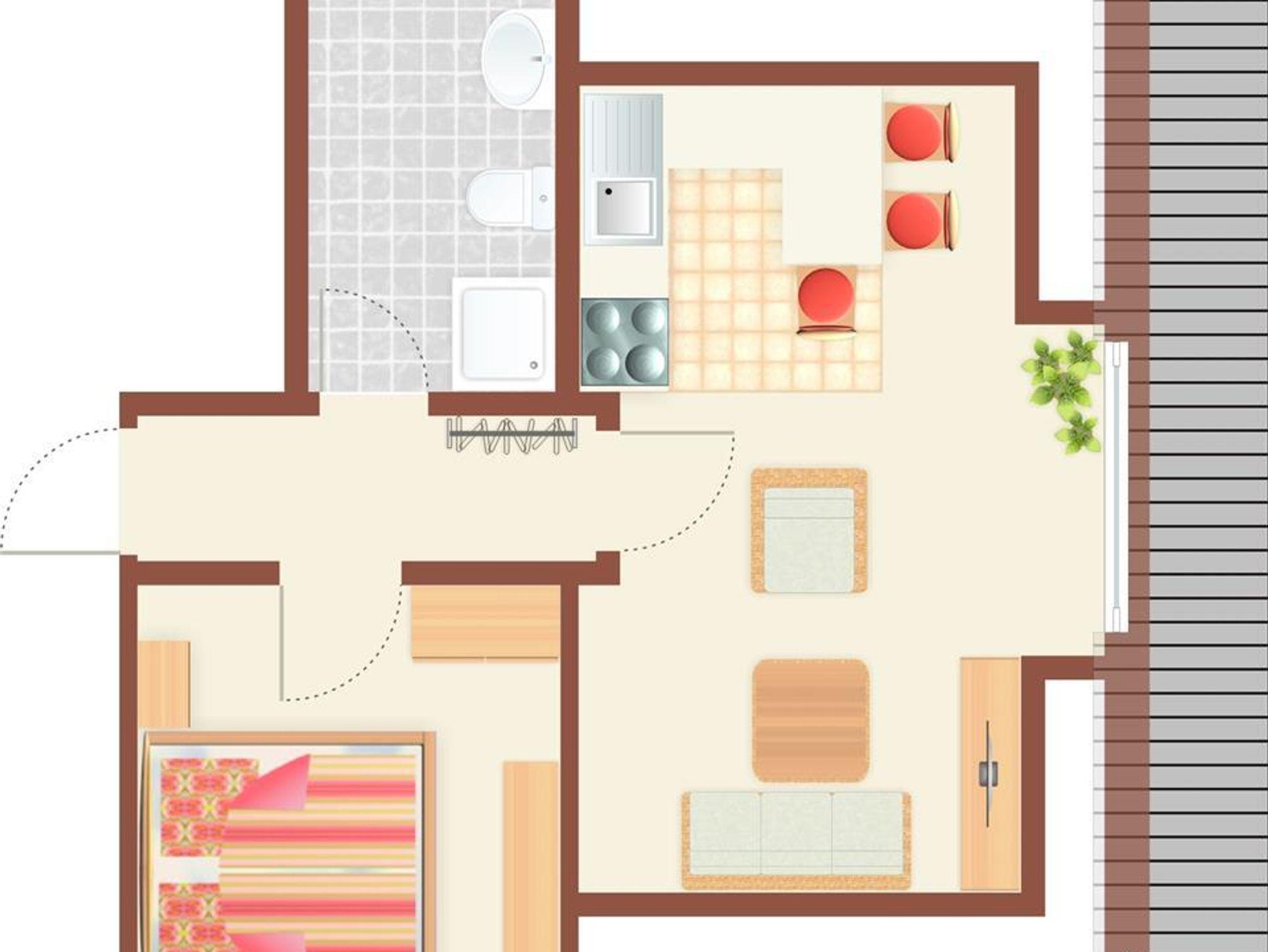 1 Schlafraum mit Doppelbett, Dusche/WC. , Balkon mit Balkonmöbeln. Behaglich eingerichtet.