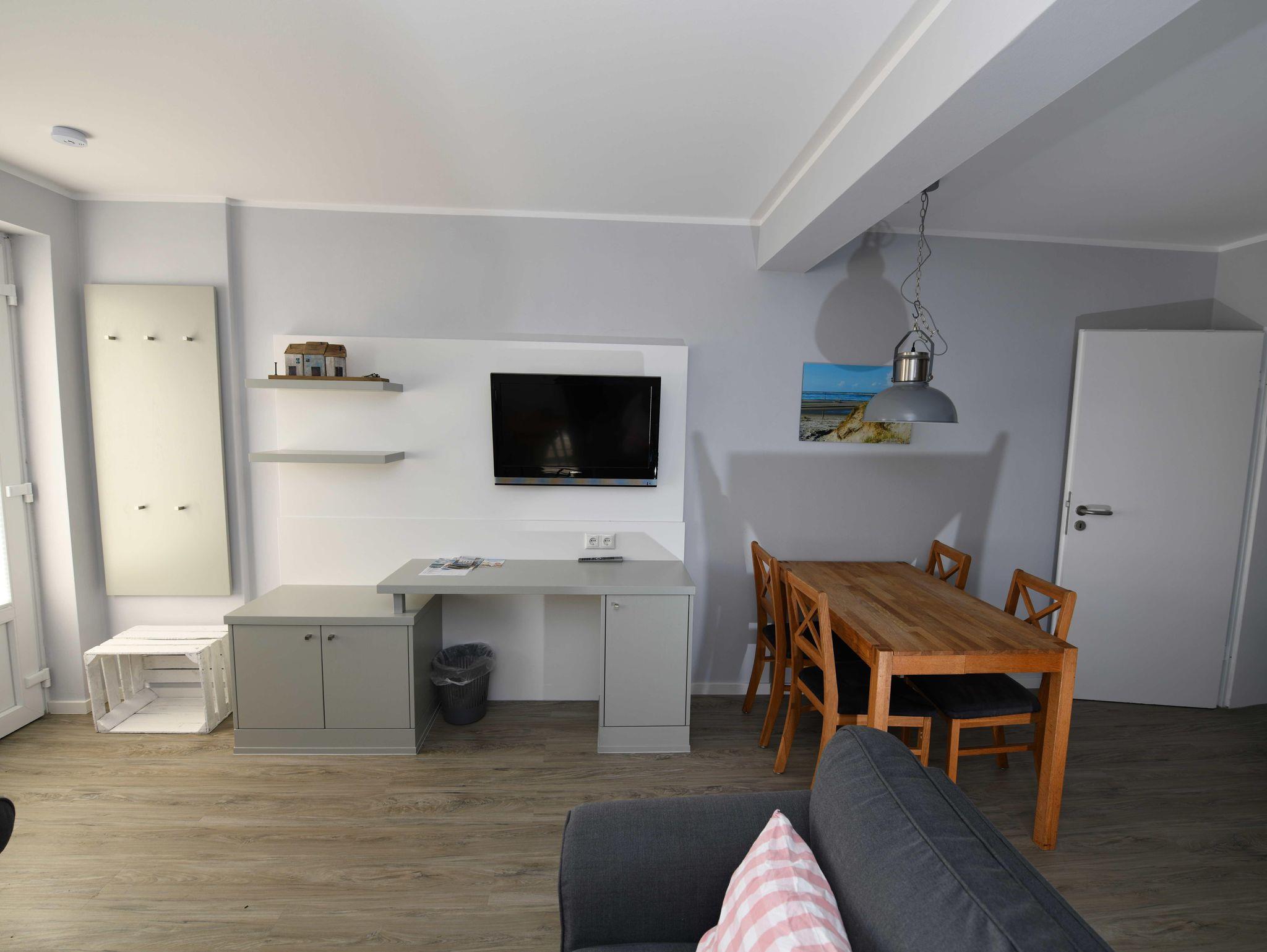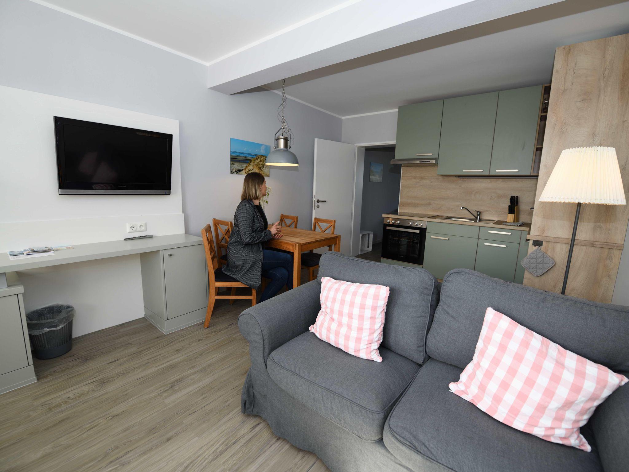 - Wohnzimmer mit vollausgestattete Küchenzeile (Herd, Backofen, Spülmaschine, Kühlschrank, Kaffeemaschine, Toaster und Wasserkocher)