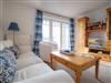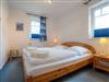 Schlafzimmer mit Doppelbett (2x 90x200cm), Kleiderschrank, Hocker und Verdunklungsplissee.