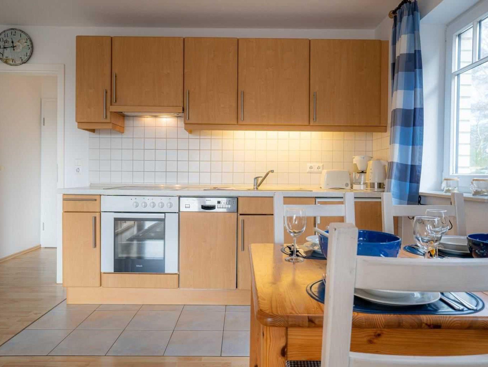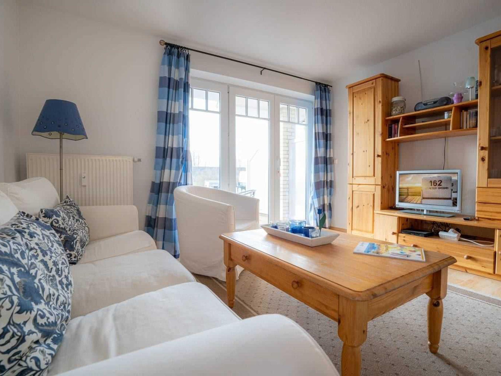 Wohnzimmer mit Sofa, 1 Sessel, TV (Sat), DVD-Player, Radio mit CD-Player und Esstisch mit 4 Stühlen. Direkter Zugang zur windgeschützten, möblierten Terrasse nach Süden. Offene Küche mit Backofen, Geschirrspüler und Kühlschrank mit Gefrierfach.