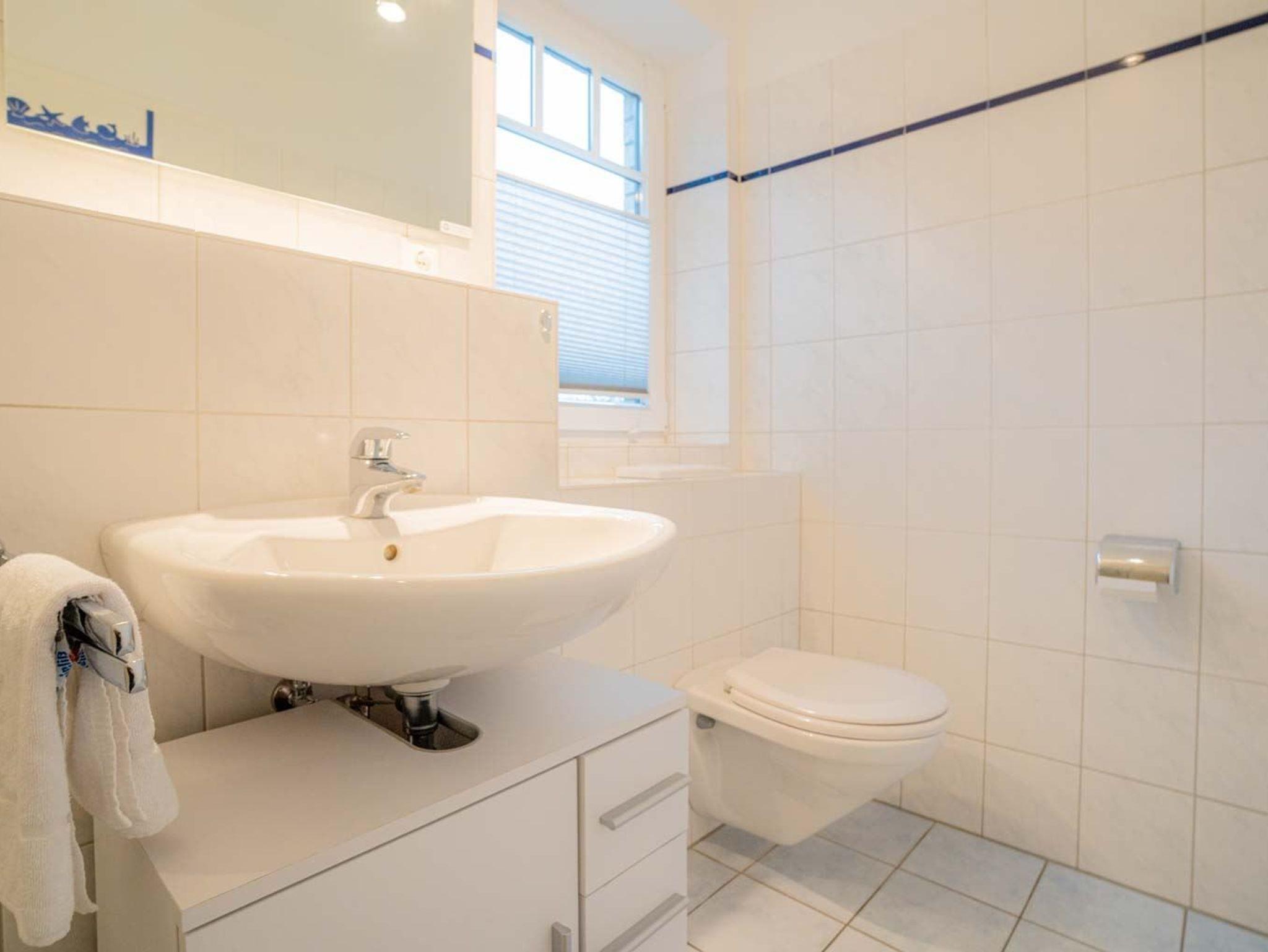 Badezimmer (Duschbad) mit Dusche mit niedrigem Einstieg, WC und Tageslicht.