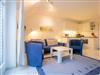 Wohnzimmer mit ausziehbarem Schlafsofa (170 x 190cm), 2 Sesseln, TV (Sat), DVD-Player, Stereoanlage mit CD-Player und Esstisch mit 4 Stühlen. Direkter Zugang zum windgeschützten, möblierten Südbalkon mit schönem Ausblick über den Deich in Richtung Meer. Offene Küche mit Backofen, Geschirrspüler, Kühlschrank mit Gefrierfach und Mikrowelle.