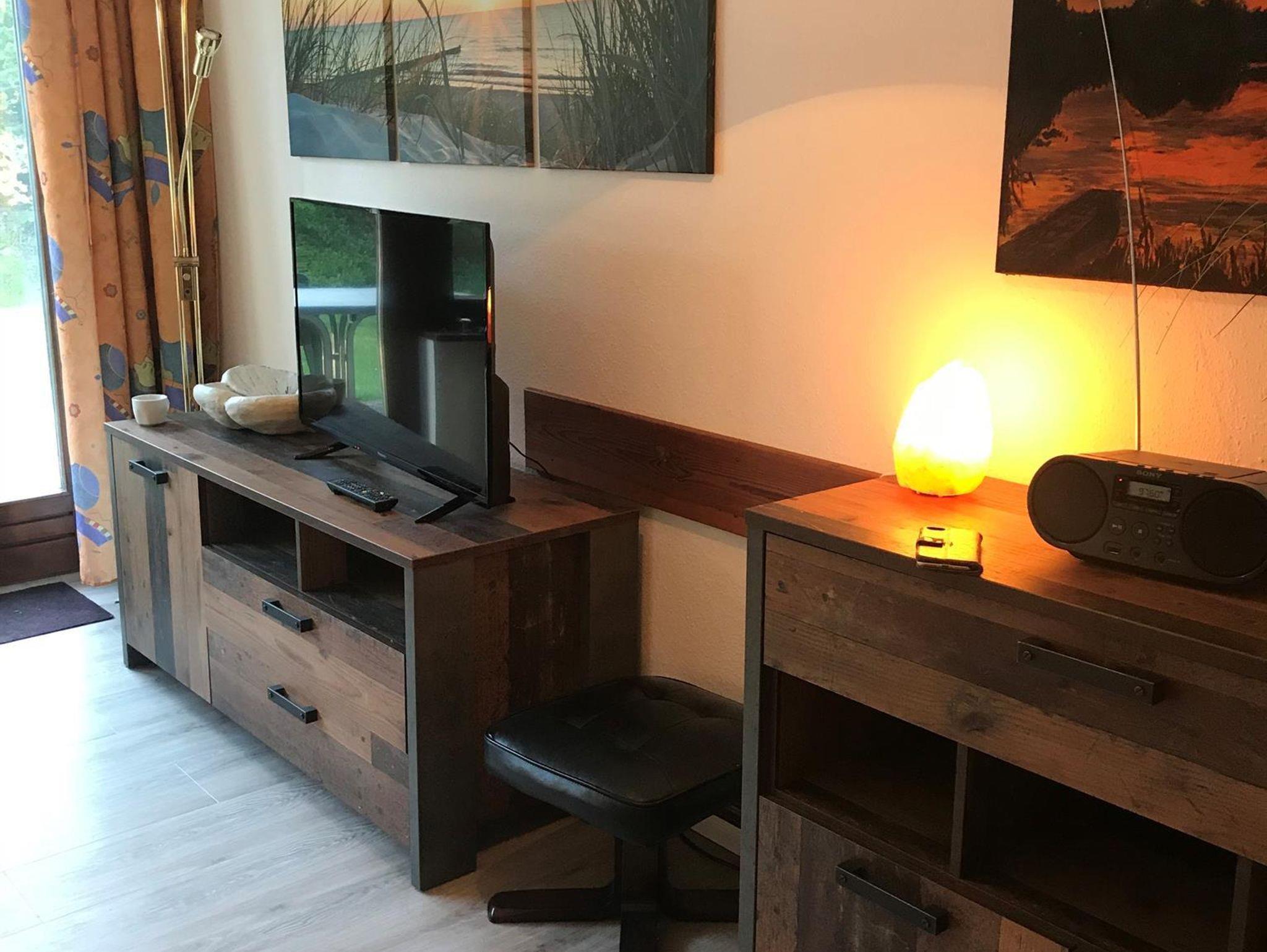 1 Wohnraum mit angrenzendem Essbereich, vollständig eingerichtete Kochnische, Farb-TV, WLAN und Radio. Dusche/WC. Südterrasse.