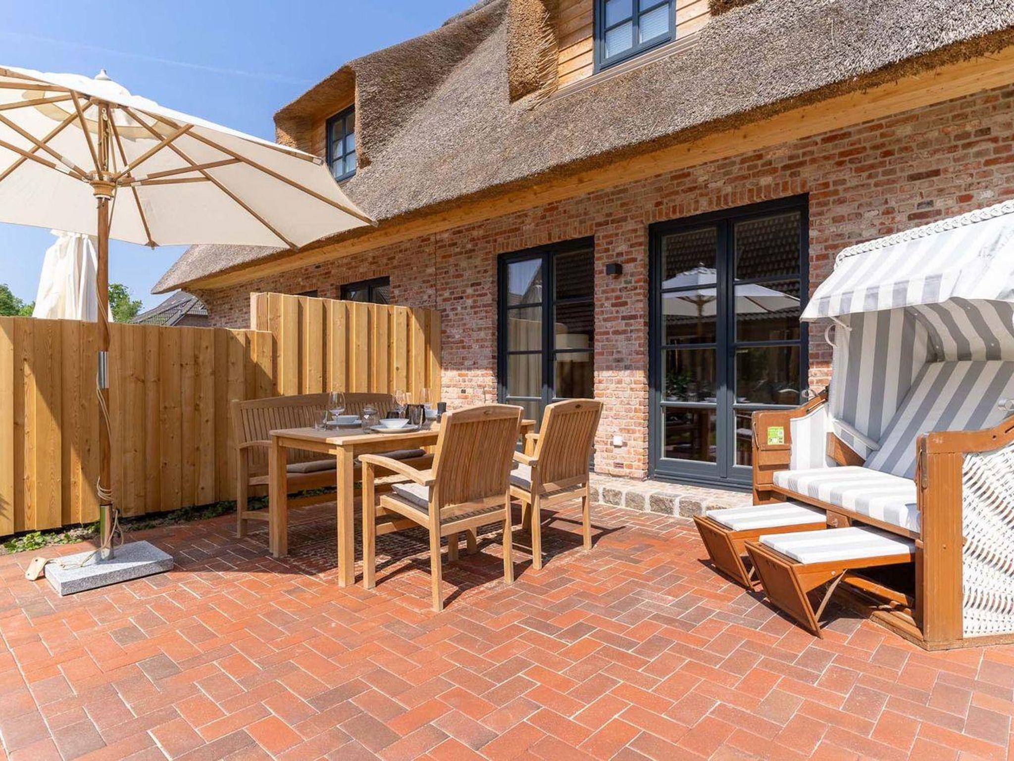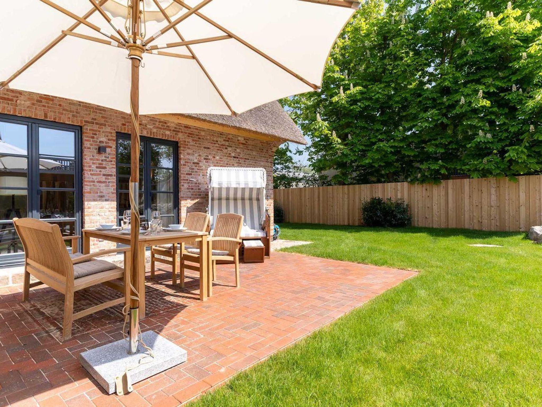 Der nach Süden ausgerichtete Garten mit großzügiger Terrasse, Rasenfläche, heimischen Pflanzen und Dünengras überzeugt mit hochwertigen Teak-Gartenmöbeln sowie einem gemütlichen Strandkorb. Für eine komfortable An- und Abreise steht Ihnen ein PKW-Stellplatz direkt am Haus zur Verfügung.