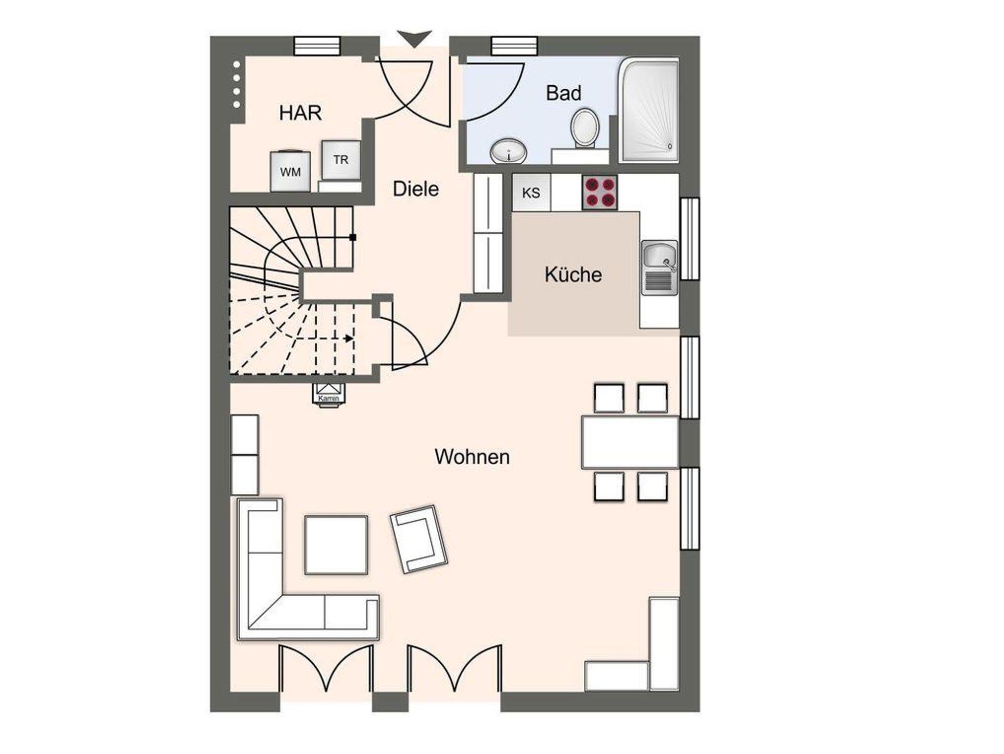 An den Wohnbereich schließen sich der Flur, ein Duschbad und der Hauswirtschaftsraum an.