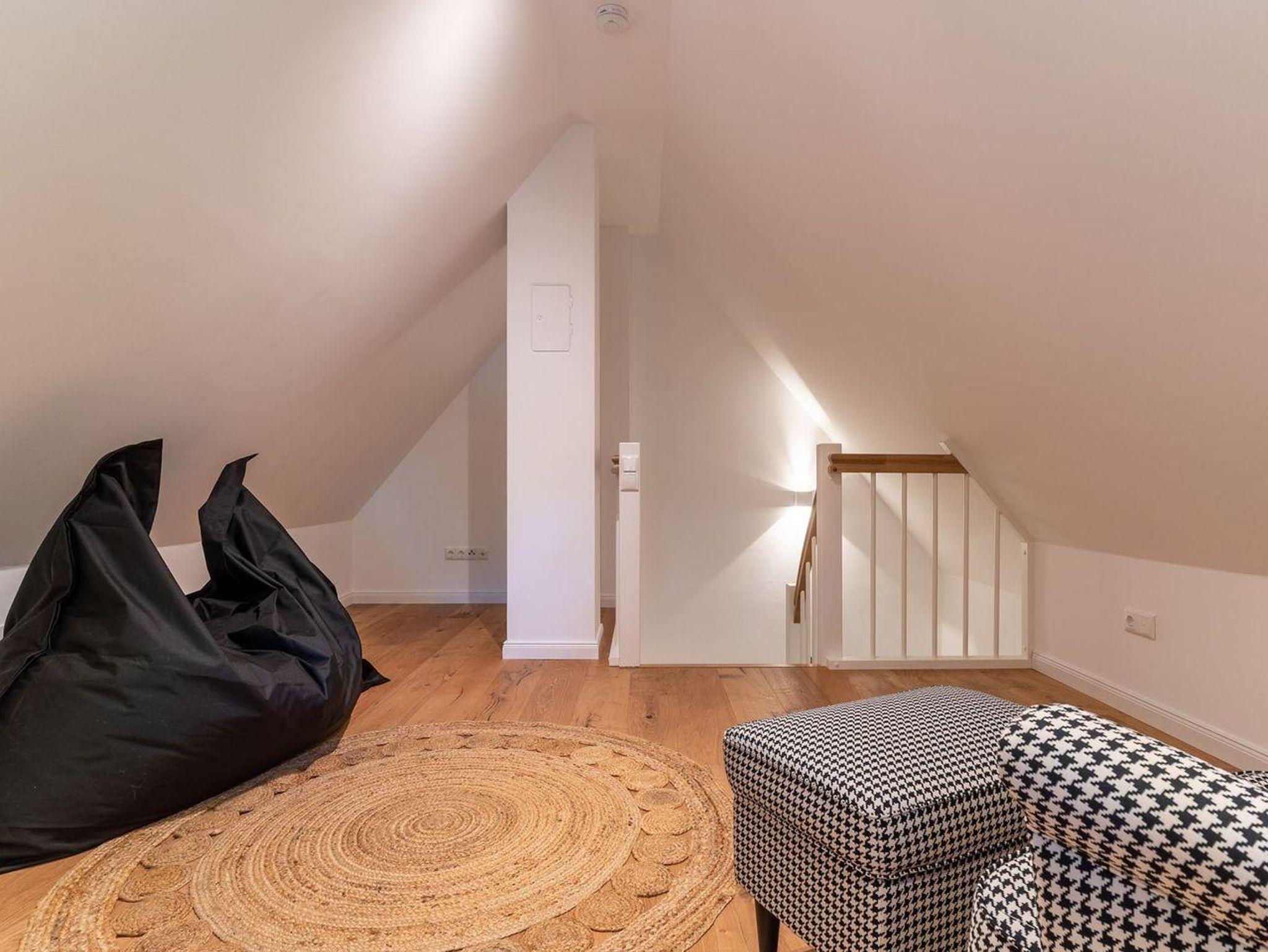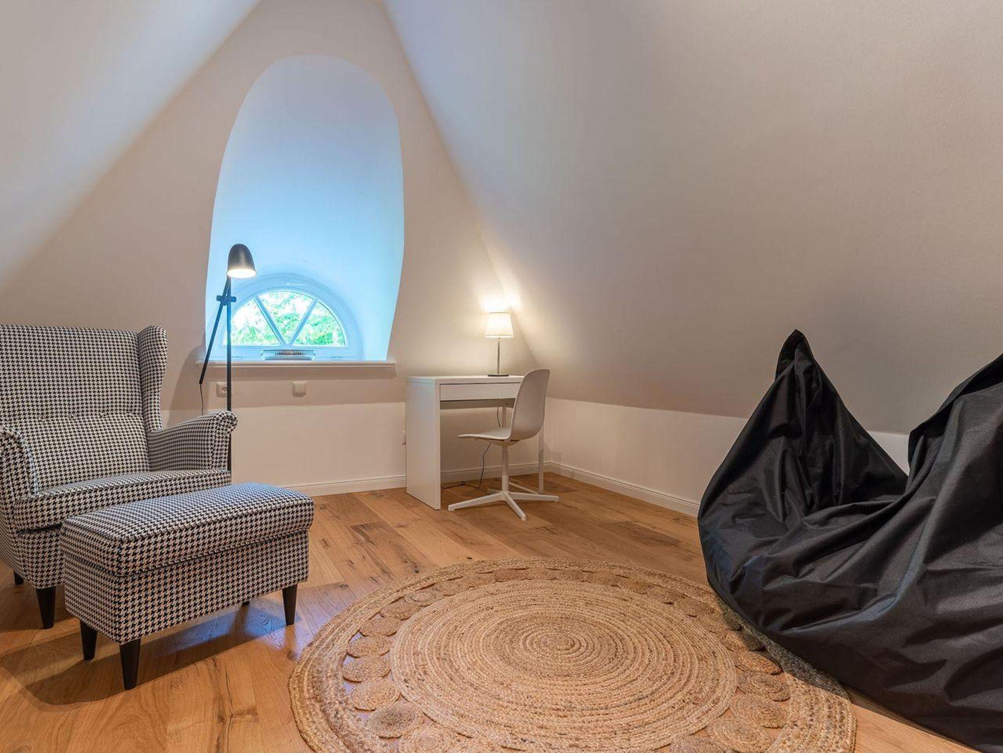Im zweiten Obergeschoss mit Spitzboden finden Sie ein weiteres kleines Wohnzimmer mit ruhigem Arbeitsbereich u