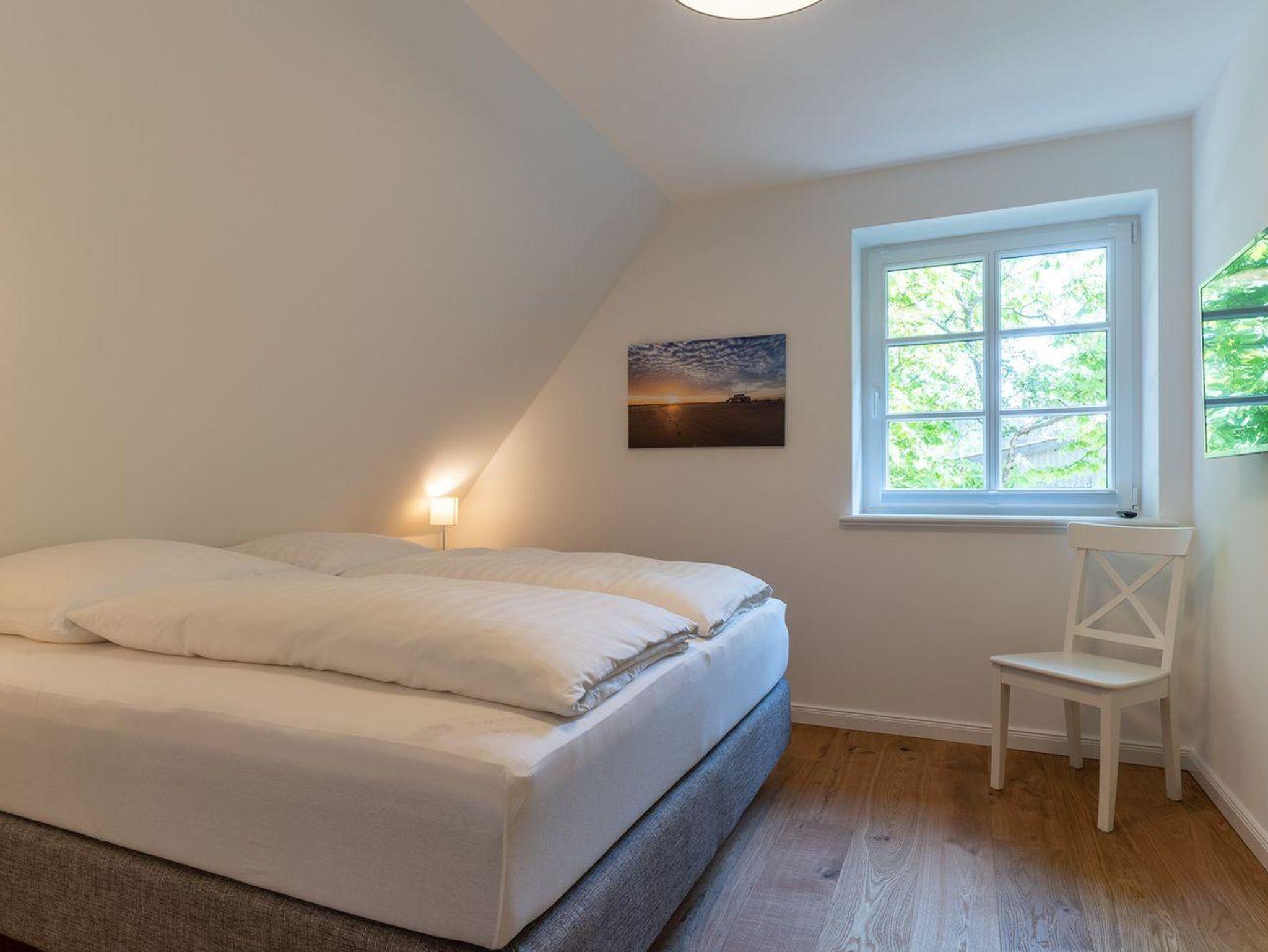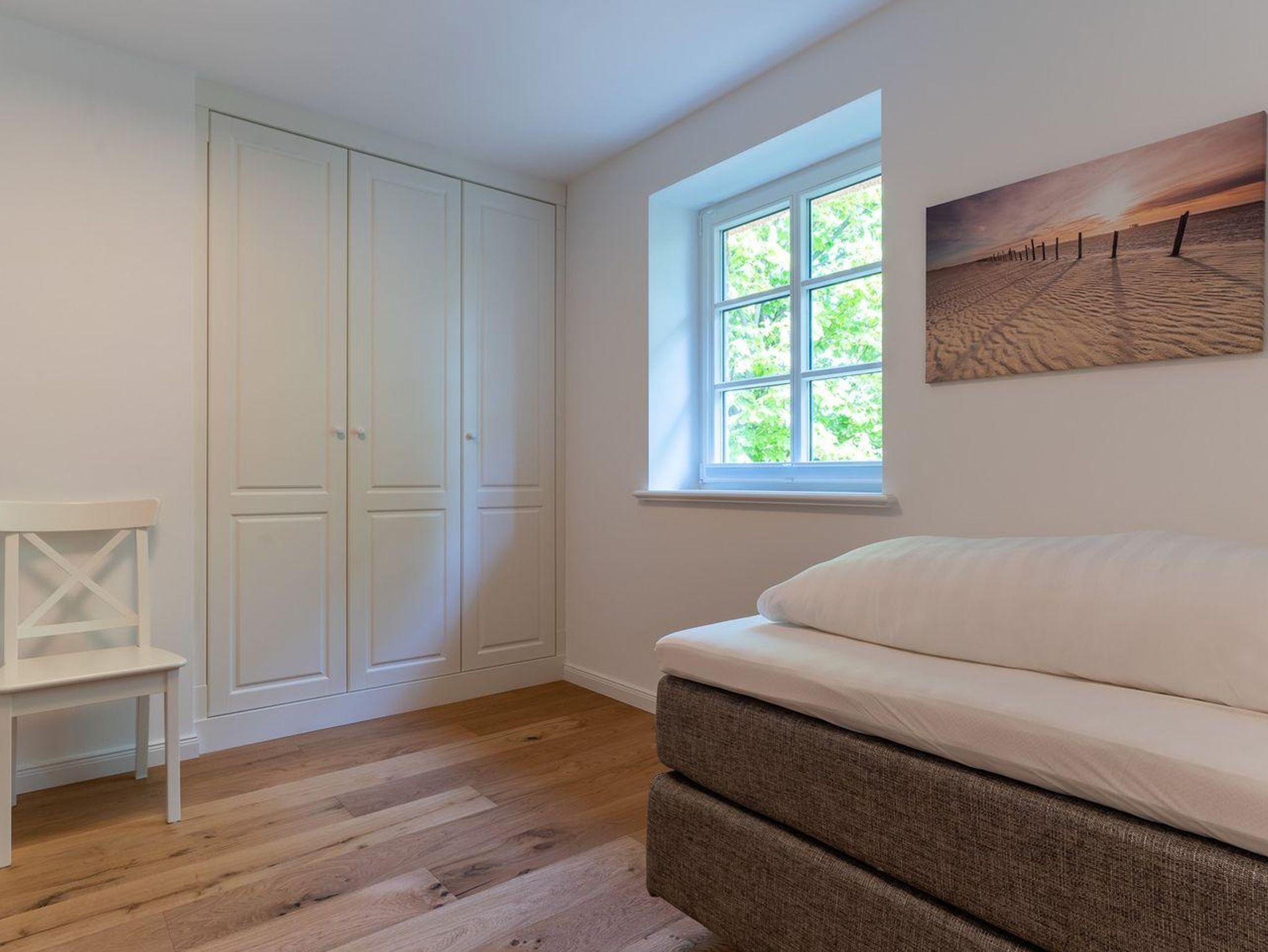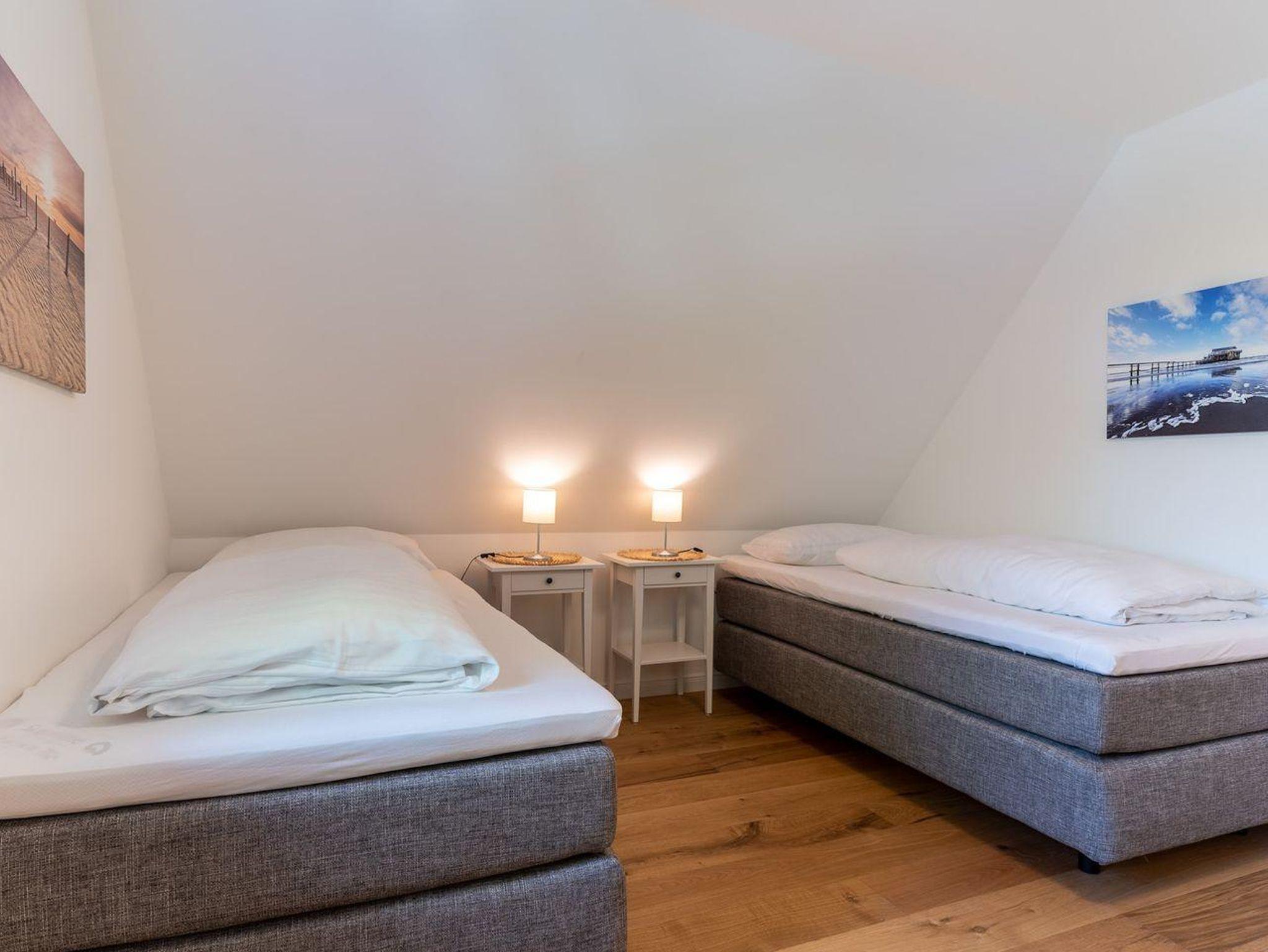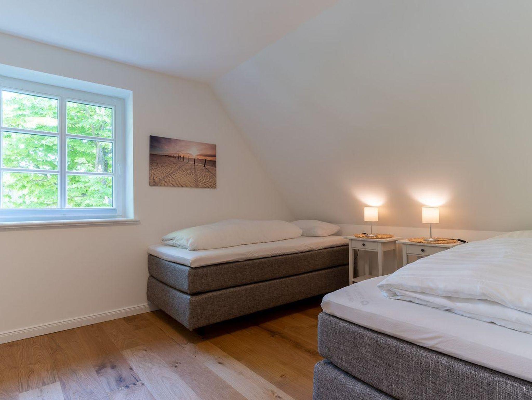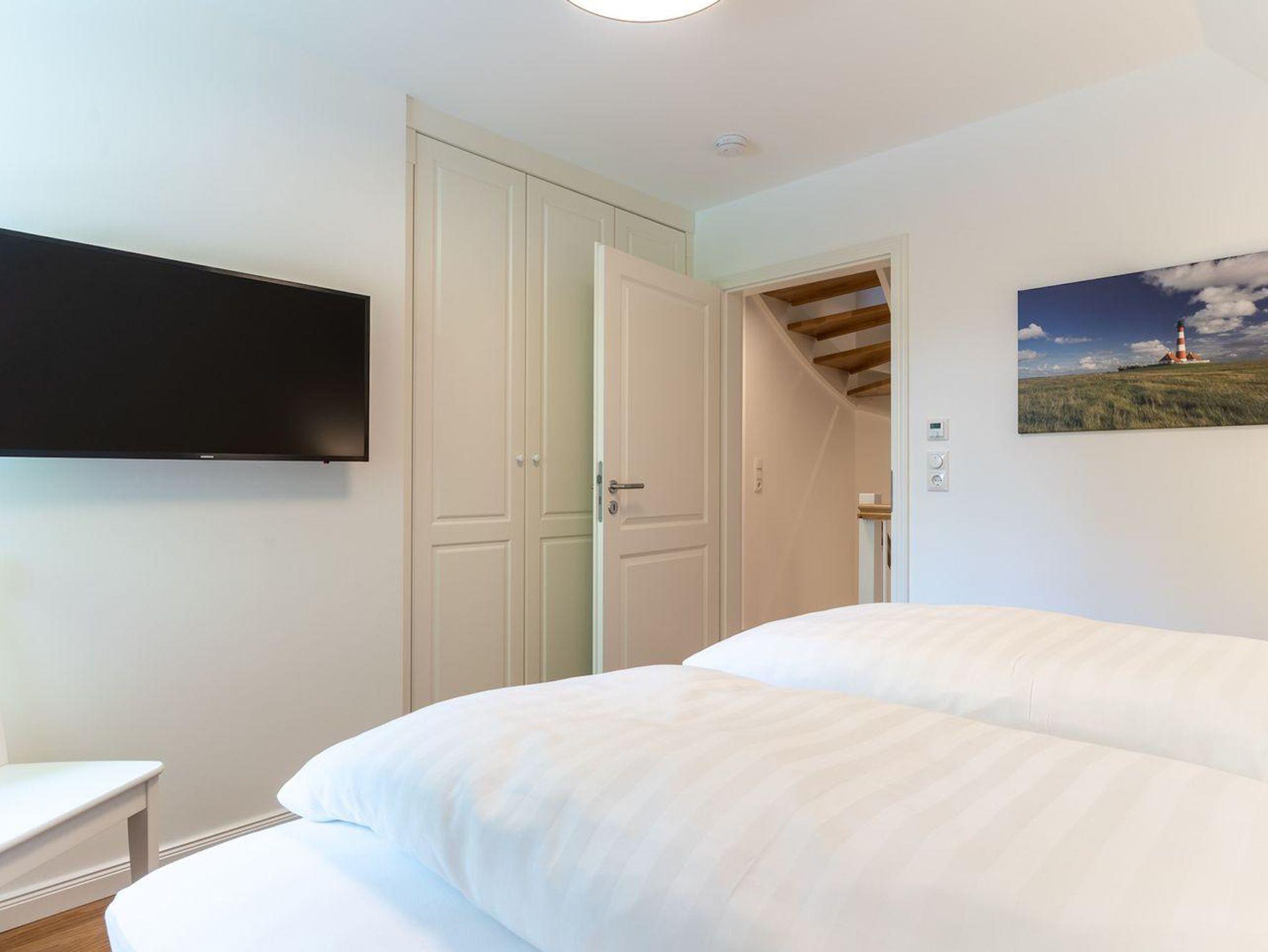 Im ersten Obergeschoss bieten zwei komfortabel ausgestattete Schlafzimmer ruhevolle Erholung. Ein Zimmer verfügt über ein Boxpring-Doppelbett mit TV, das andere über zwei Boxspring-Einzelbetten. Große Einbauschränke bieten ausreichend Ablagefläche. Für eine angenehme Auszeit sorgt das Badezimmer mit großer Wellness-Dusche und Kneippschlauch.