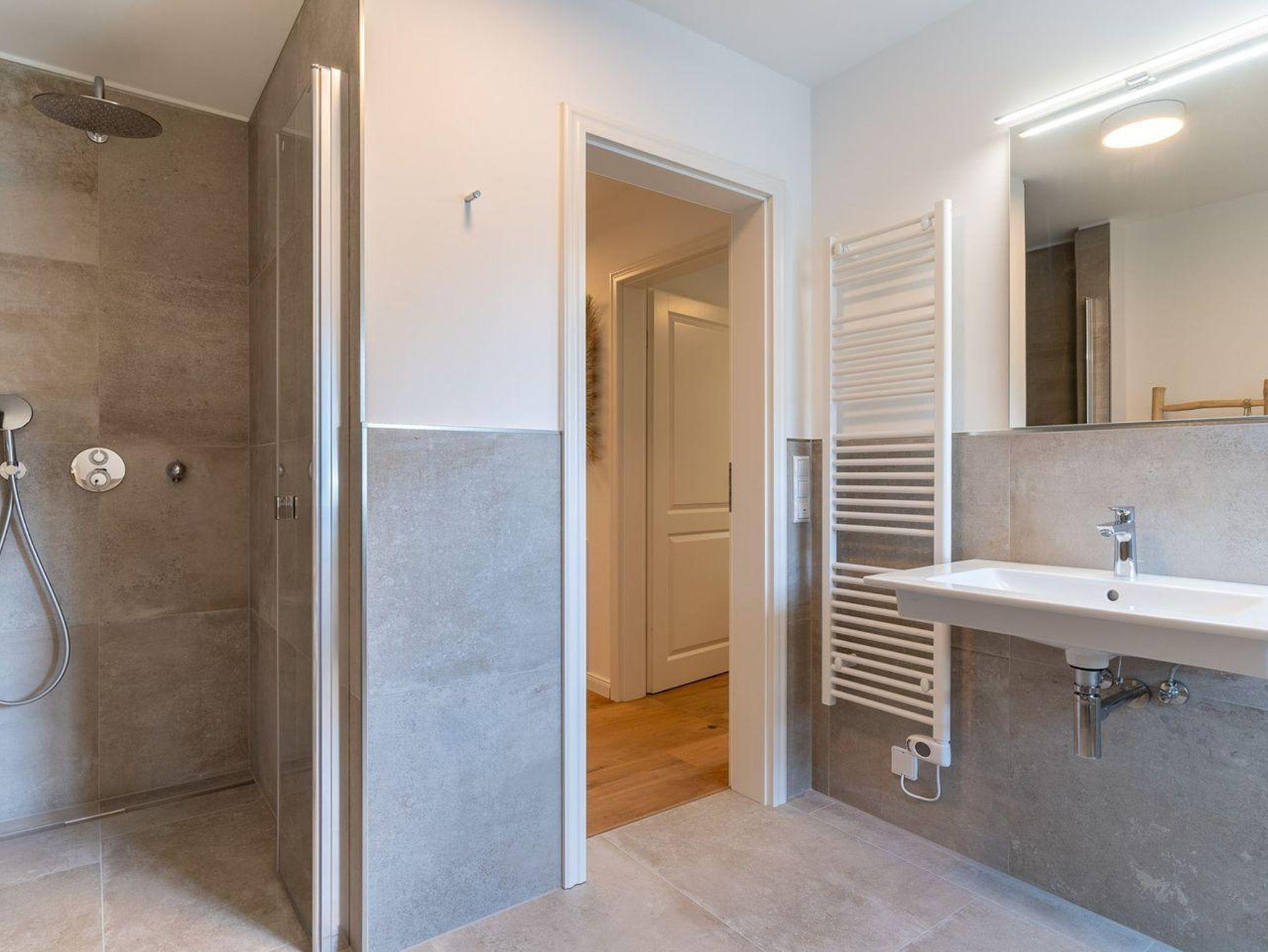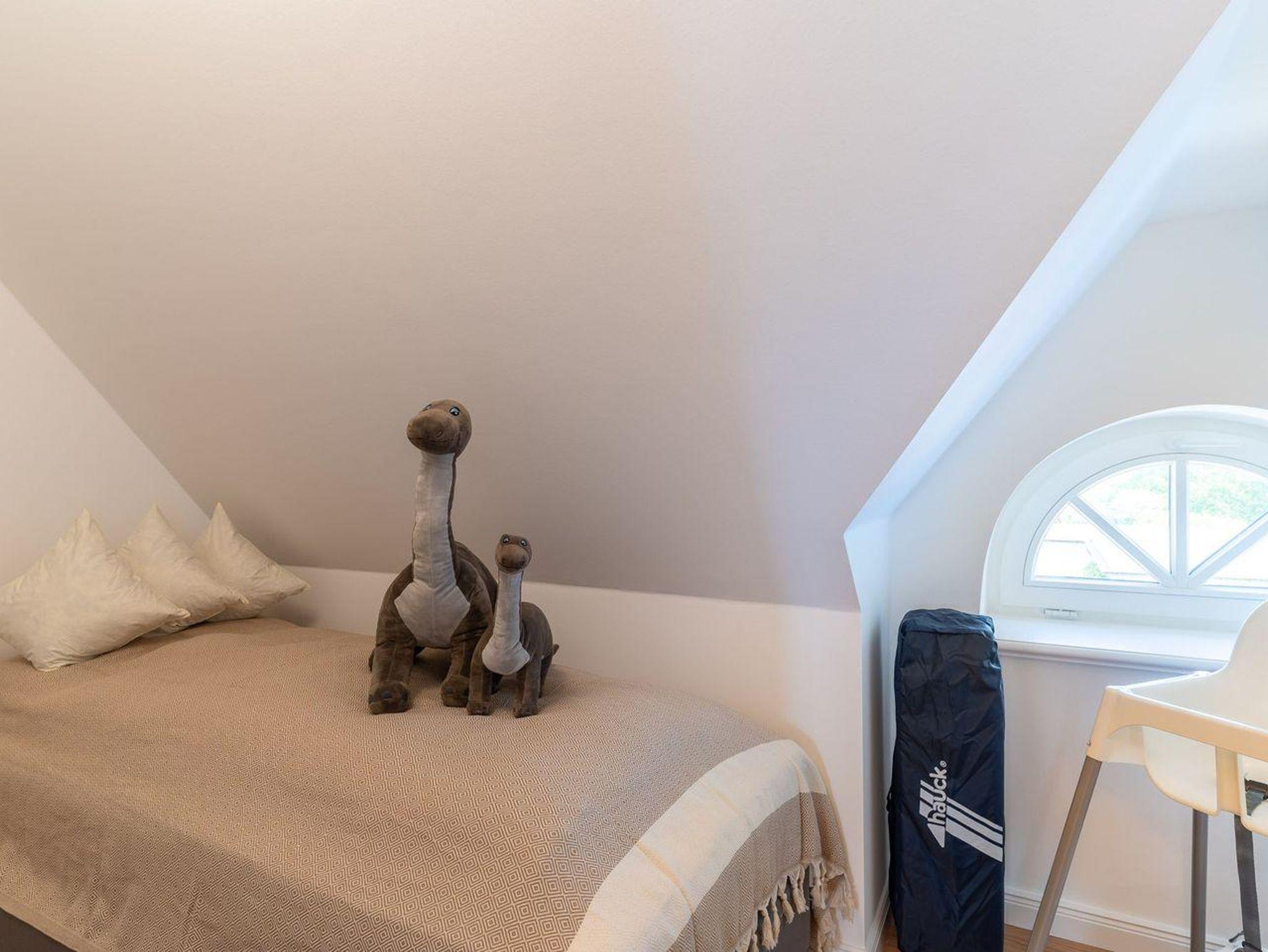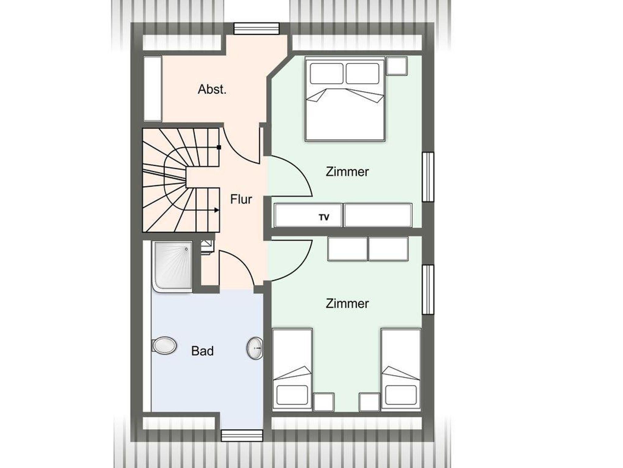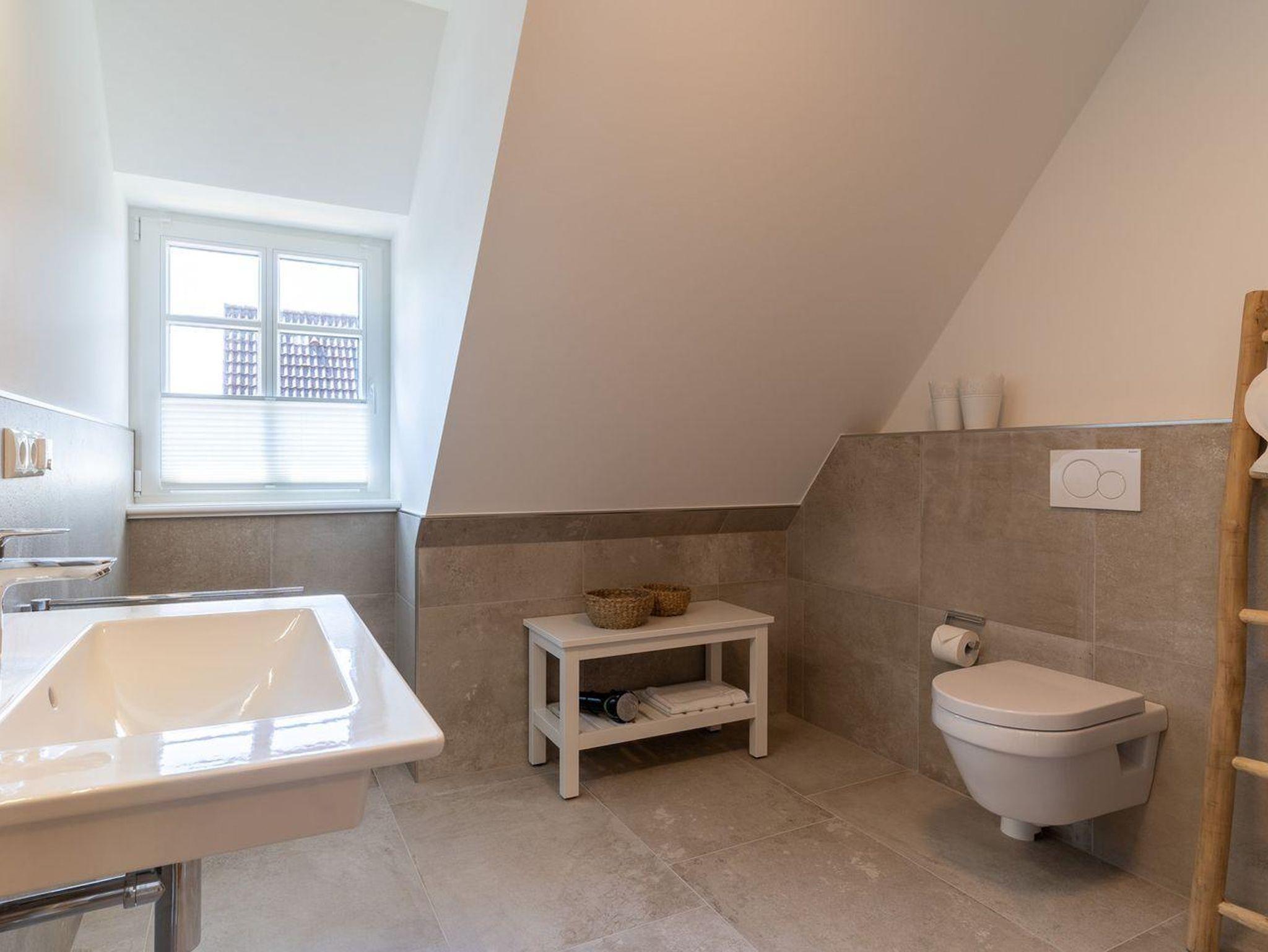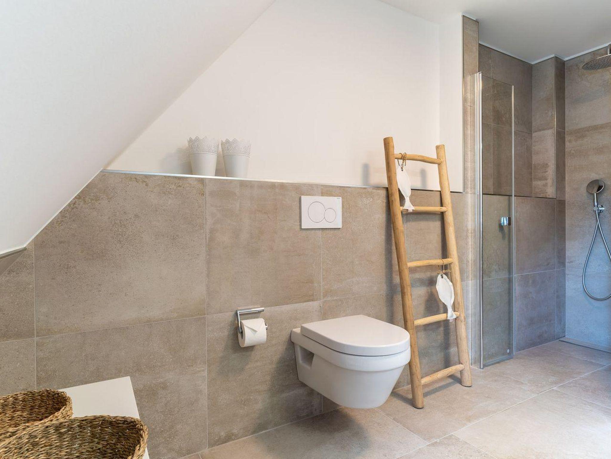 Im ersten Obergeschoss bieten zwei komfortabel ausgestattete Schlafzimmer ruhevolle Erholung. Ein Zimmer verfügt über ein Boxpring-Doppelbett mit TV, das andere über zwei Boxspring-Einzelbetten. Große Einbauschränke bieten ausreichend Ablagefläche. Für eine angenehme Auszeit sorgt das Badezimmer mit großer Wellness-Dusche und Kneippschlauch.