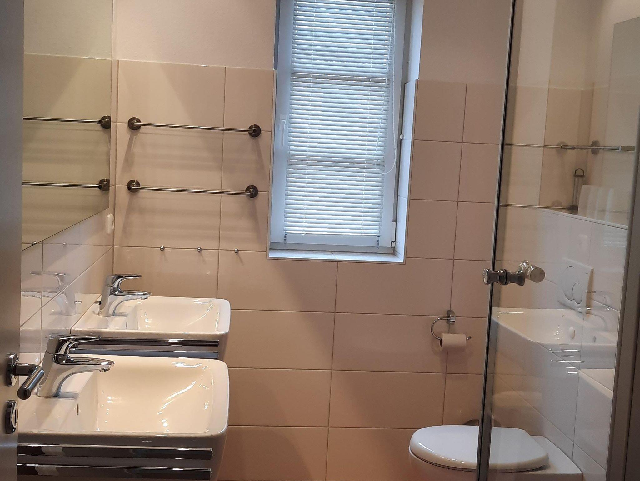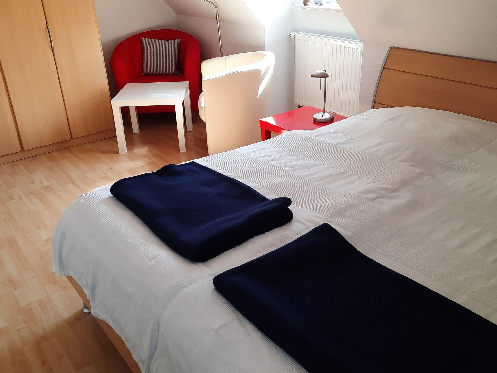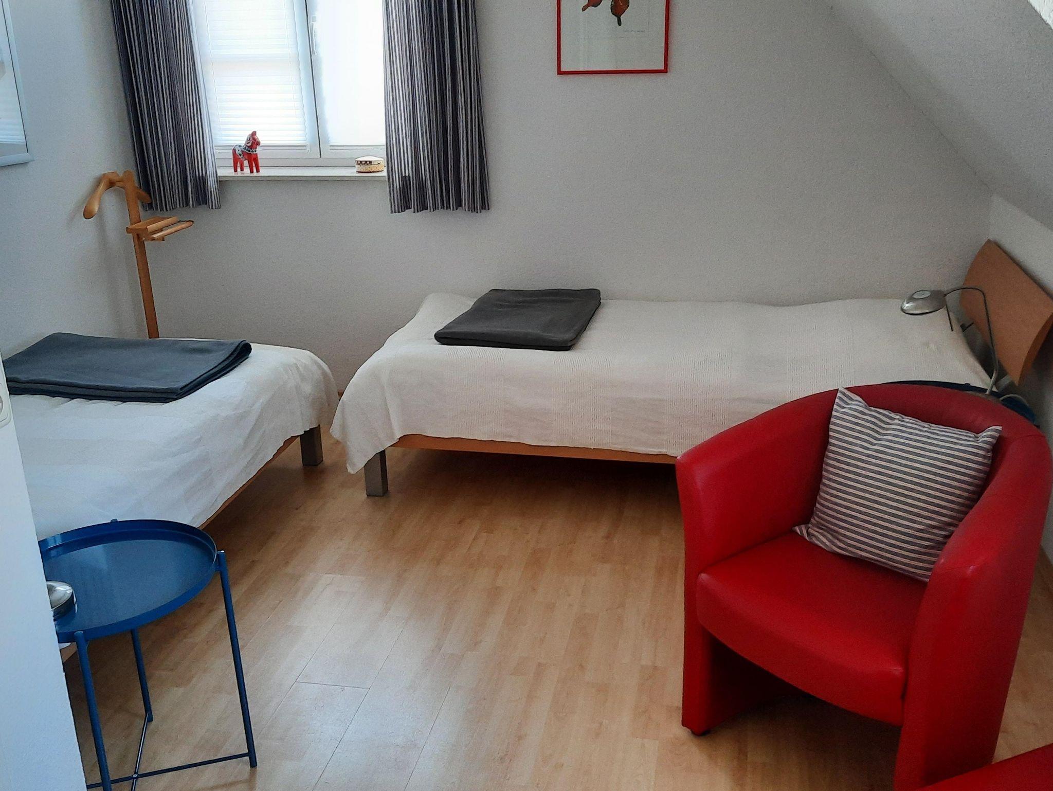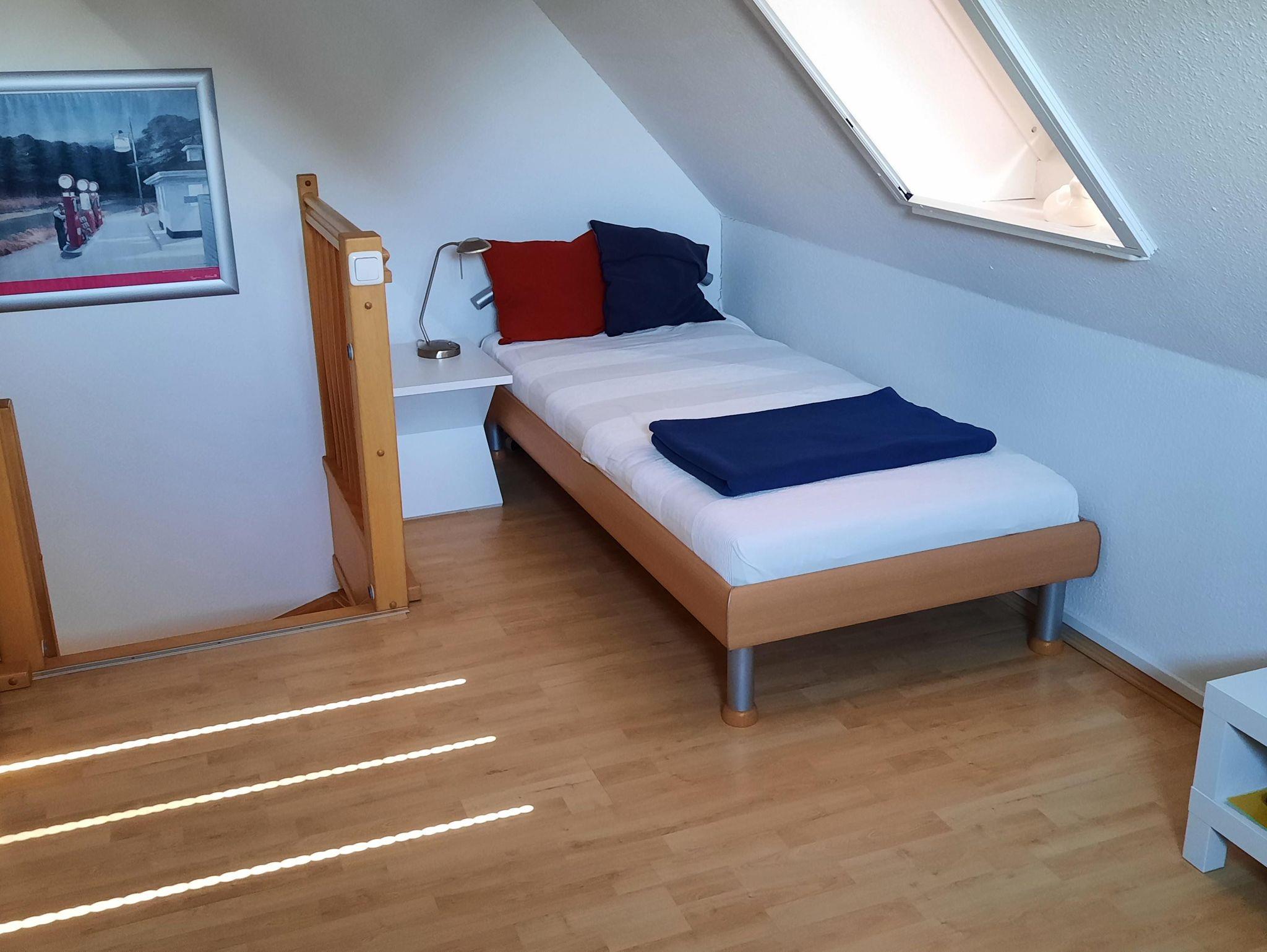 2 Schlafzimmer sind im Obergeschoß. Das Elternschlafzimmer mit einem Doppelbett (hochwertige Matratzen 1,80 x 2,0m) und das Kiderzimmer mit 2 Einzelbetten ( 0,90x 2,0 m). Im Obergeschoss befindet sich ein weiteres Zimmer, dass als weiteres Wohnzimmer mit einem Fernseher ausgestattet ist und einem Einzelbett, falls mehr Paltz benötigt wird.