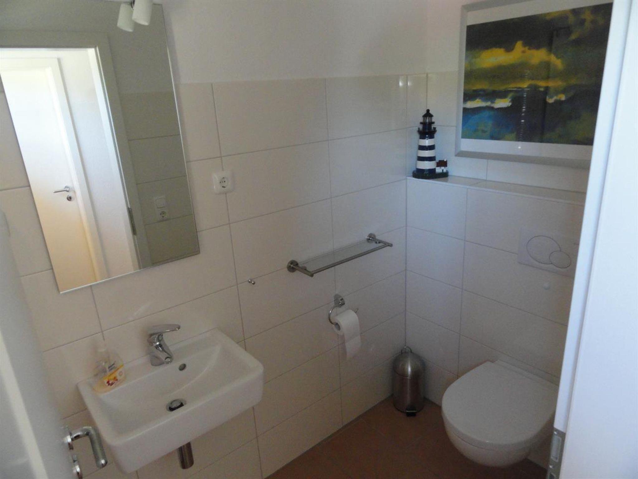Ein elegant, klar gegliedertes Duschbad /WC mit 2 Waschbecken und Fußbodenheizung im Obergeschoß und ein Gäste-WC im Erdgeschoß sind vorhanden. Verbringen Sie die sonnige Zeit auf der Süd-Westterrasse und kuscheln sich in den Strandkorb oder die hochwertigen Gartenmöbel.
