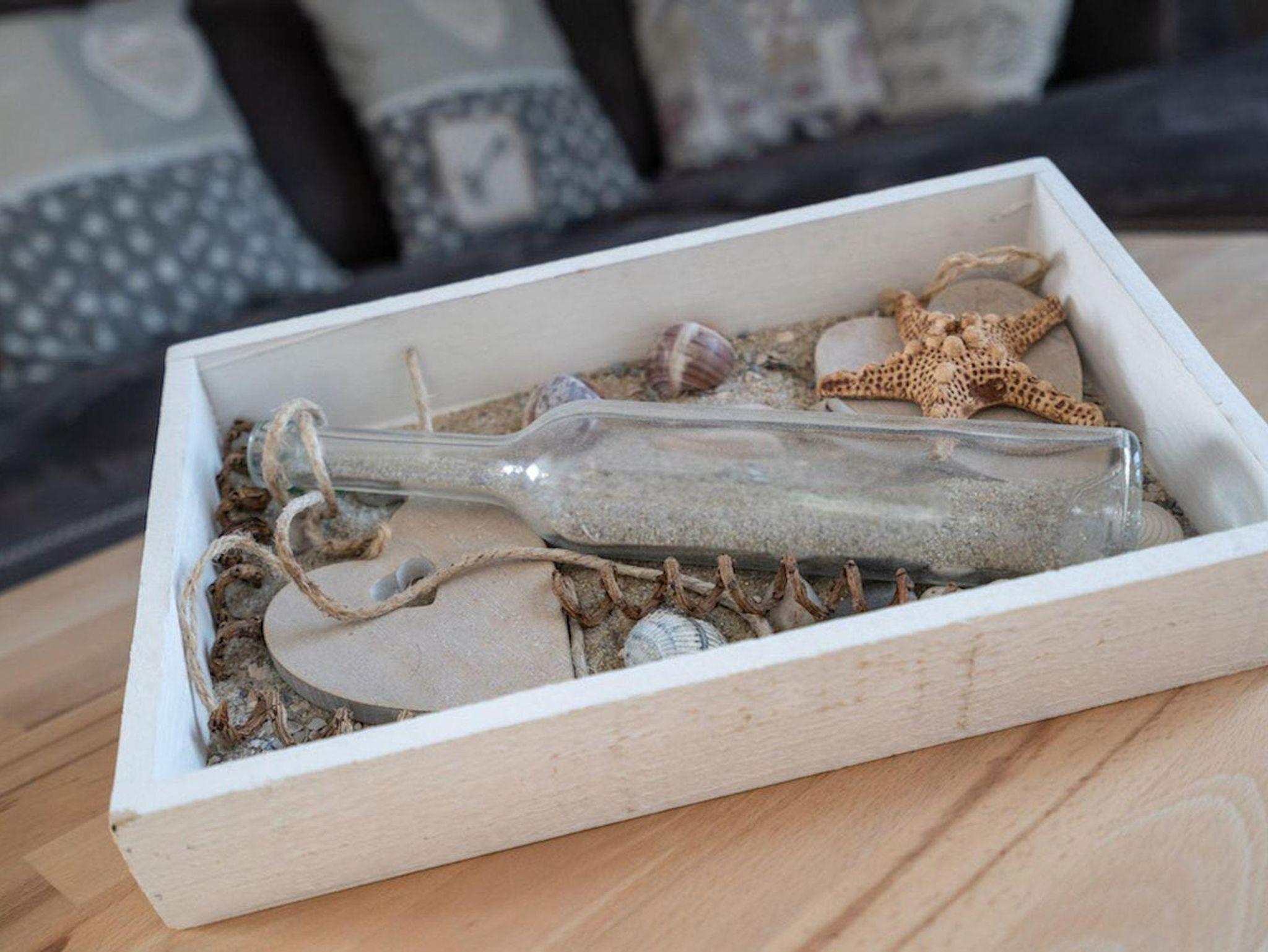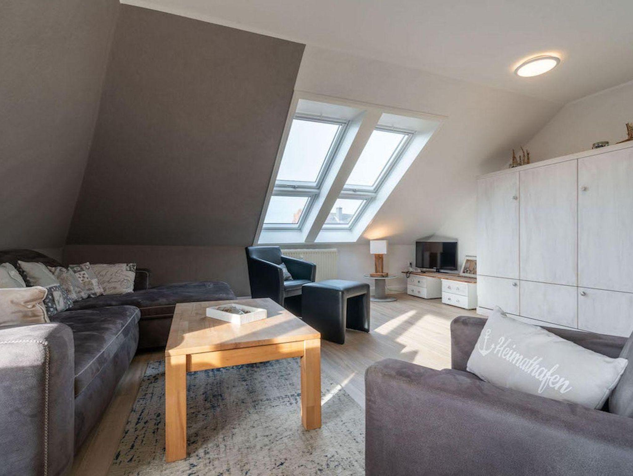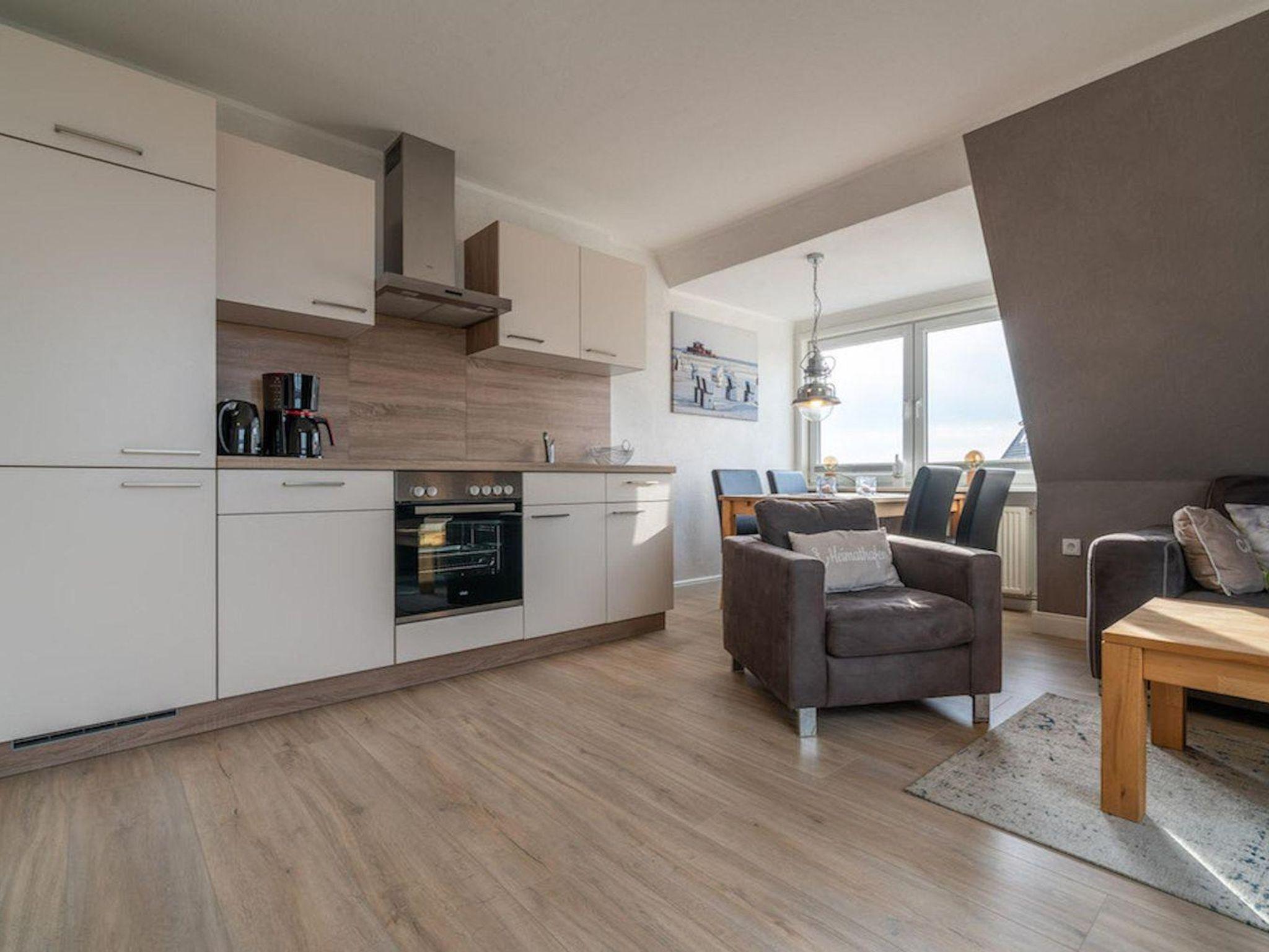 In diesem Appartement im 2. Obergeschoss haben sie komfortabel Platz für 4 Personen und blicken direkt über den Deich auf die Strandkörbe und Pfahlbauten am Strand. Die 68 qm Ferienwohnung besteht aus einem hellen Wohnbereich. Hier finden Sie eine Couch mit Couchtisch und 2 Sessel. Des weiteren ist ein Esstisch mit 4 Stühlen vorhanden. Die Küchenzeile des Hauses ist ausgestattet mit einem Herd mit Ceranfeld und Backofen, Dunstabzugshaube, Geschirrspüler, Geschirr, Kaffeemaschine, Kochtöpfe, Kühlschrank, Toaster und einem Wasserkocher.