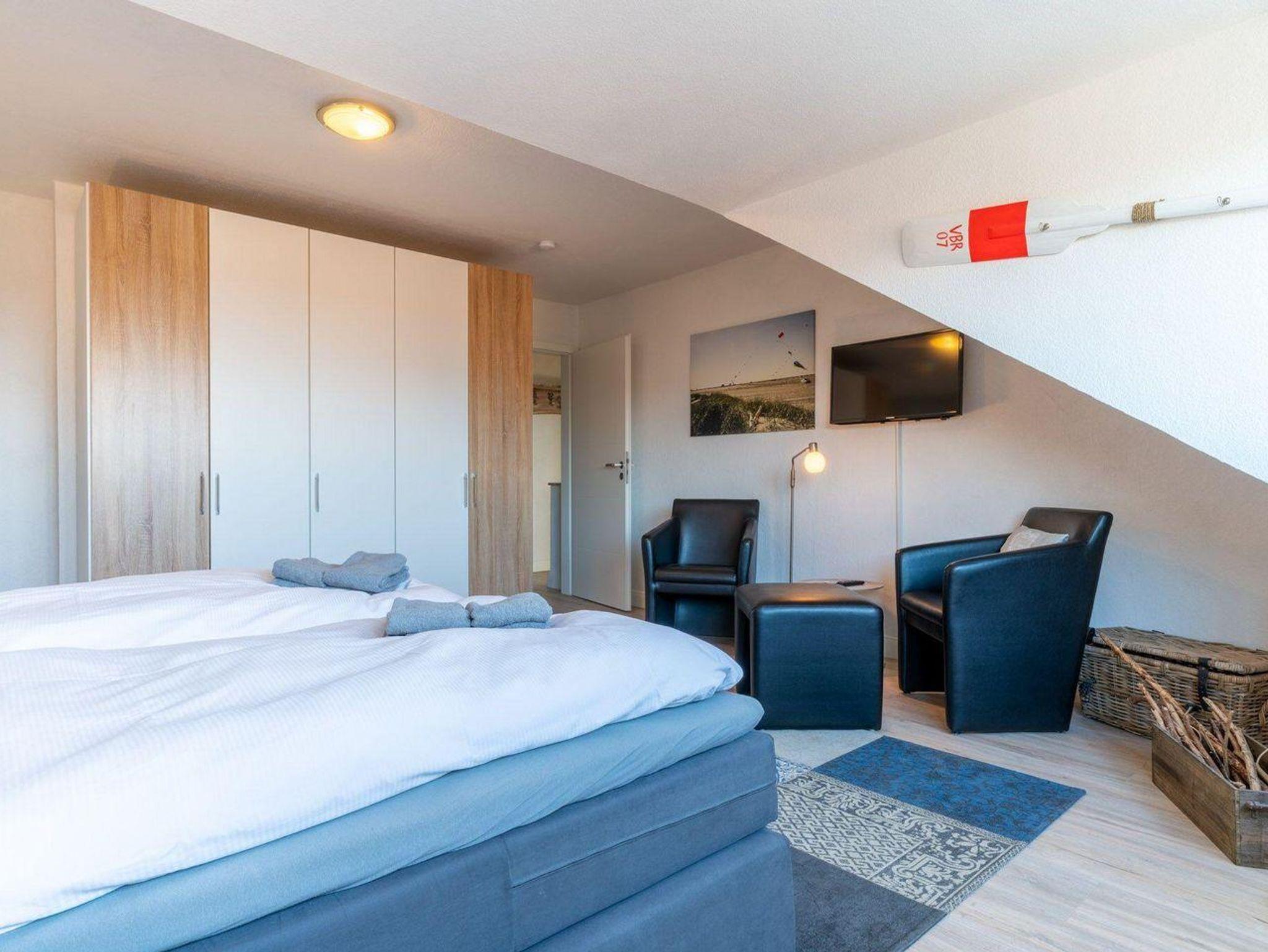 Das Schlafzimmer mit 2 Nachttischen, Beistelltisch, Kleiderschrank, Sessel, Spiegel und einer Stehlampe verfügt über ein gemütliches Doppelbett ( 2,00 x 1,80 m ). Ein Schranksofa im Wohnzimmer bietet weitere 2 Schlafmöglichkeiten. Das Badezimmer besteht aus einer Dusche, Waschbecken und WC. Zur Unterhaltung dient ein Sat-TV Flachbildschirm, Radio sowie WLAN (inklusive). Genießen Sie den tollen Meerblick aus allen Räumen!
