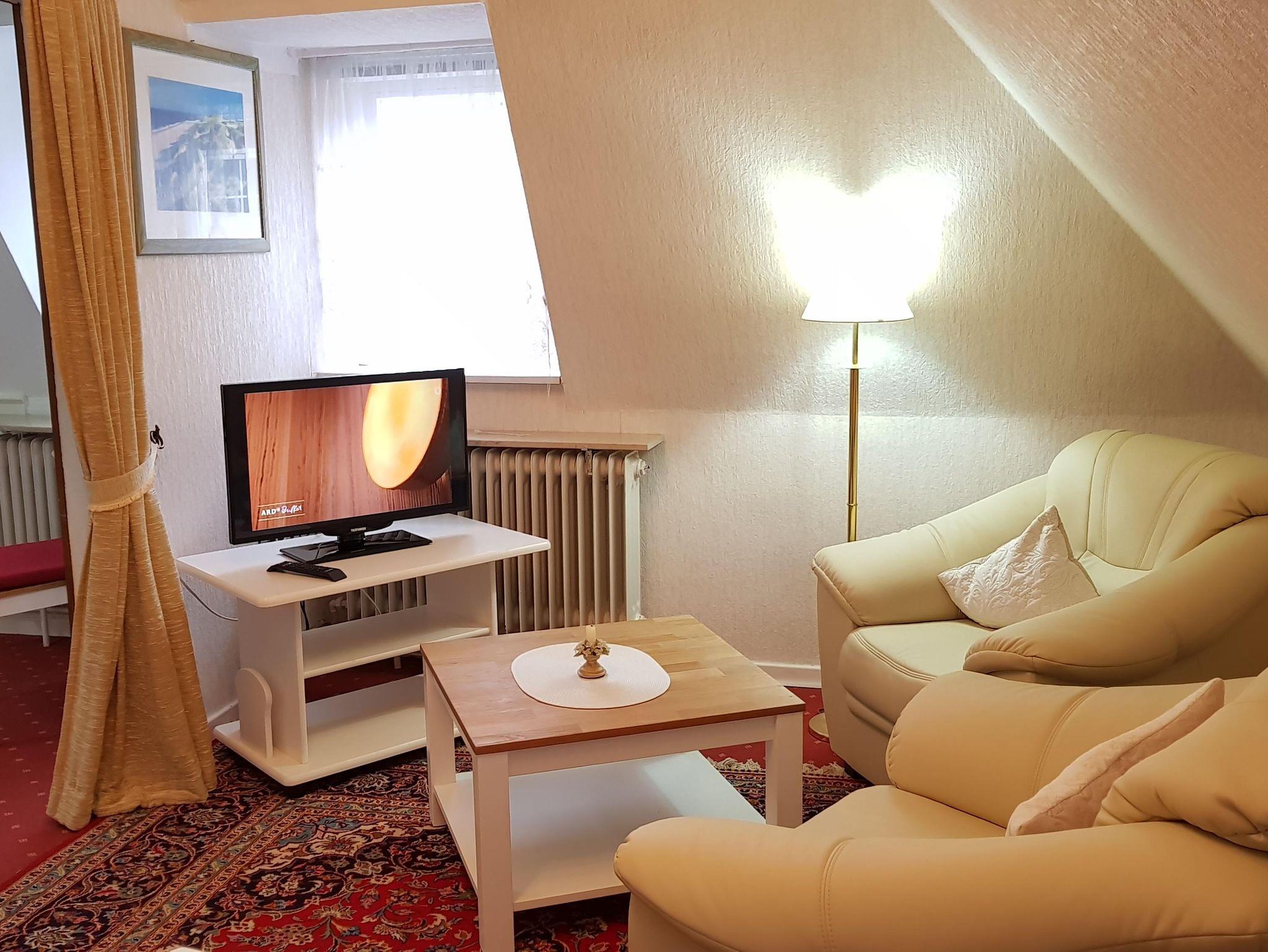 • Gemütliches Wohnzimmer mit Sofa für 2 Personen, 2 Sessel, TV, Radio und kleinem Esstisch mit 3 Stühlen.