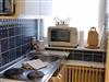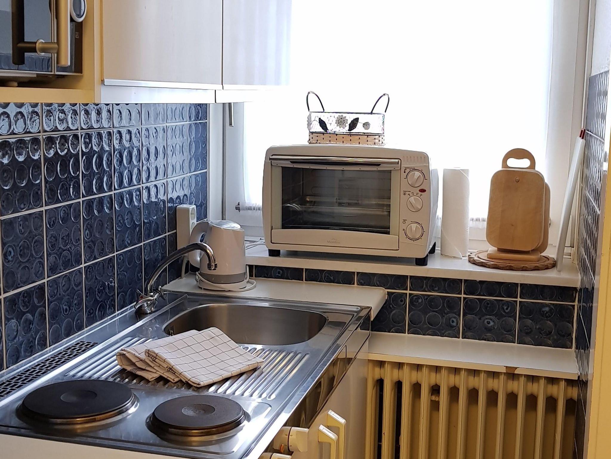 • Separate kleine Küche mit Herd (2-Plattenherd), Kühlschrank mit Gefrierfach, Mikrowelle und kleinem Backofen. Haushaltsschrank mit Staubsauger.