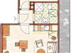 Das Wohnzimmer ist mit einer Küchenzeile (2-Platten-Kochfeld, Kaffeemaschine, Wasserkocher, Eierkocher, Kühlschrank, Toaster,...),