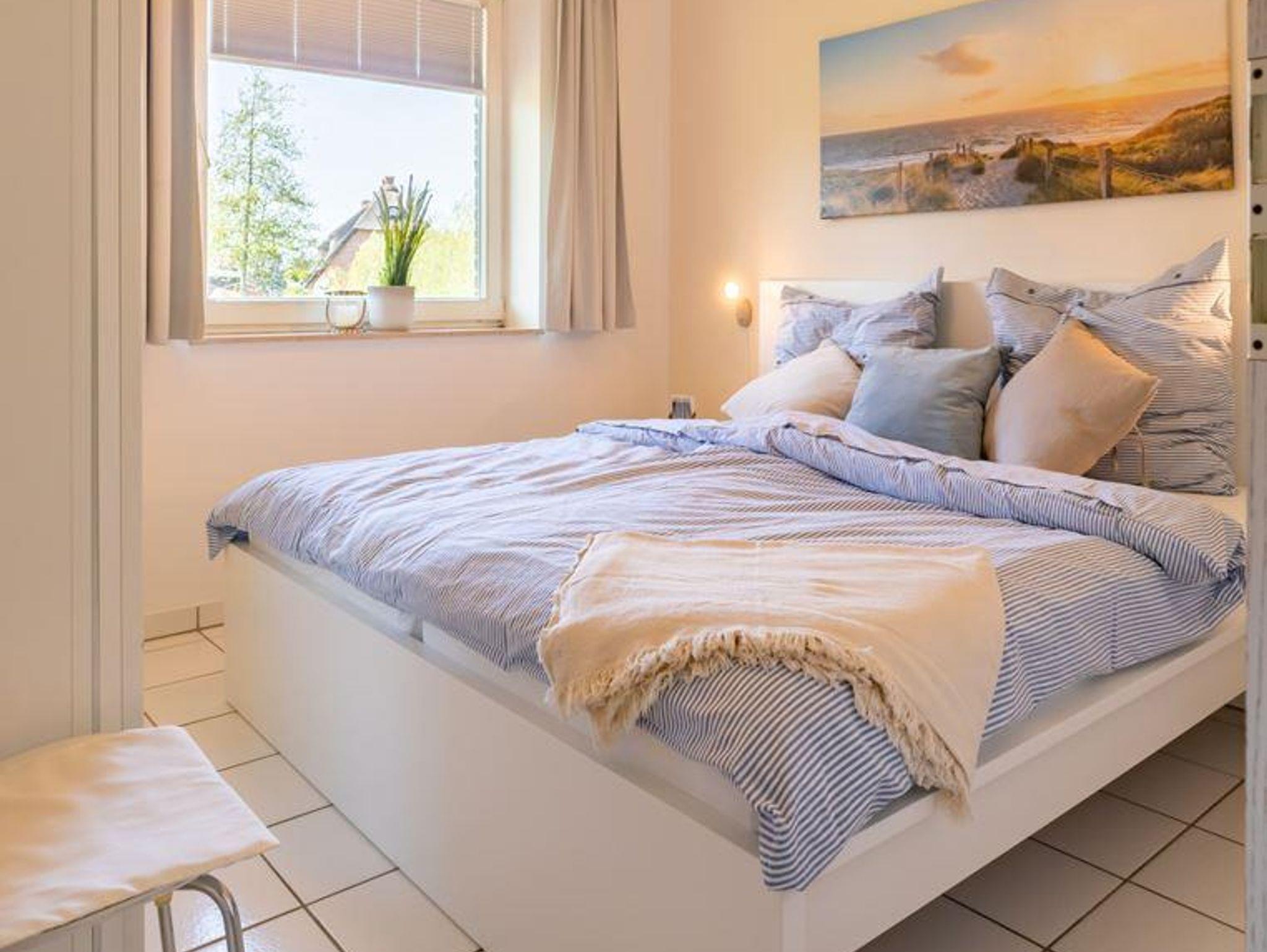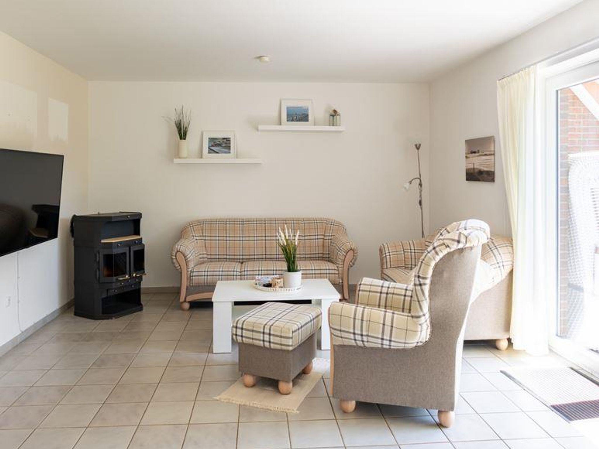 1 Wohnraum mit Sitzecke, Radio, Farb-TV, DVD-Player und vollständig eingerichteter Küchenzeile mit Backofen sowie Geschirrspülmaschine und Eßecke und Ausgang zur Terrasse mit Strandkorb. 1 Schlafraum mit 3Einzelbetten. 1 Schlafraum mit Doppelbett, Dusche/WC und Flur. Die Wohnung ist komplett gefliest und hat Fußbodenheizung. Spiele und Bücher stehen zur Verfügung. Komfortabel und liebevoll eingerichtet.