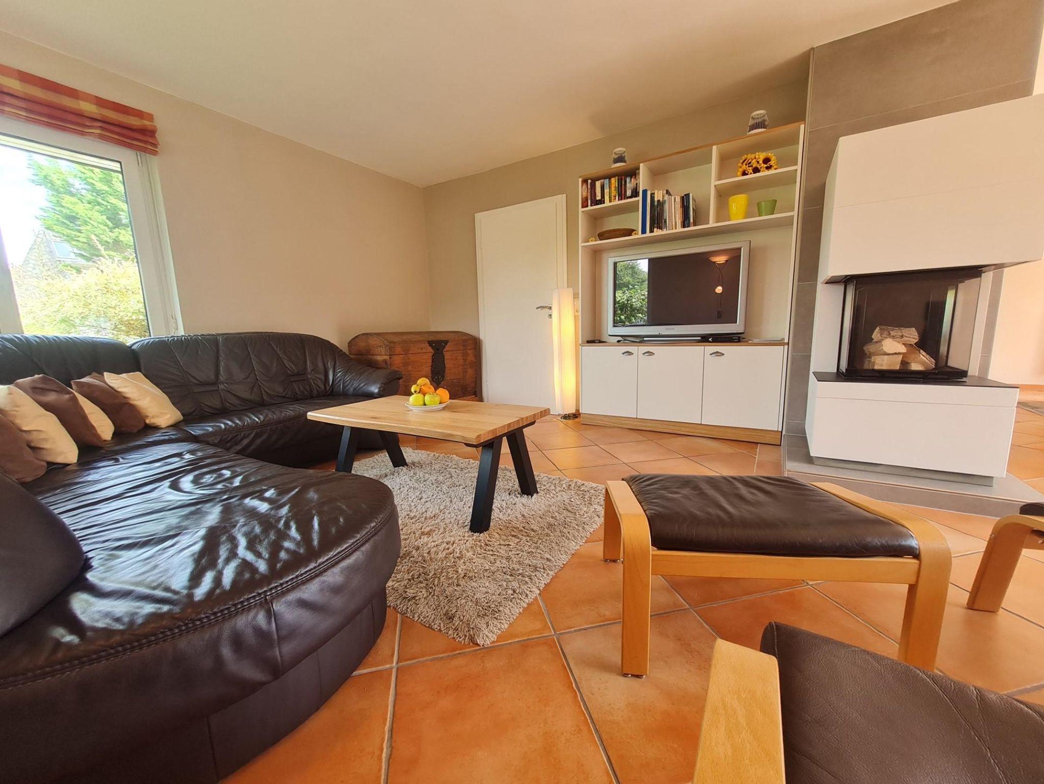 Kommen Sie an - ein großes Wohnzimmer mit Kamin, Essecke mit großem Tisch, SAT-TV, Spiel- und Leseschrank, HIFI-Anlage,