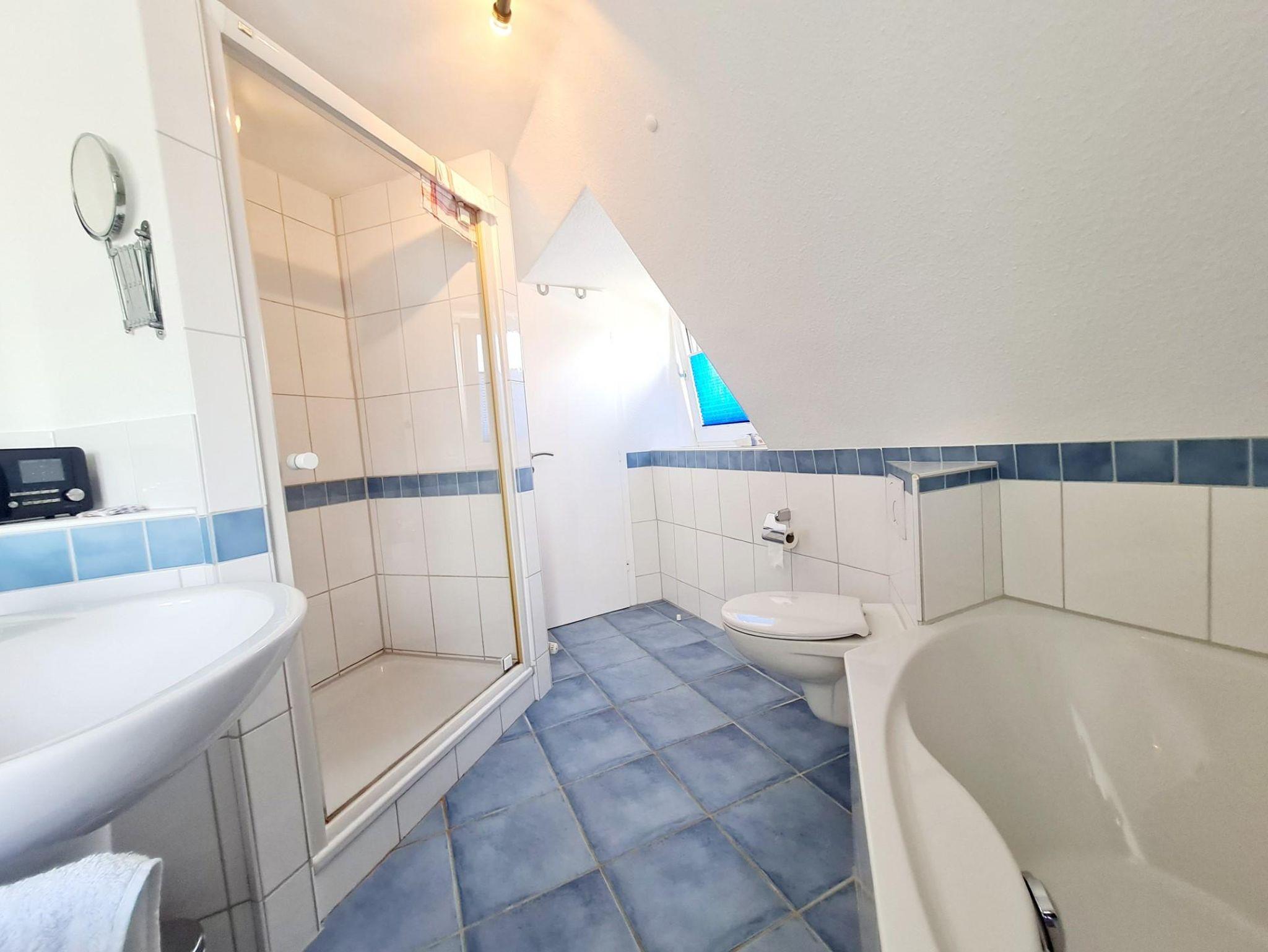 Ein Badezimmer im Erdgeschoß mit Dusche, Waschtisch, WC, sowie ein Vollbad im Obergeschoß mit Wanne, Dusche, 2 Waschtischen, WC, Kosmetikspiegel und Haartrockner lässt keine Wartezeiten zu.