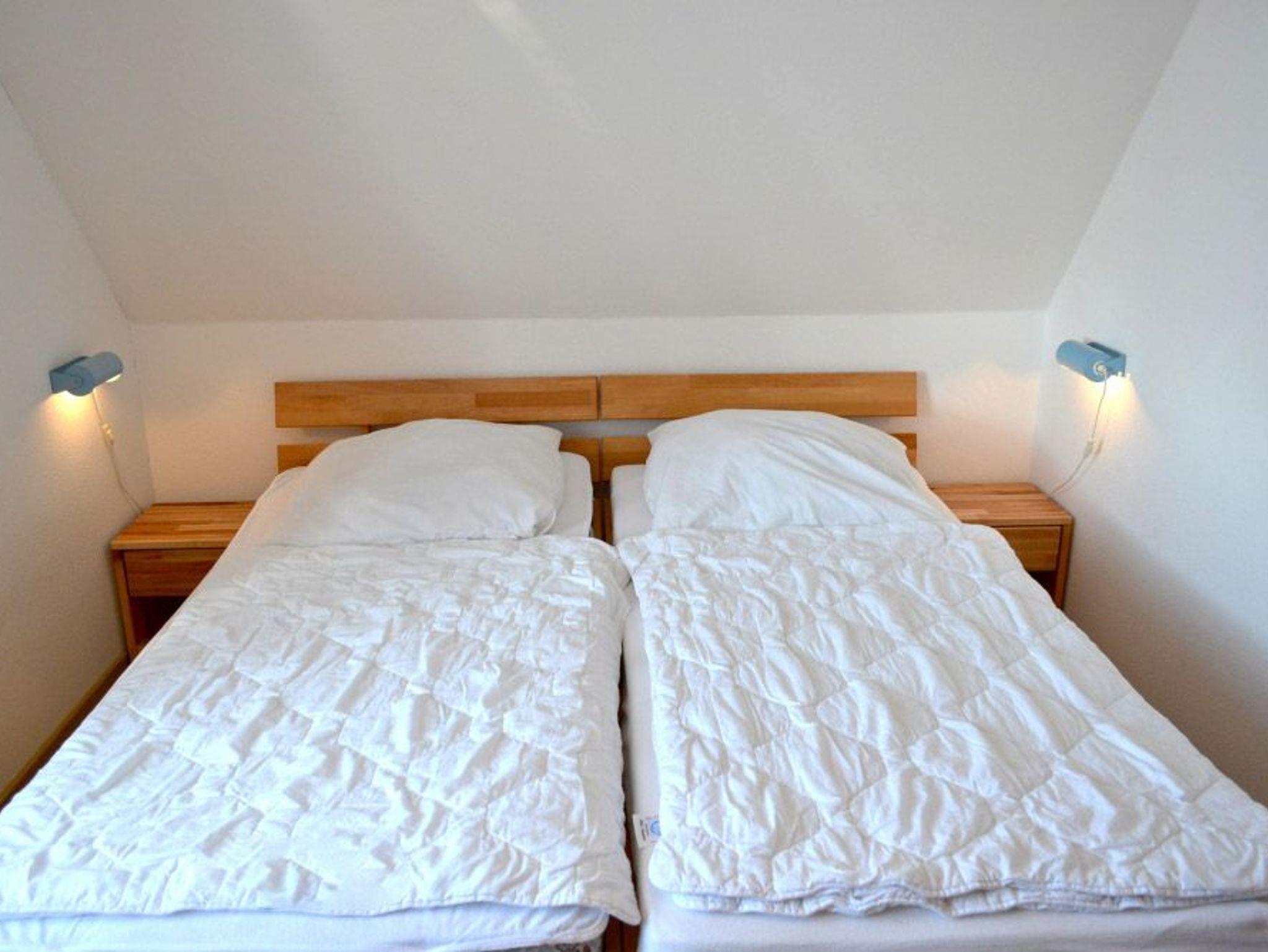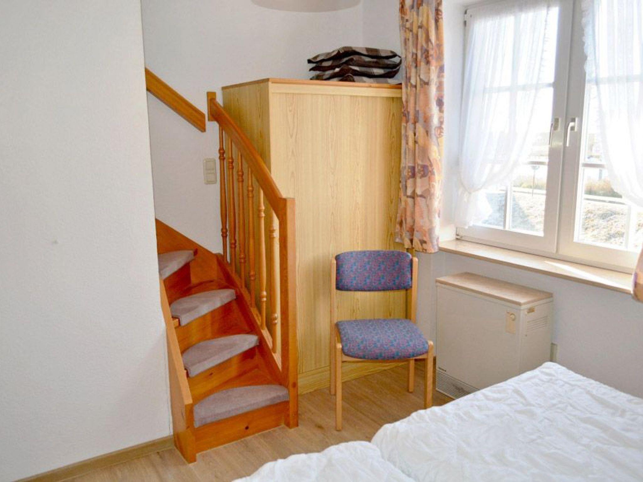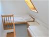 Schlafzimmer 1: 2 Einzelbetten, E-Heizung, Nachttisch, Schrank, Stuhl, Treppe nach oben