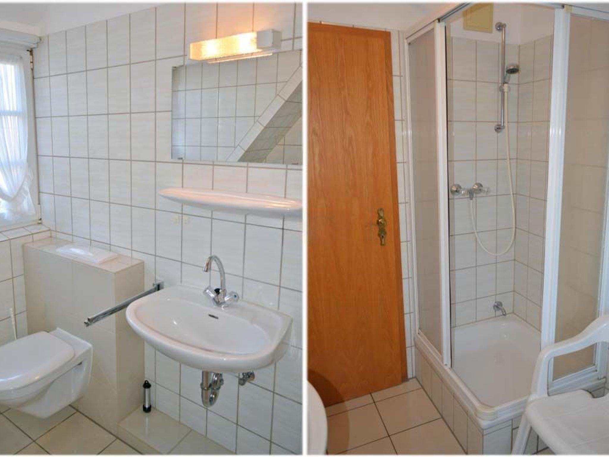 Bad: Dusche, Duschkabine, Regal, Spiegel, Stuhl, Waschbecken, WC