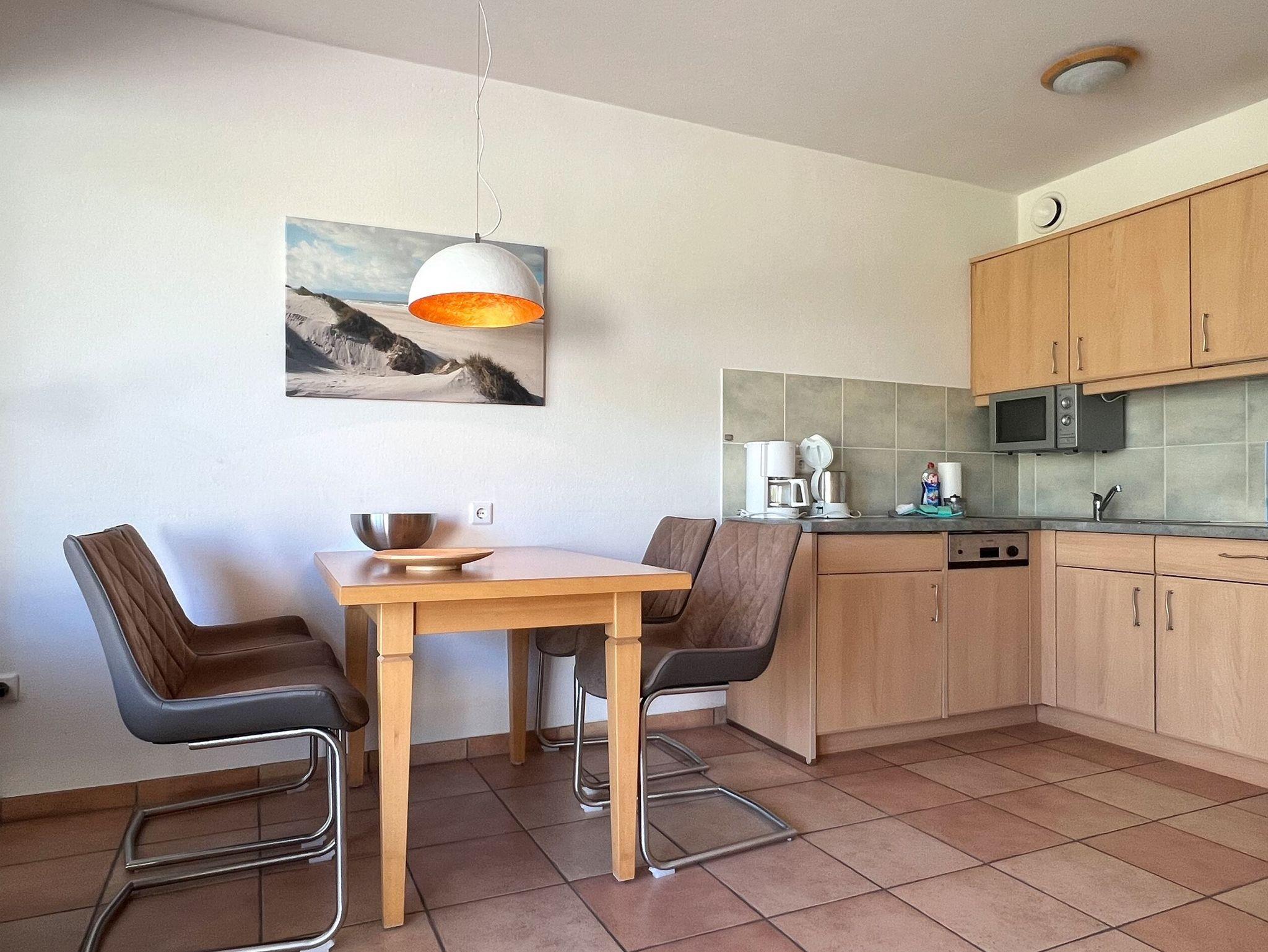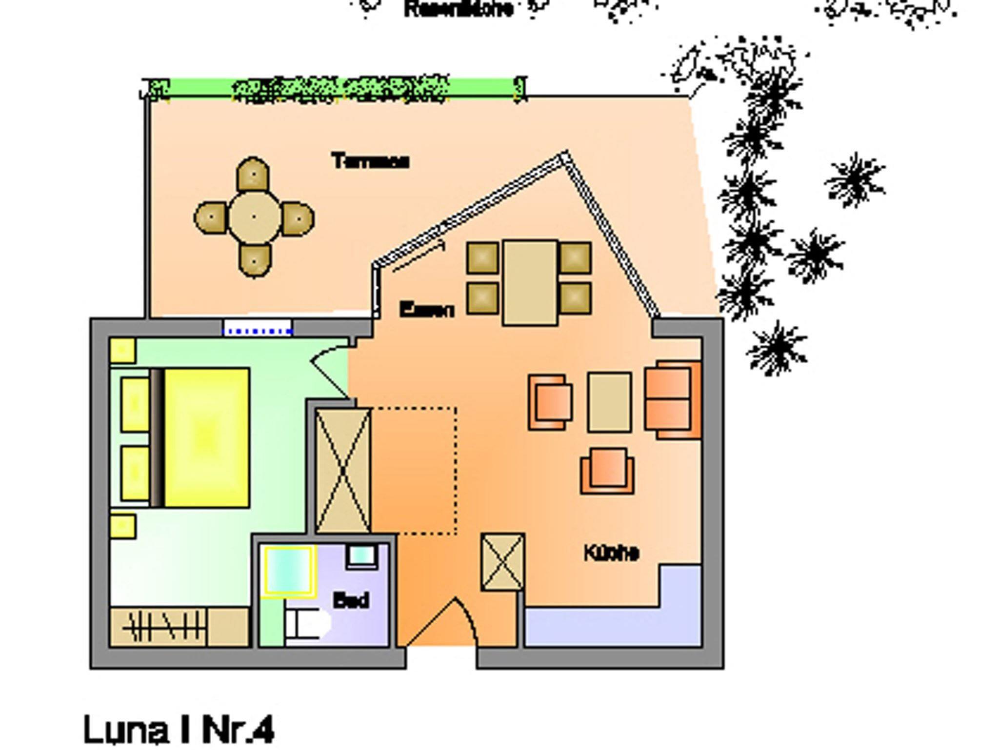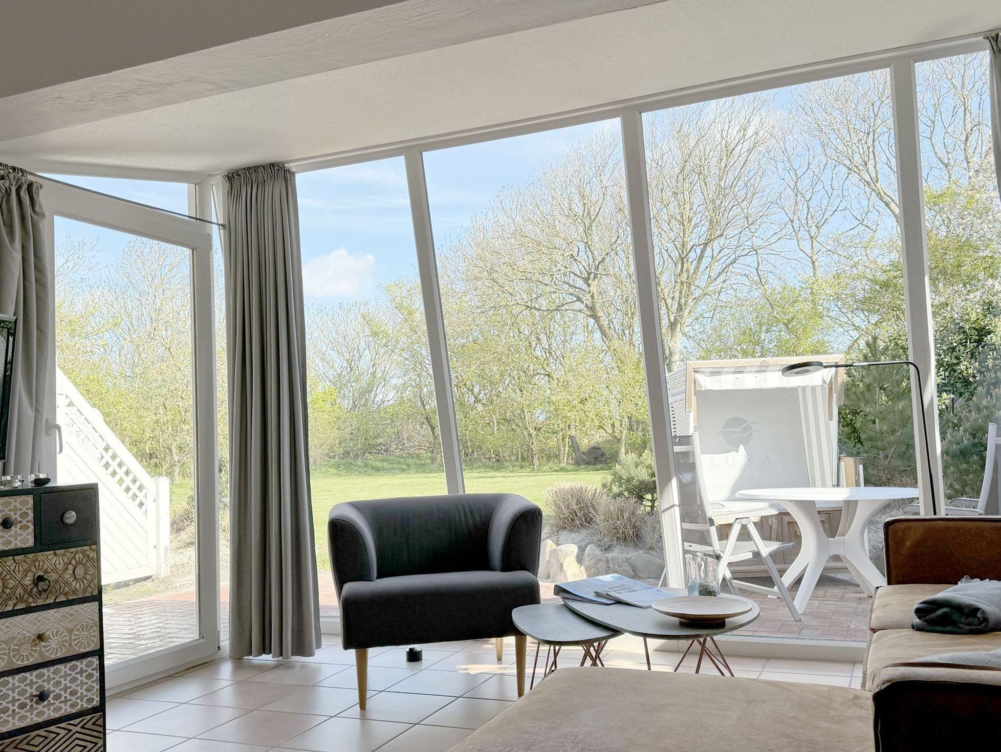 Die Wohnung 4 in der Anlage Luna I liegt im Erdgeschoss des Hauses. Sie ist 55qm groß und geeignet für bis zu 4 Personen. Der Eingangsbereich ist mit einer Garderobe ausgestattet. Das Schlafzimmer verfügt über ein Doppelbett (180x200cm, getrennte Matratzen). Weitere Personen können ein Schrankbett (180x200cm, Matratze nicht durchgehend) im Wohnbereich nutzen. Im Weiteren ist ein Duschbad mit Waschbecken und WC vorhanden. Der Wohn-und Essraum verfügt über eine offene integrierte Einbauküche, einen Esstisch und Sitzbereich mit Fernseher. W-Lan steht kostenlos zur Verfügung. Die Einrichtung ist modern und hochwertig. Der vorgelagerte Wintergarten sorgt für eine angenehme Helligkeit und ermöglicht einen Blick in die wunderschöne Grünanlage. Vom Wohnbereich aus gelangen Sie ebenerdig auf die südlich ausgerichtete Terrasse, die mit Gartenmöbeln und einem Strandkorb ausgestattet ist. Von hier aus blicken Sie in den Garten und auf die alten Obstbäume.