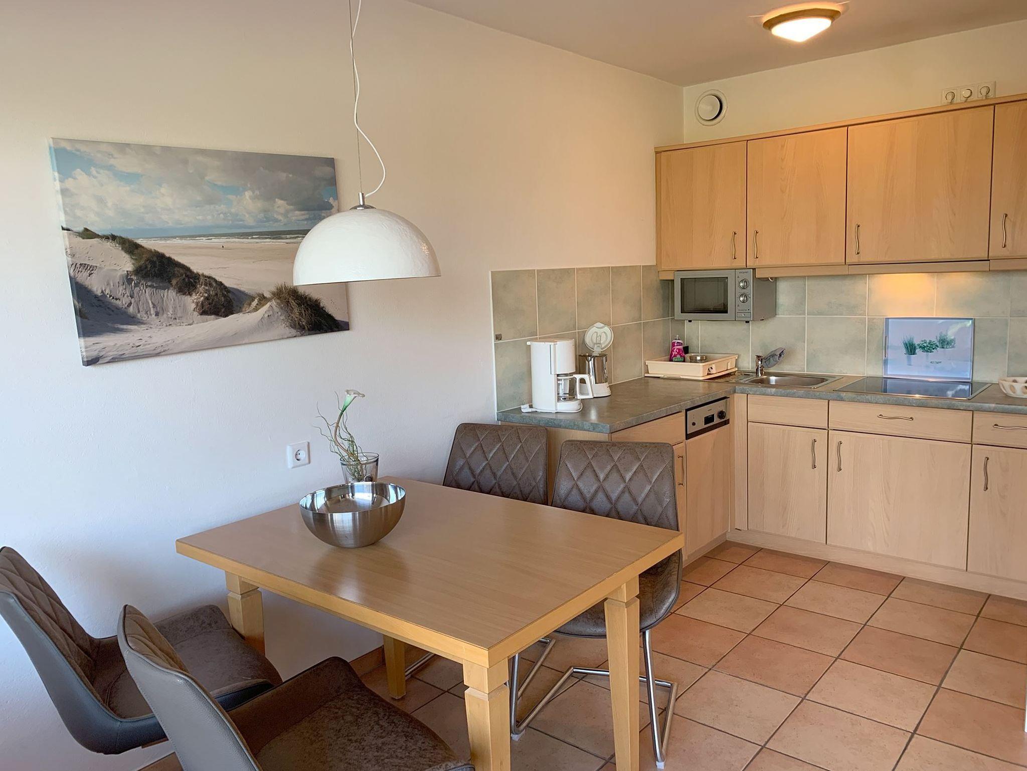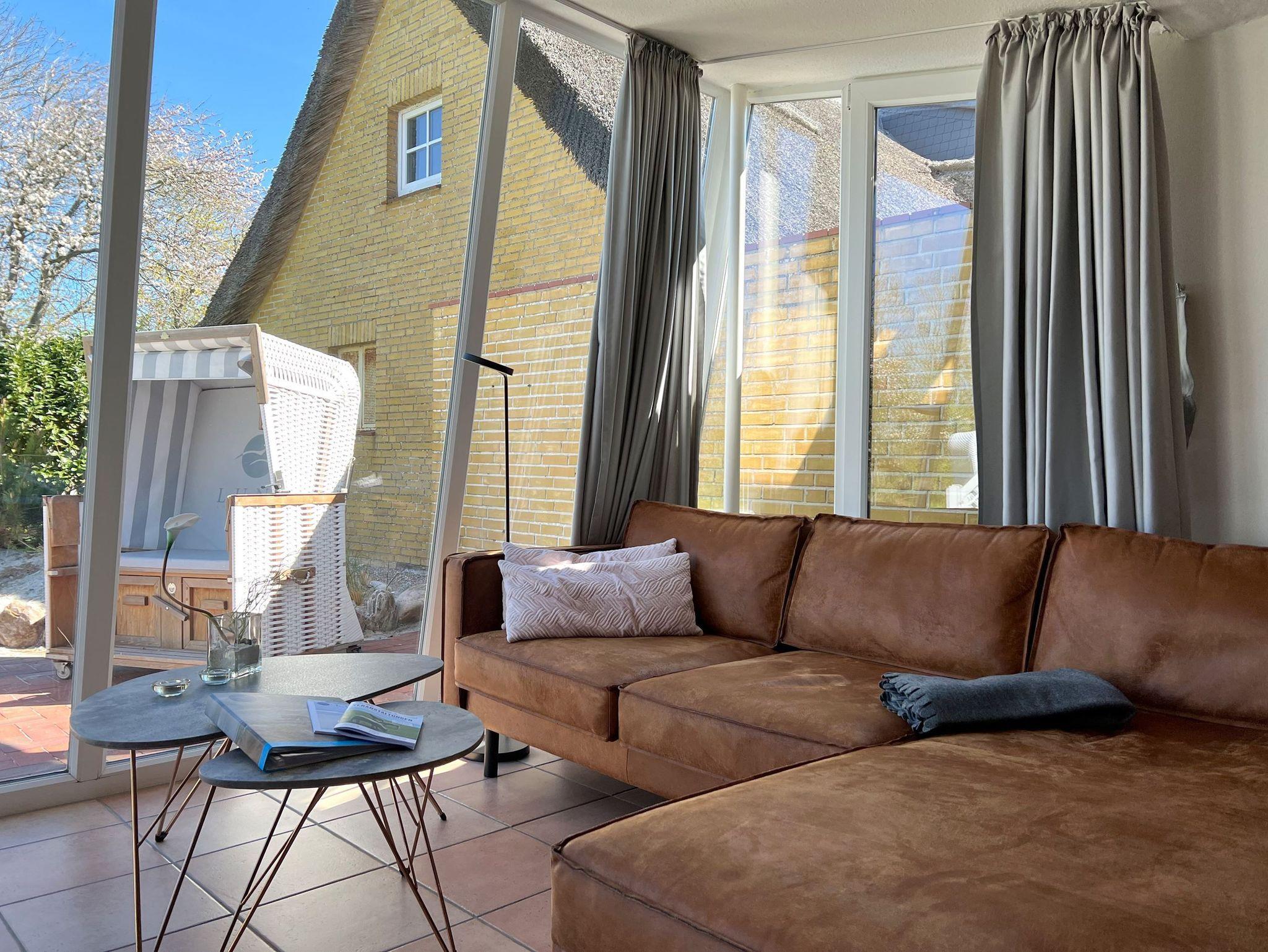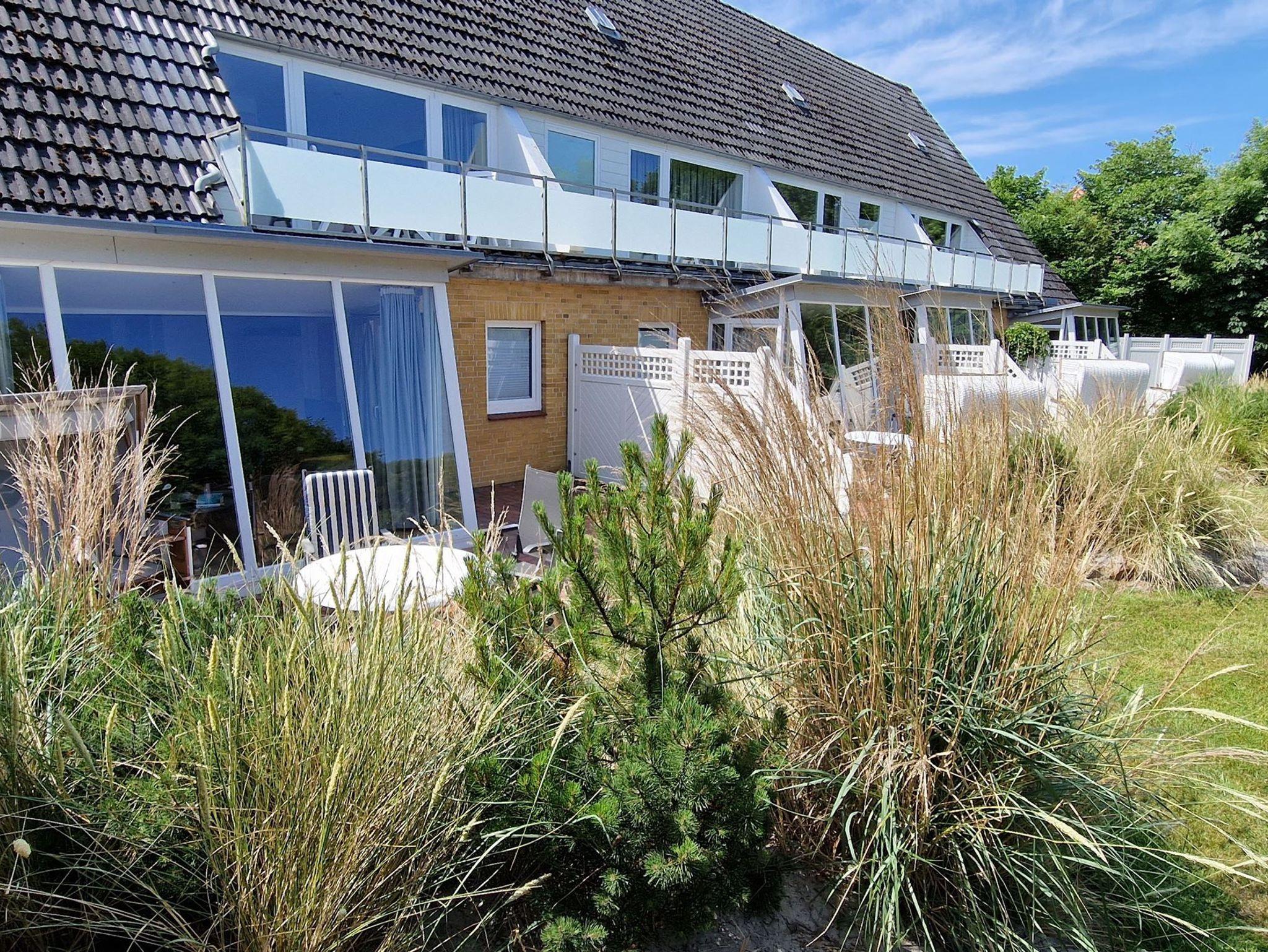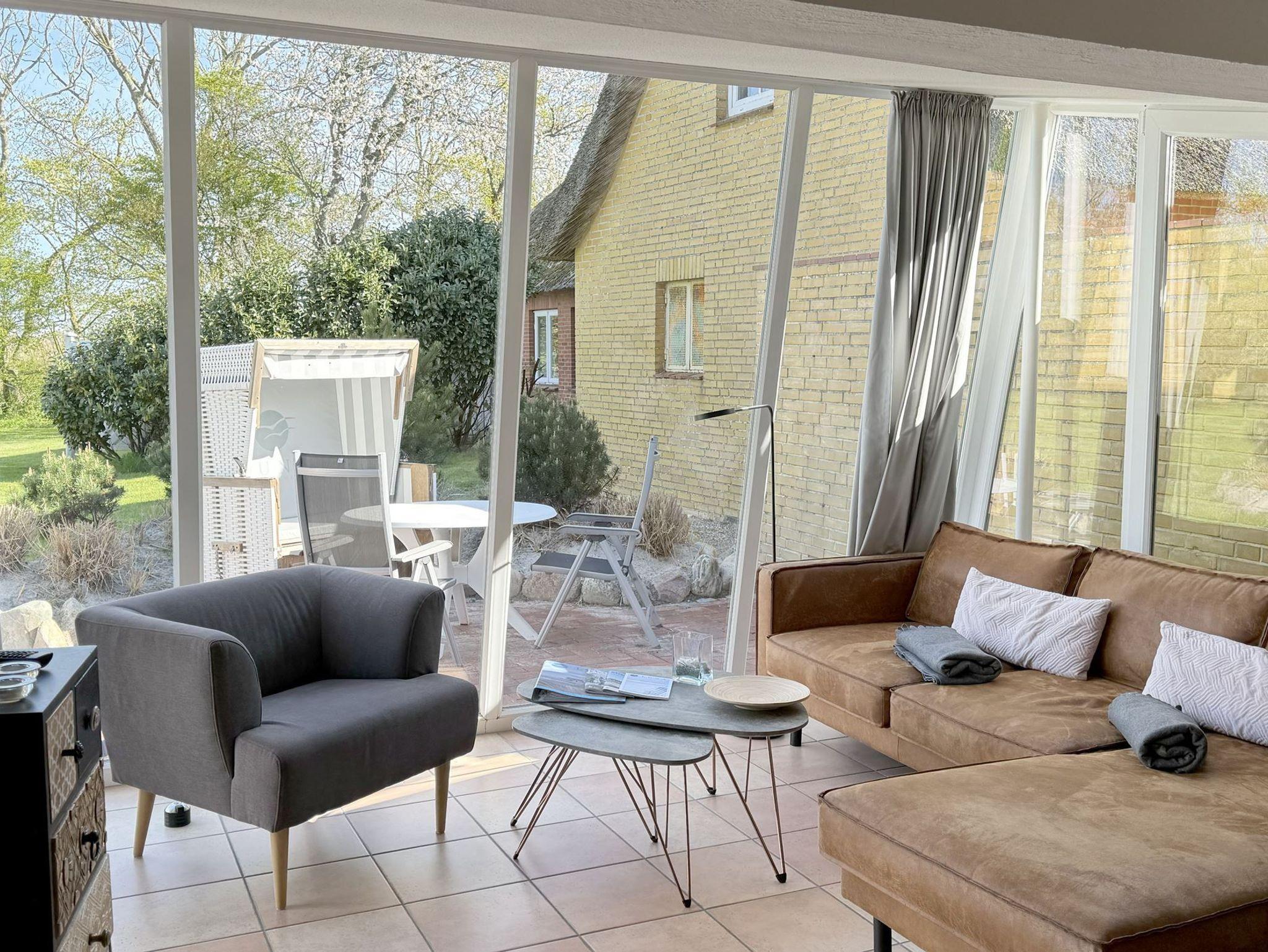 Die Wohnung 4 in der Anlage Luna I liegt im Erdgeschoss des Hauses. Sie ist 55qm groß und geeignet für bis zu 4 Personen. Der Eingangsbereich ist mit einer Garderobe ausgestattet. Das Schlafzimmer verfügt über ein Doppelbett (180x200cm, getrennte Matratzen). Weitere Personen können ein Schrankbett (180x200cm, Matratze nicht durchgehend) im Wohnbereich nutzen. Im Weiteren ist ein Duschbad mit Waschbecken und WC vorhanden. Der Wohn-und Essraum verfügt über eine offene integrierte Einbauküche, einen Esstisch und Sitzbereich mit Fernseher. W-Lan steht kostenlos zur Verfügung. Die Einrichtung ist modern und hochwertig. Der vorgelagerte Wintergarten sorgt für eine angenehme Helligkeit und ermöglicht einen Blick in die wunderschöne Grünanlage. Vom Wohnbereich aus gelangen Sie ebenerdig auf die südlich ausgerichtete Terrasse, die mit Gartenmöbeln und einem Strandkorb ausgestattet ist. Von hier aus blicken Sie in den Garten und auf die alten Obstbäume.
