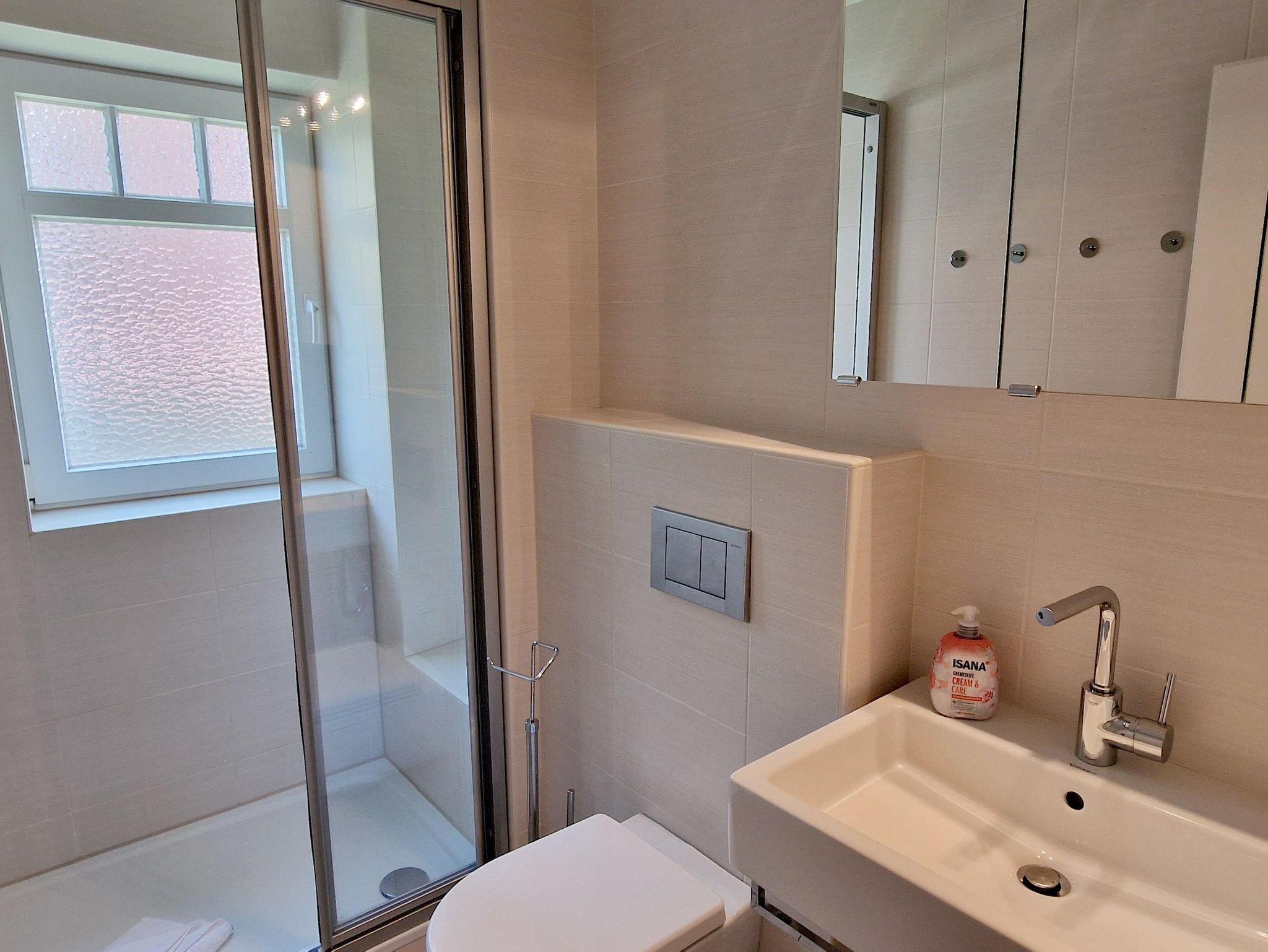 Bad: Dusche, Waschbecken, WC, Spiegelschrank, Hocker, Duschkabine
