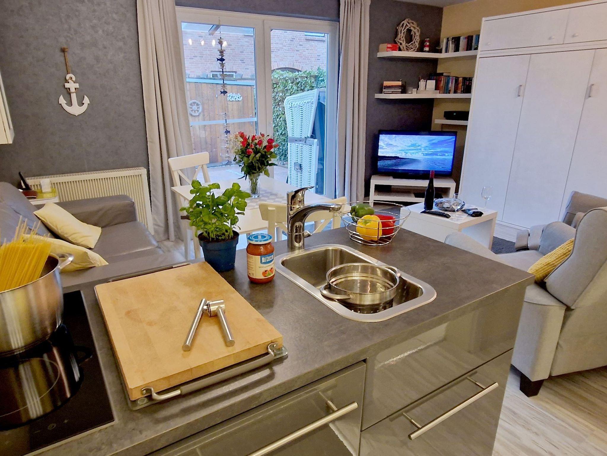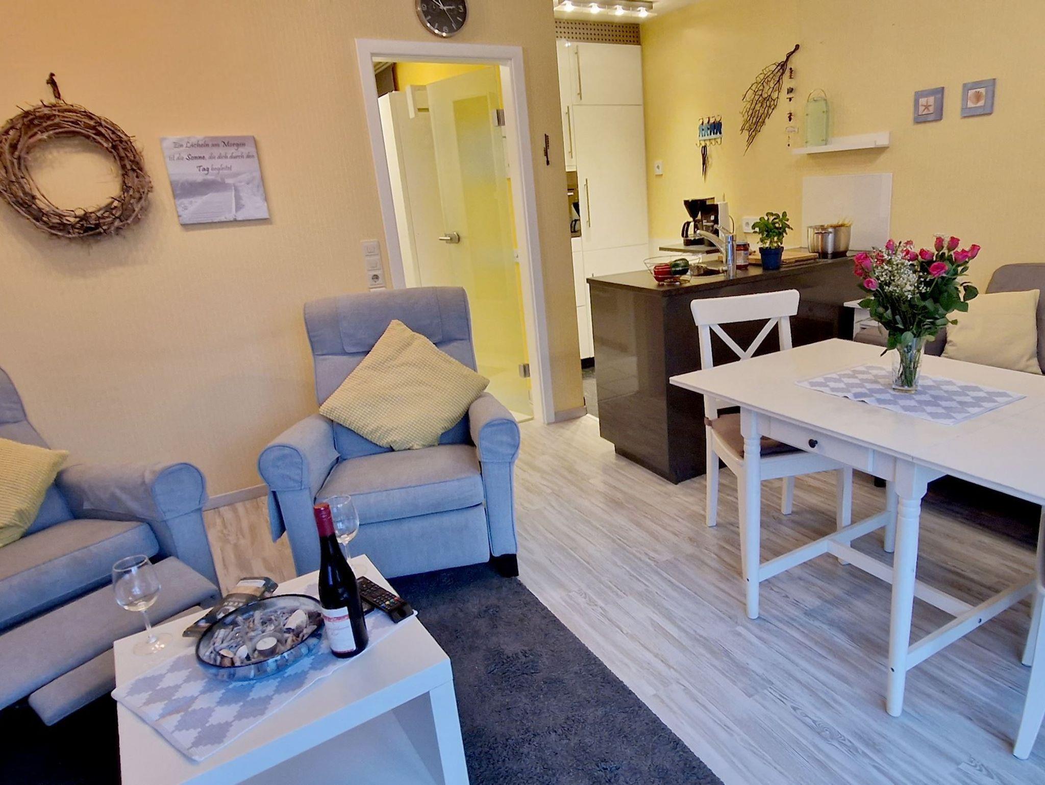 Schwalbennest 03 Moderne Wohnung in St. Peter Dorf mit großzügiger Sonnenterrasse ! In zweiter Baureihe können Sie die Ruhe genießen und befinden sich dennoch zentral im Ortseil Dorf. Das gemütliche Wohnzimmer mit integrierter Küchenzeile und Essecke hat einen direkten Zugang zur großzügigen Sonnenterrasse ( Westen ) mit Strandkorb & Grillkamin. Ein Duschbad mit bodengleicher Dusche und ein Schlafzimmer mit Doppelbett runden das Wohlfühlgefühl ab. Zudem gibt es hier im Wohnzimmer ein Schrankdoppelbett, wo zwei weitere Personen ihren Schlafplatz finden. W-Lan inkl. Parkplatz auf dem Grundstück.