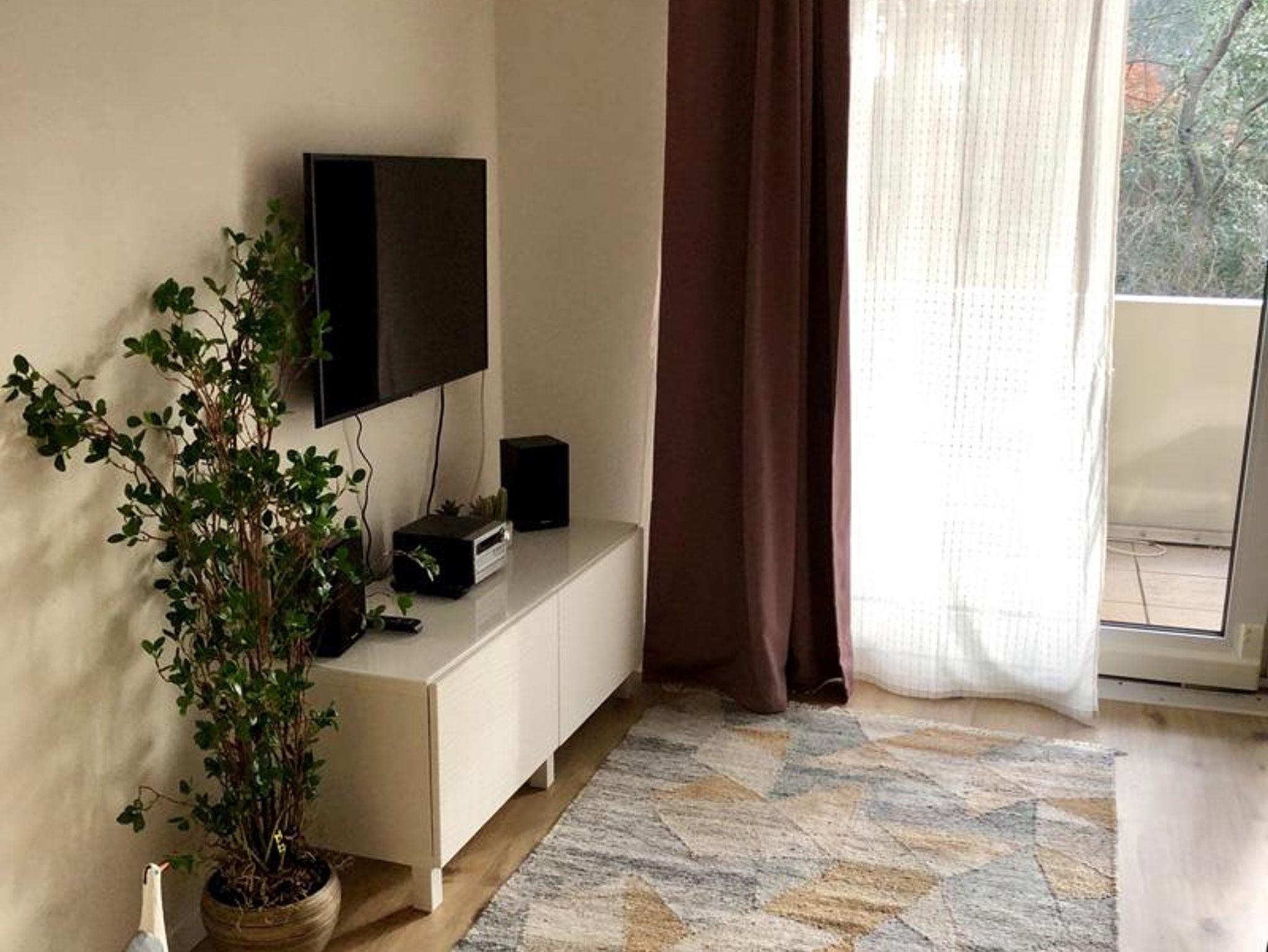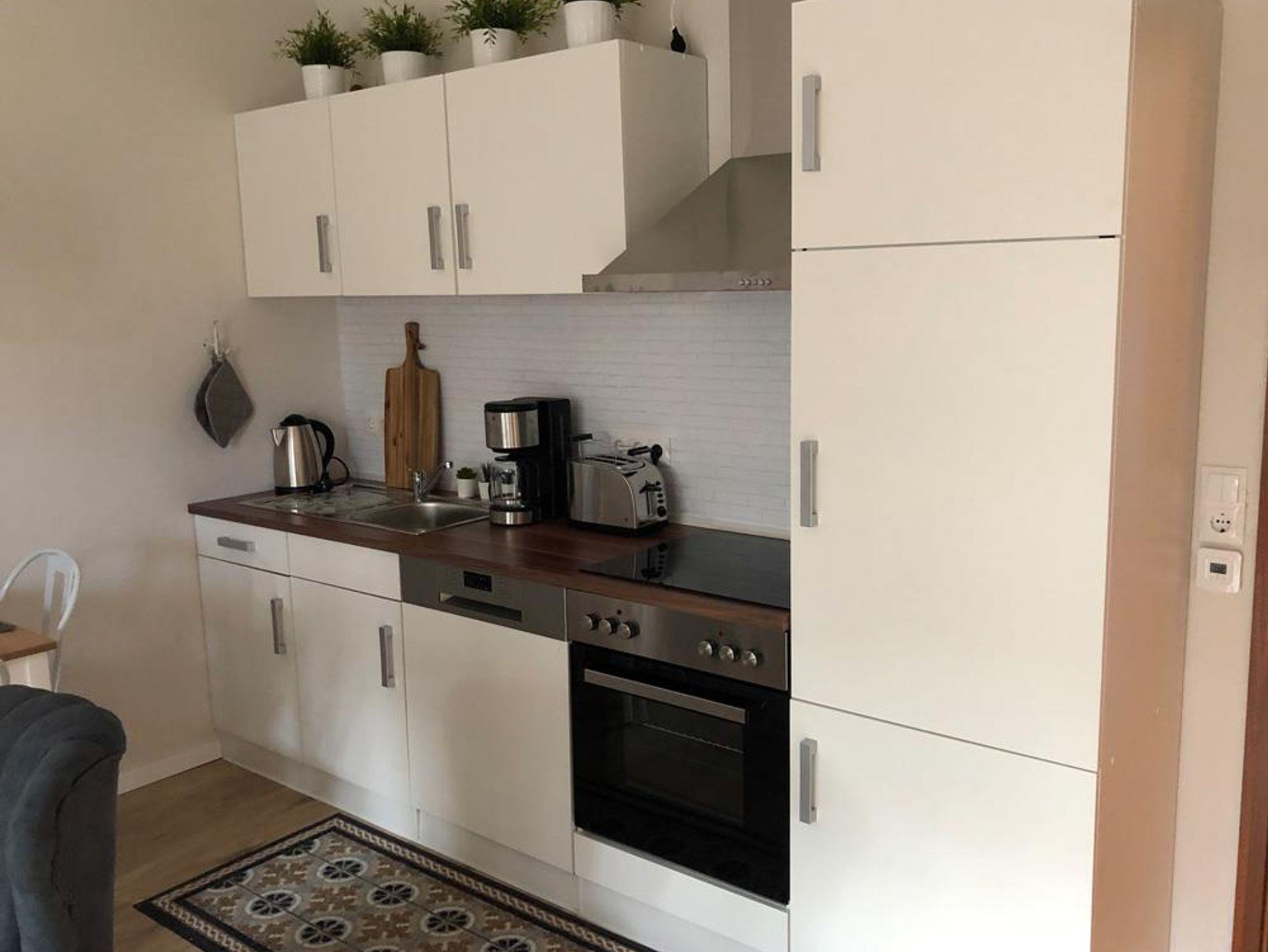 Wohnzimmer: Schlafcouch, Couchtisch, 1 Sessel, Stehlampe, Sideboard, Sat-TV mit Smart-TV, Stereoanlage, DVD-Player, Esstisch, 3 Stühle, Küchenzeile, 4 Plattenherd mit Ceranfeld und Backofen, Dunstabzugshaube, Kühlschrank, Spülmaschine, Kaffeemaschine, Wasserkocher, Toaster, Geschirr, Kochtöpfe