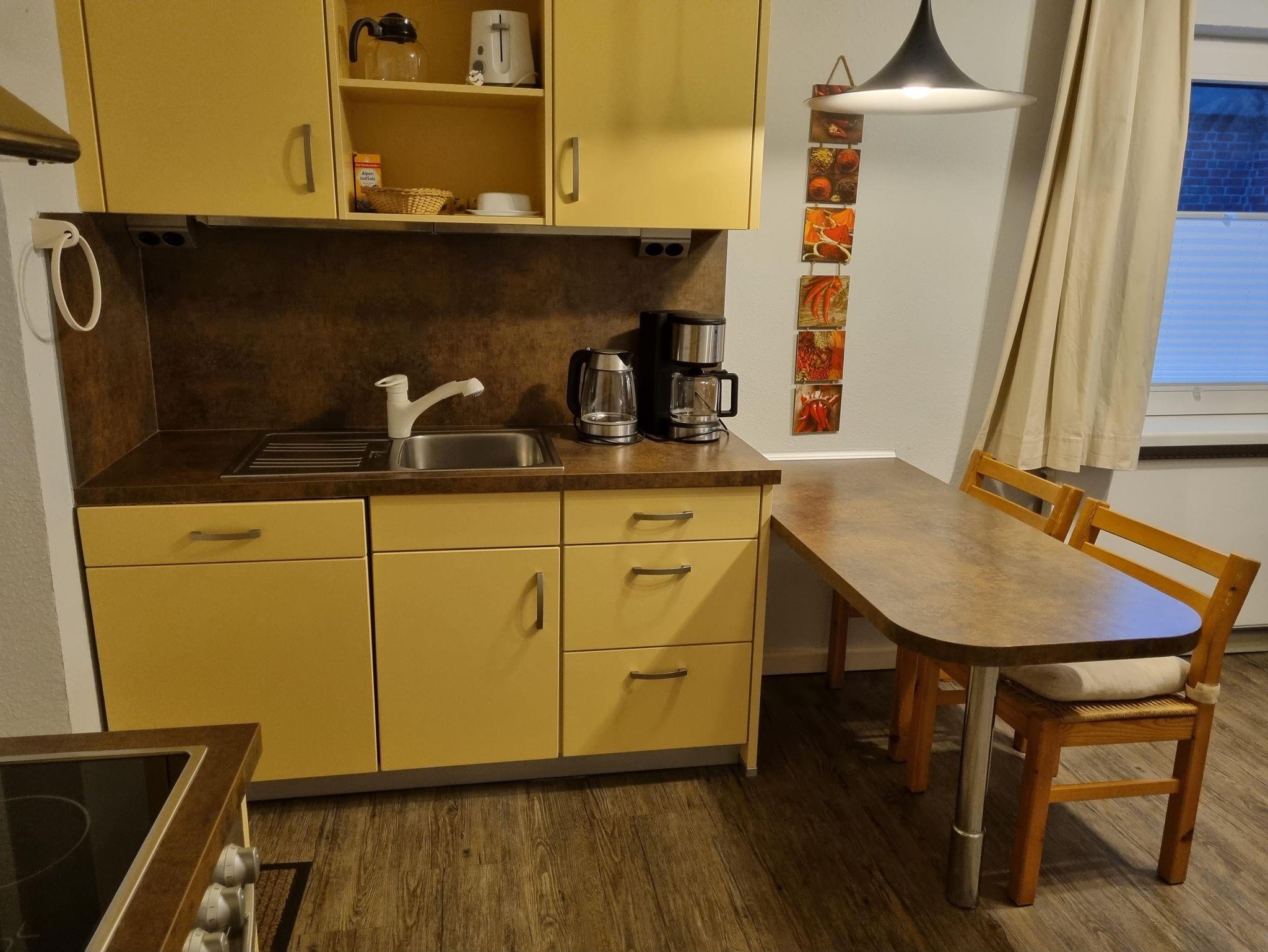 Ein vollständig eingerichteter Küchenbereich mit Essplatz lädt zum ausgiebigen ausprobieren von norddeutschen Produkten ein.