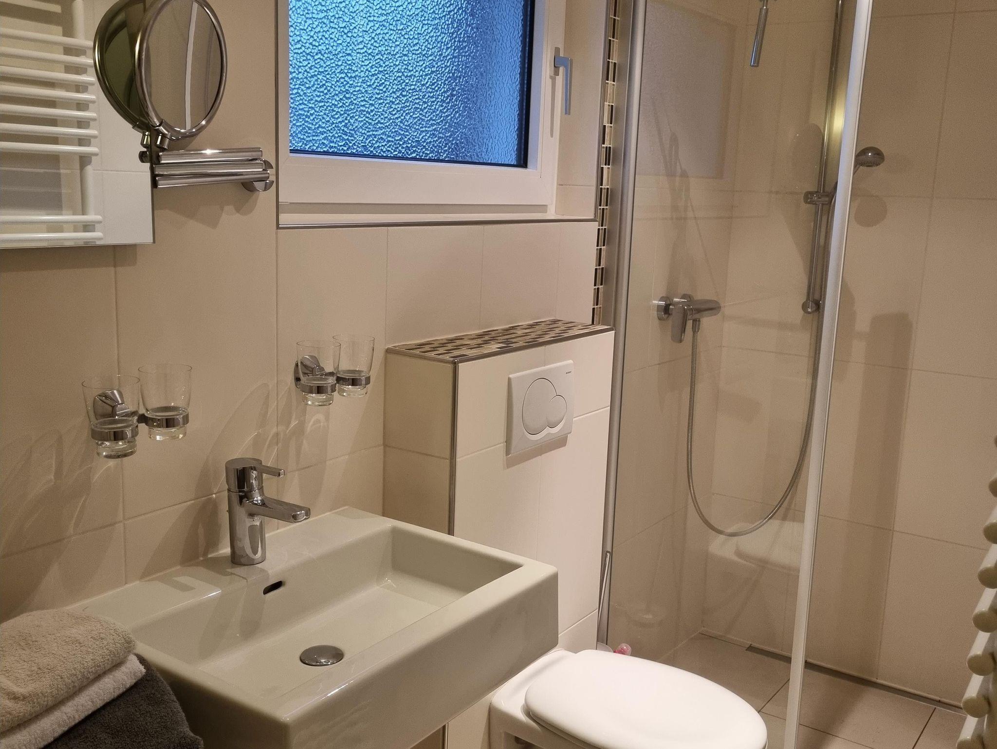 Das Bad bietet Platz für Ihre Utensilien und damit Sie im nordischen Klima keine kalten Füße bekommen, gibt es eine Fußbodenheizung. Der Duschbereich ist ohne Schwelle zu begehen.