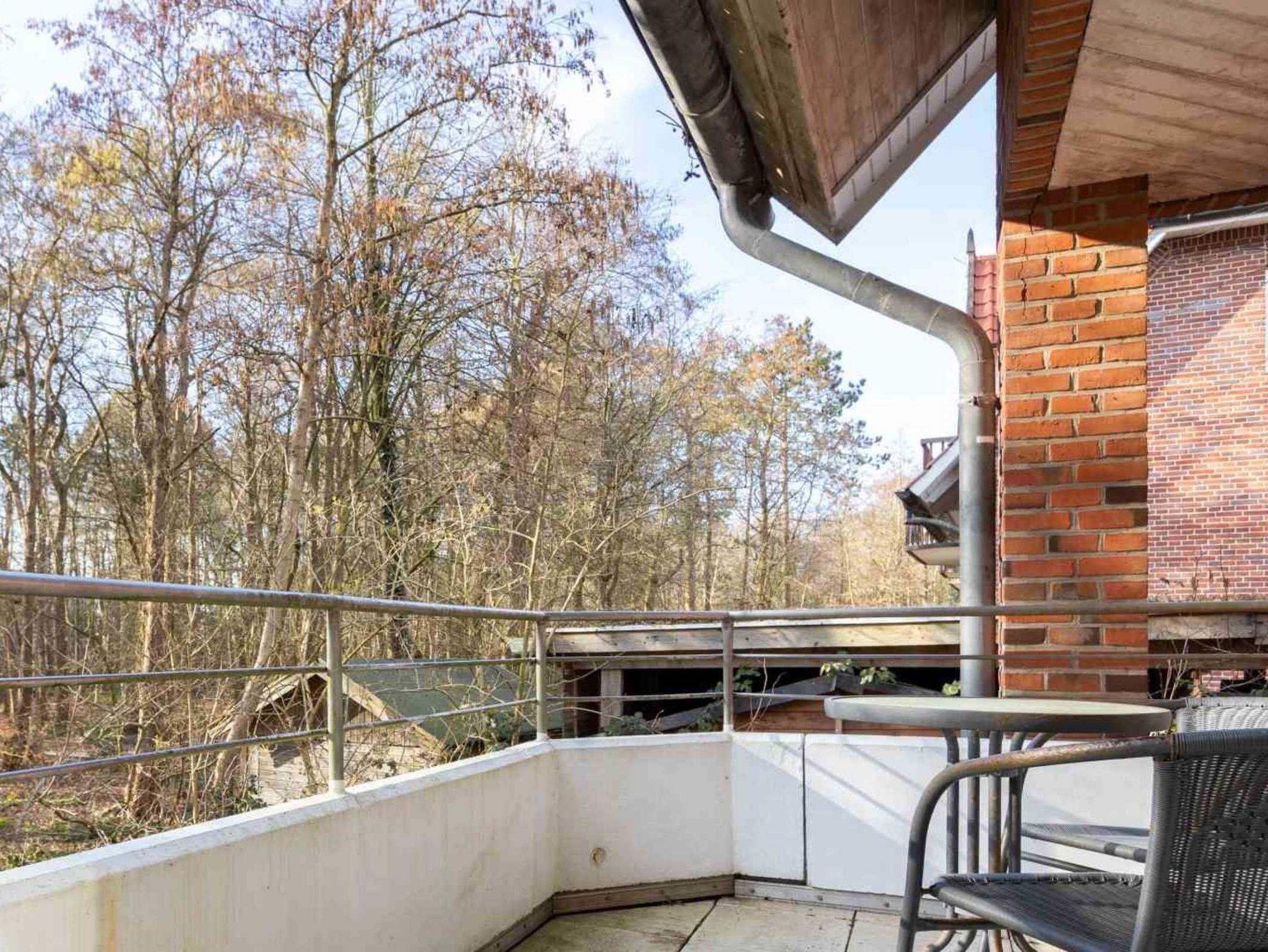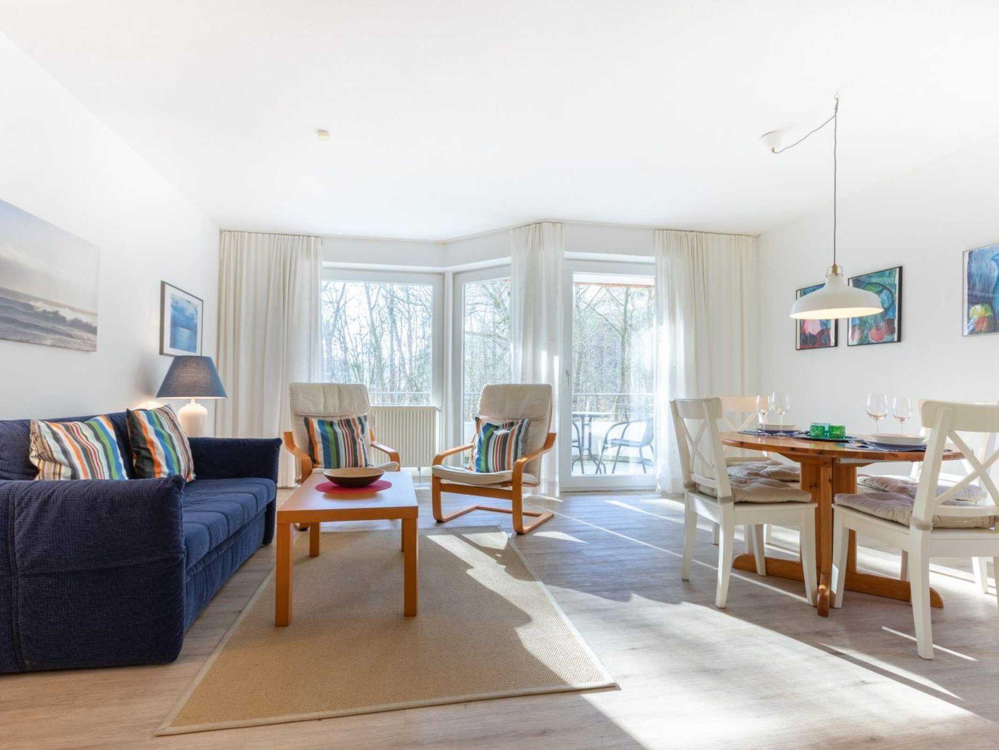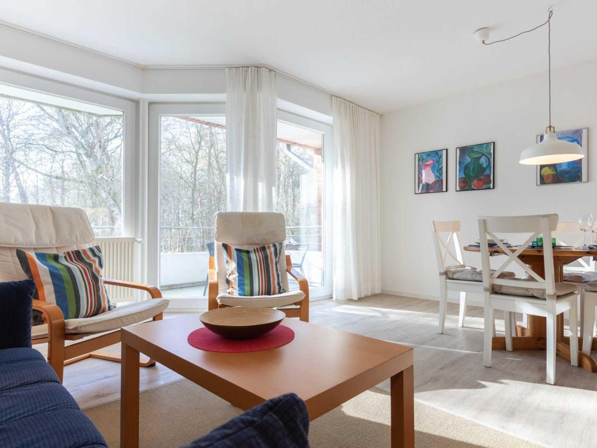 Wohnzimmer mit Sofa (2er), 2 Sesseln, TV (Kabel) und Esstisch mit 4 Stühlen. Direkter Zugang zum möblierten Balkon nach Süden mit Blick auf den Wald. Offene Küche mit Backofen und Kühlschrank mit Gefrierfach.