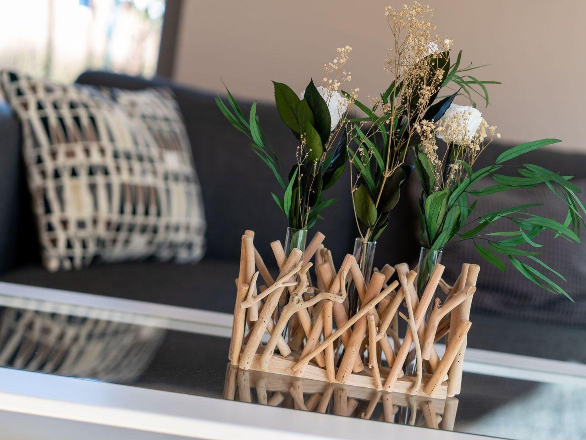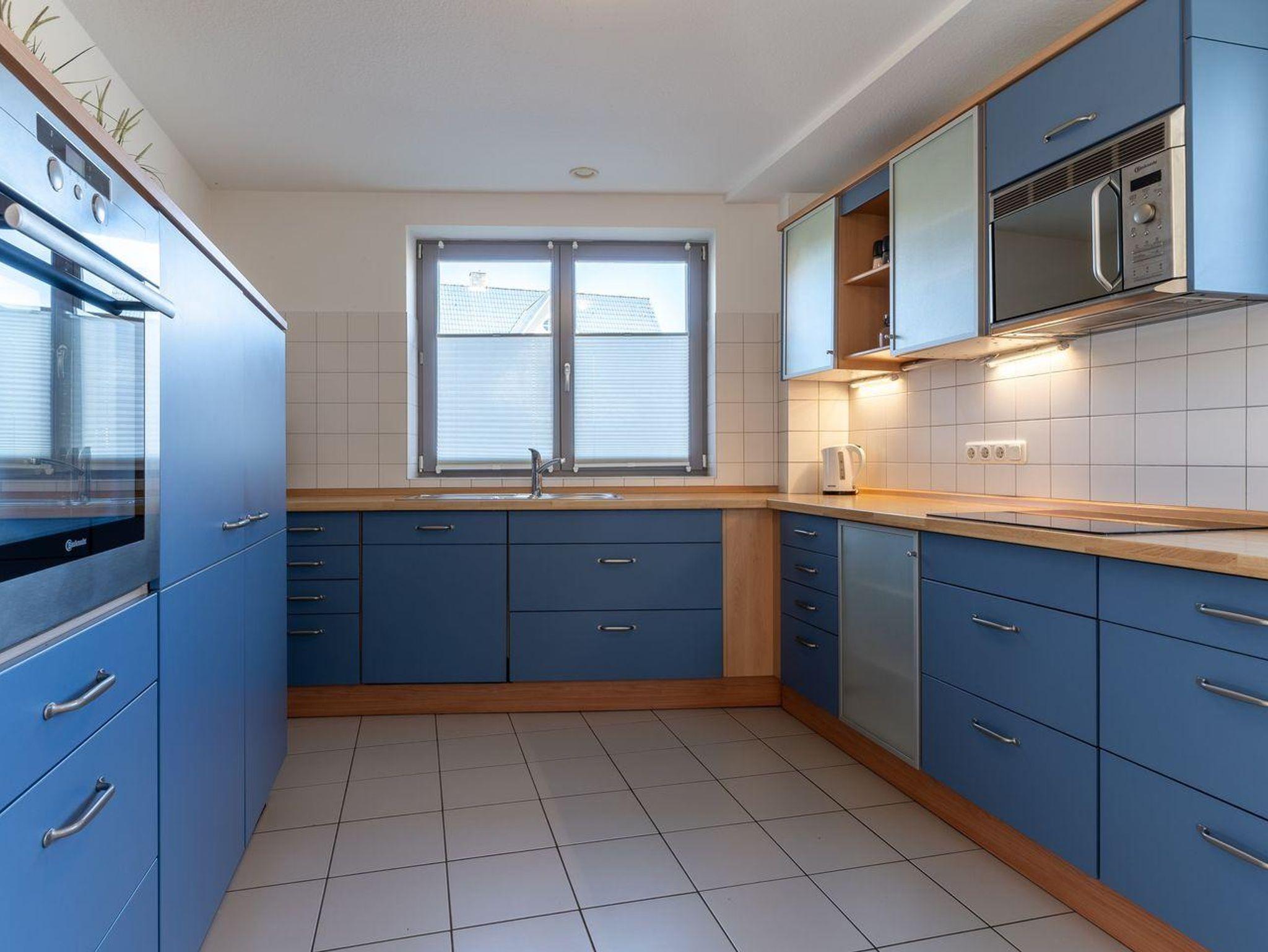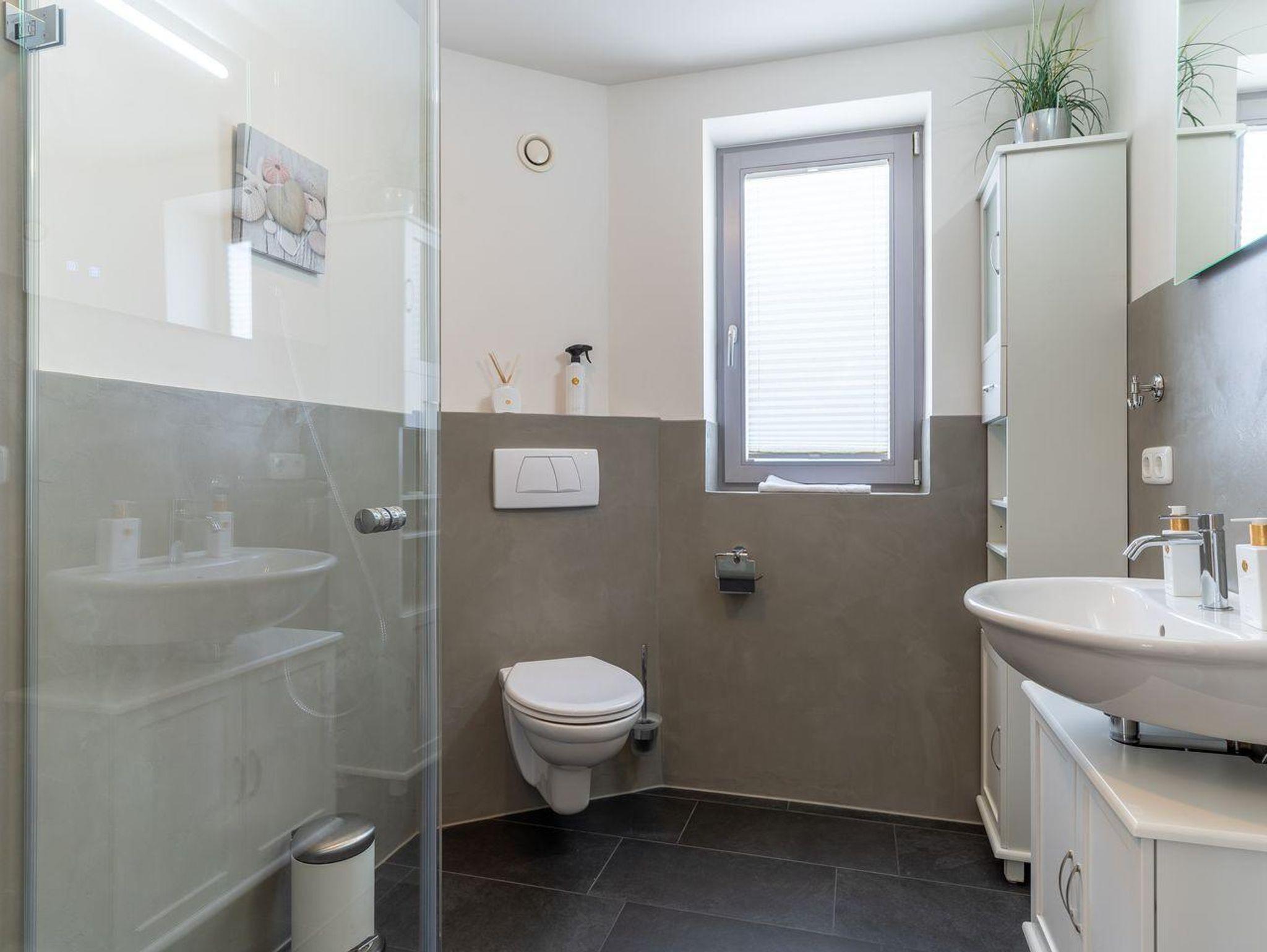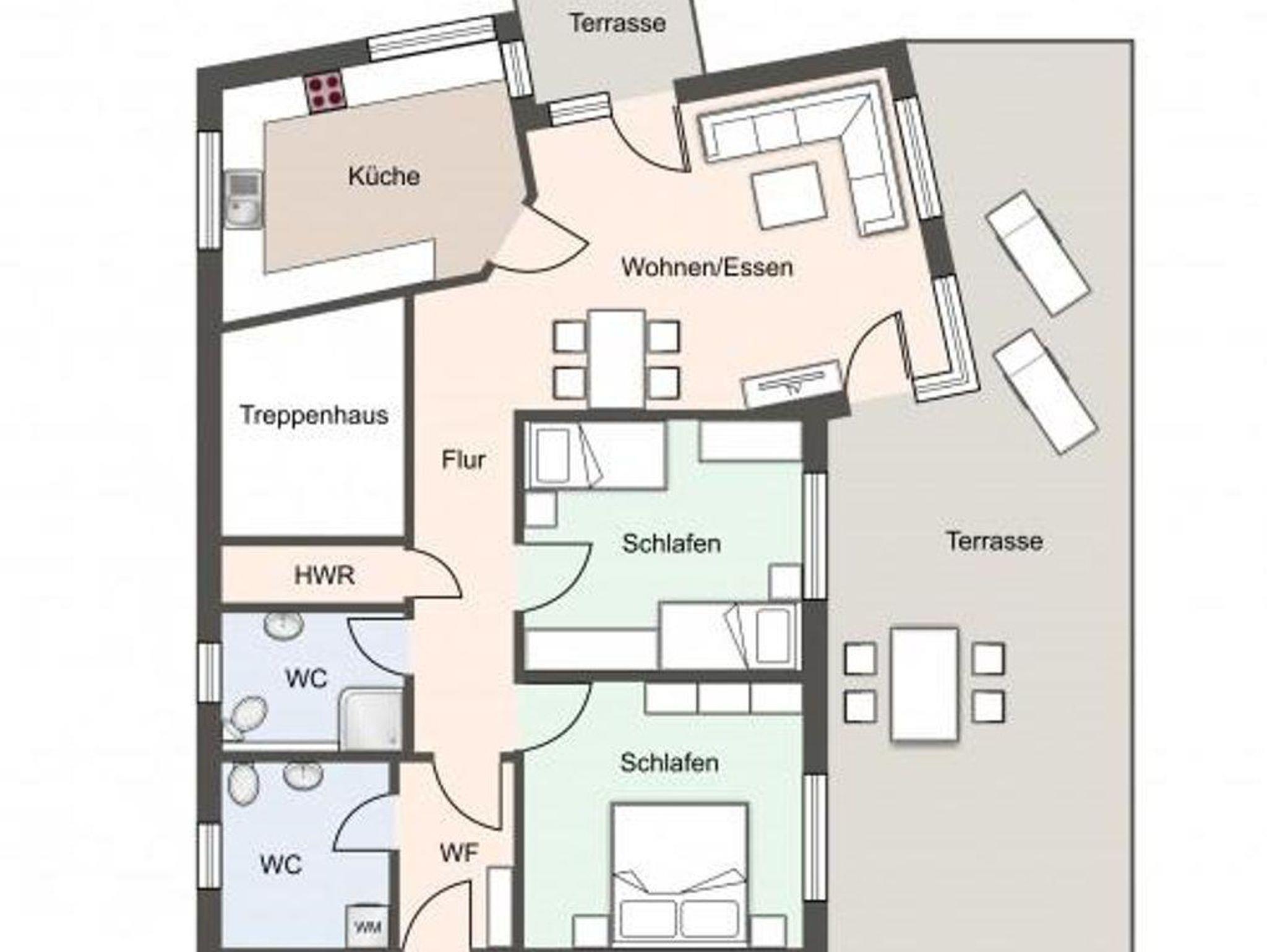 Im Erdgeschoss befindet sich der Wohnraum mit einer offenen Küche und einem gemütlichen Essbereich. Die Küche ist mit hochwertigen Geräten voll ausgestattet. Vom Flur aus gelangen sie in die beiden Schlafzimmer. Eines mit einem 180er Doppelbett und das Anderes mit 2x 90er Einzelbetten. Beide Schlafzimmer haben große Fenster und Zugang zur Terrasse. Der Flur mit eingebauter Garderobe bietet genügend Platz für Ihre Utensilien. Ein Duschbad mit WC und das weitere Gäste-WC bieten jeden Komfort.