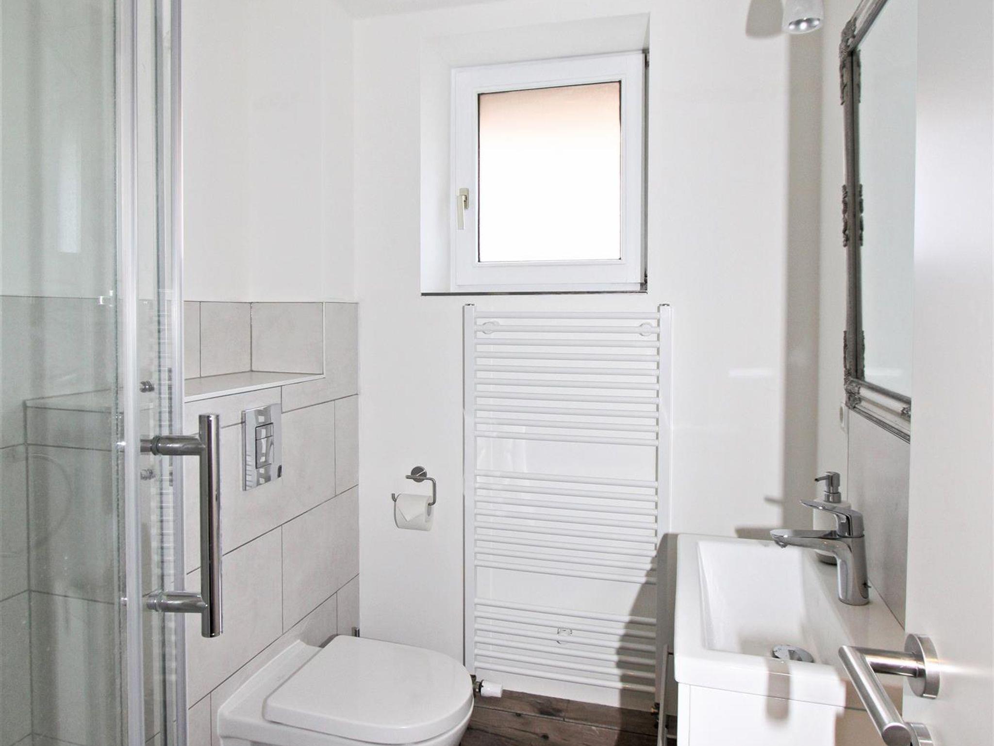Auch das 2021 vollständig modernisierte Duschbad besticht durch seinen individuellen Charme.