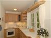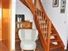 Wohnzimmer: Couch, Couchtisch, 2 Sessel, Stehlampe, 2 Tischlampen, Sekretär, Regal, TV-Rollregal, Kabel-TV, Stereoanlage mit CD-Player, Nachtspeicherofen, Treppe nach oben, Esstisch, 4 Stühle, Einbauküche, 4 Plattenherd mit Ceranfeld und Backofen, Dunstabzugshaube, Kühlschrank, Spümaschine, Kaffeemaschine, Wasserkocher, Toaster, Geschirr, Kochtöpfe