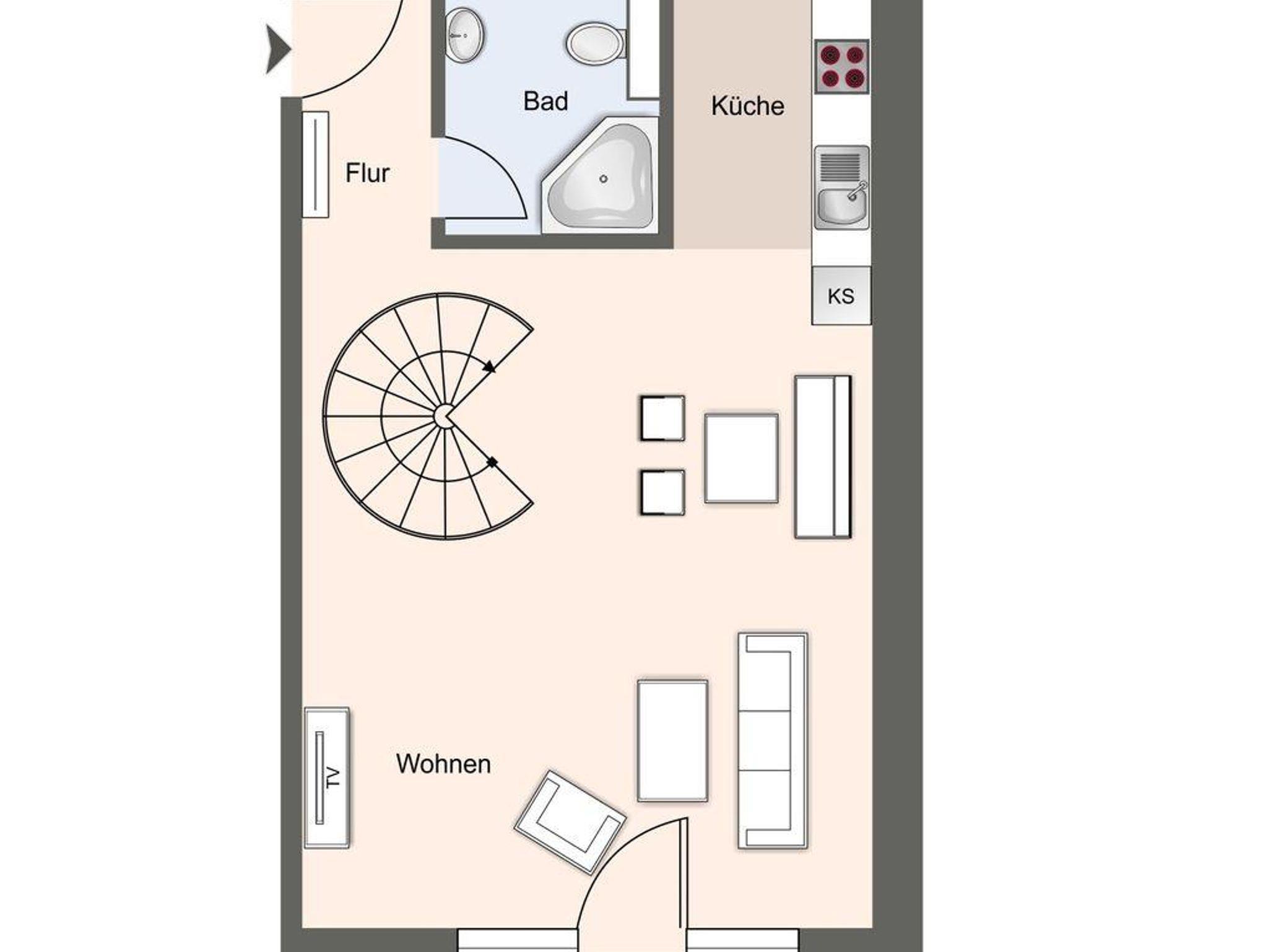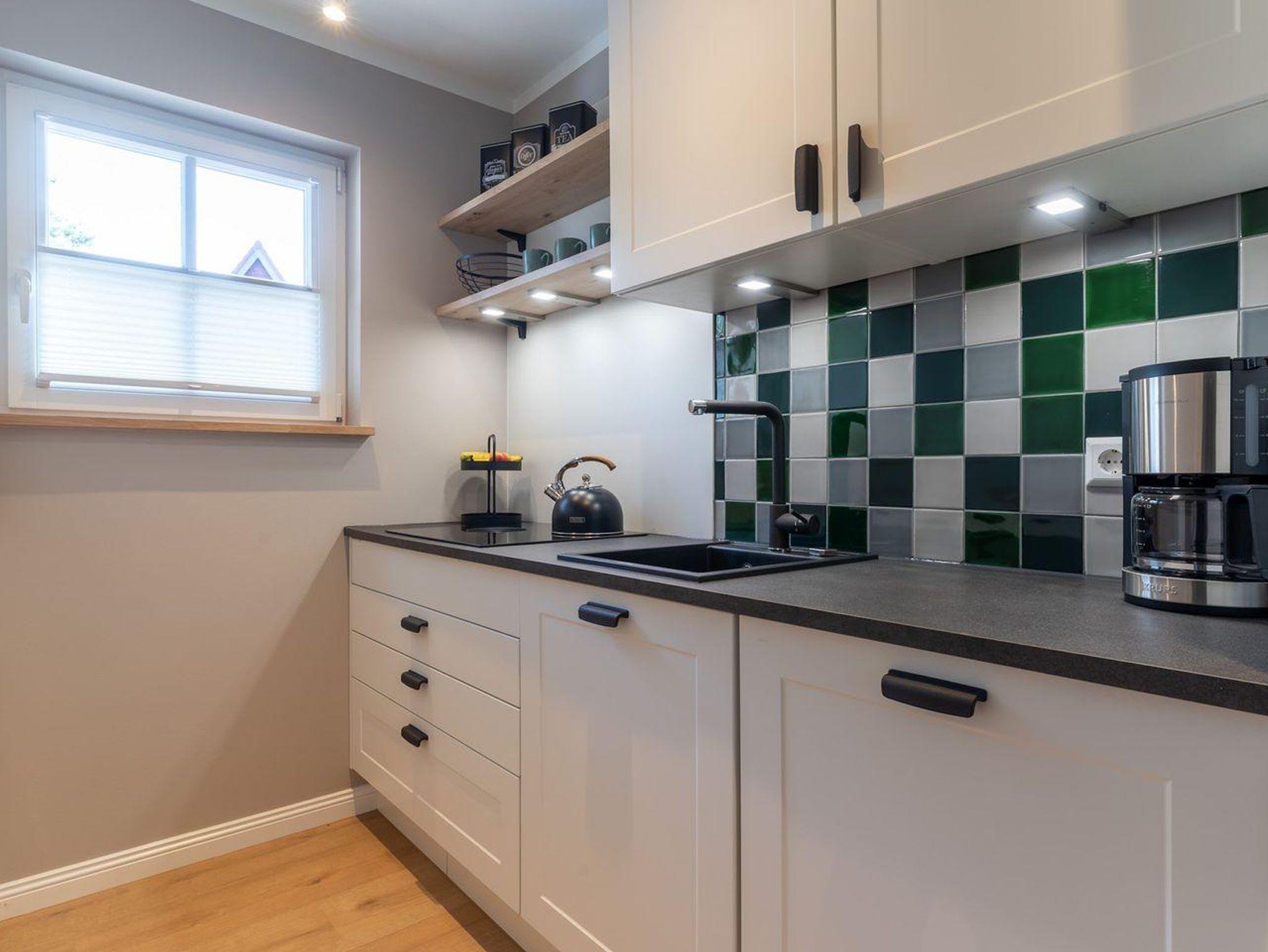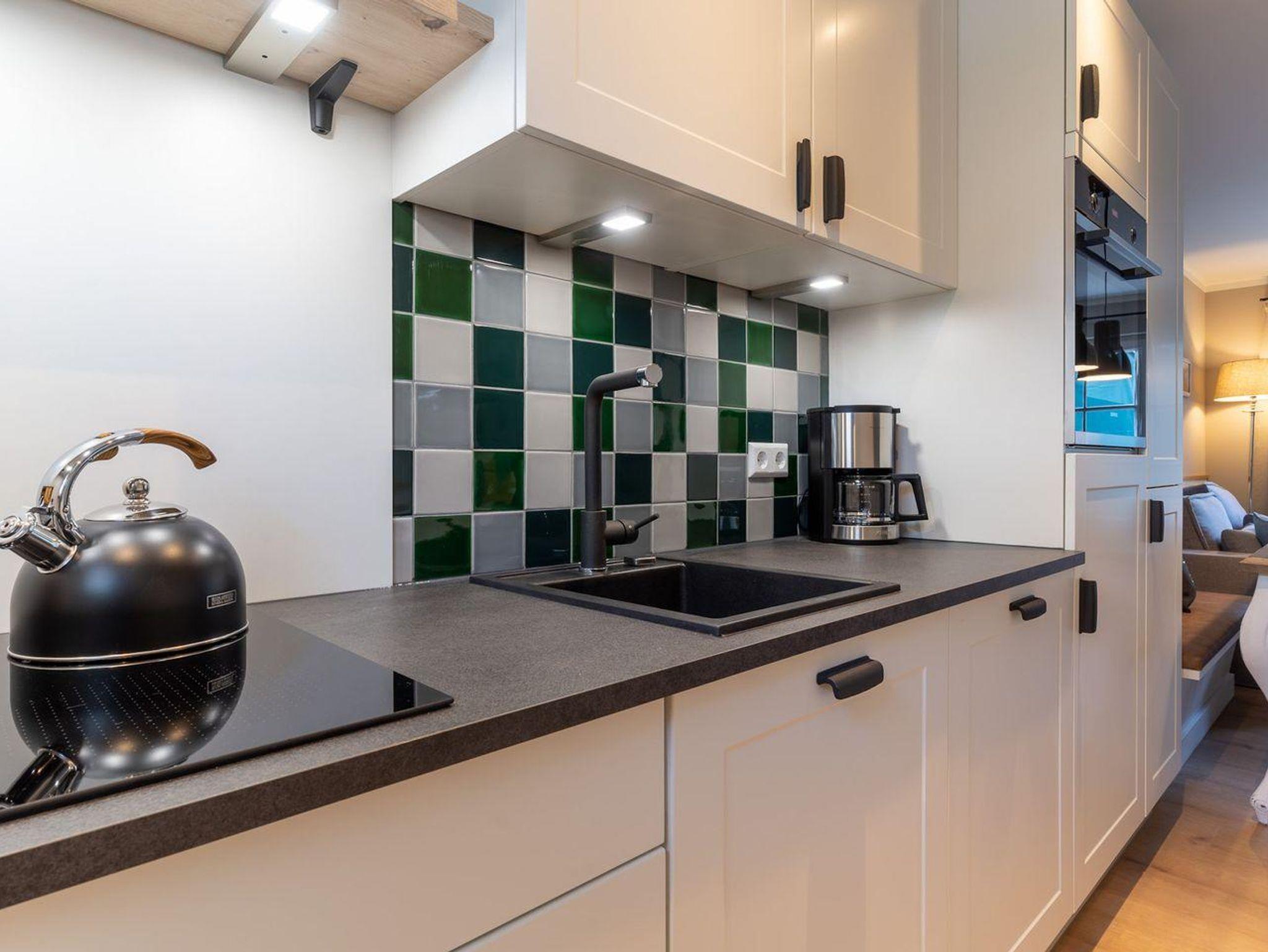 Im Erdgeschoss befindet sich ein großzügiger Wohnraum mit TV und einer modernen Wohnküche. Die Küche ist voll ausgestattet und verfügt über hochwertige Elektrogeräte.